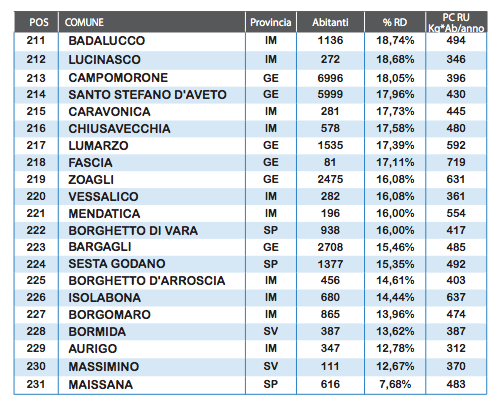 Confermati dall’anno precedente nella provincia di Savona, troviamo Giustenice, come miglior comune ligure (con l’82,06% di differenziata), Tovo San Giacomo è nono con un 73,68%; Pietra Ligure, paese costiero che subisce una forte antropizzazione estiva, è venticinquesimo con quasi il 66,7% e Magliolo, pur non rientrando nella classifica dei ricicloni, ottiene il 60,39% di differenziata aumentandola in un solo anno del 40%.