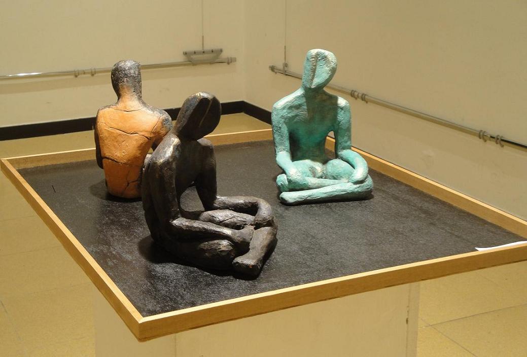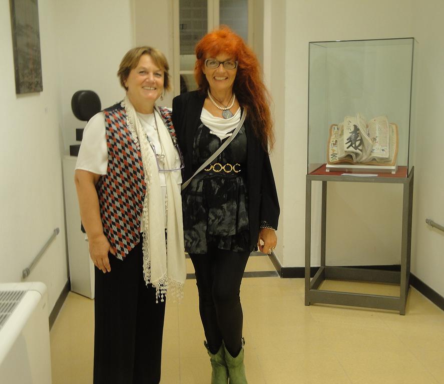 Tra le sculture, l’intrigante installazione di sottili ed evocativi personaggi in terra cotta, fluttuanti in tubi di plexiglass, che rientra a far parte della serie “arcaico-contemporaneo” dell’eclettica artista e una serie di “3 scriba” (soggetto caro all’artista) che ben si integrano nel contesto della biblioteca. In bella mostra di se, e sempre molto apprezzato dai visitatori, nuovamente il “LibroKronoSS” scultura realizzata da Sossi per la biblioteca nel 2010.