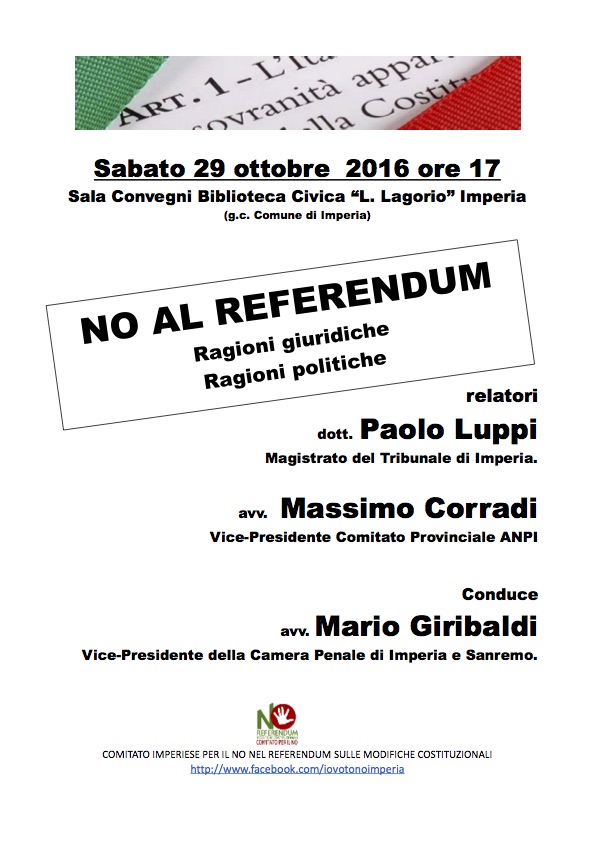 Sabato 29 settembre, alle ore 17, presso la Biblioteca Civica L. Lagorio di Imperia, si terrà infatti un incontro con il dottor Paolo Luppi e l’avvocato Massimo Corradi, per discutere in merito alle ragione del “NO” da un punto di vista politico e giurisdizionale. A condurre l’incontro ci sarà Mario Giribaldi, presidente del Comitato e vice-presidente della Camera Penale di Imperia e Sanremo.