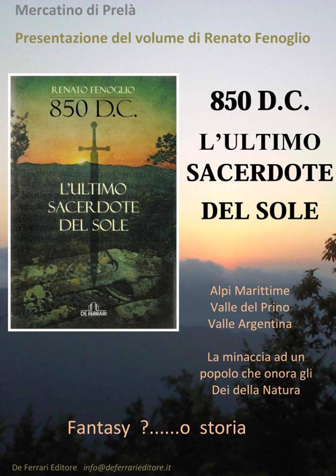 Alle 16 lo scrittore Renato Fenoglio presenterà il suo ultimo libro dal titolo “ANNO 850 – L’ULTIMO SACERDOTE DEL SOLE! Si tratta un romanzo parte fantasy e parte storico, con riferimenti a toponimi, rinvenimenti archeologici e tradizioni locali.