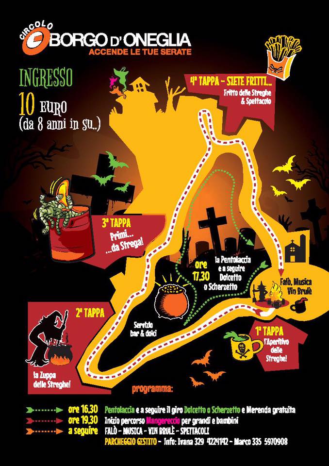 Borgo d’Oneglia. A partire dalle 16,30, al grido “Dolcetto o scherzetto” i bambini potranno festeggiare la festa di Halloween nel borgo situato nell’immediato entroterra imperiese. Il circolo di Borgo d’oneglia ha organizzato un pomeriggio all’insegna del divertimento per i bimbi con la pentolaccia delle streghe e snack per tutti. A partire dalle 19,30, invece, è in programma un percorso gastronomico per i più grandi con aperitivo, zuppa, primi e fritti.