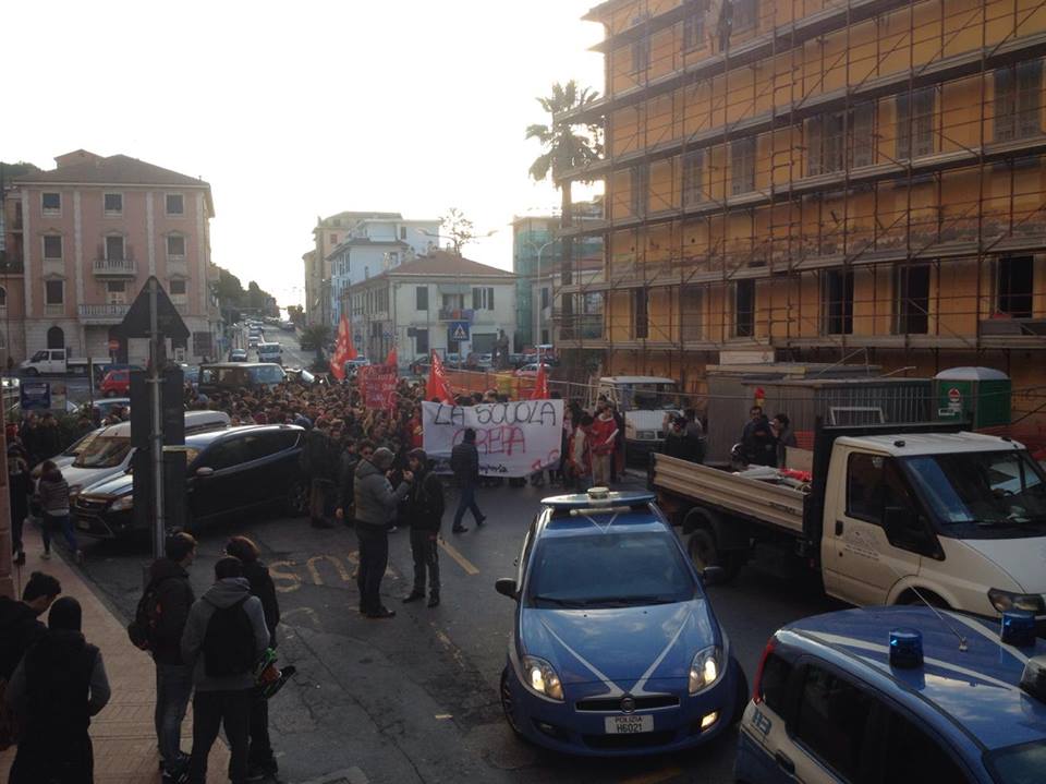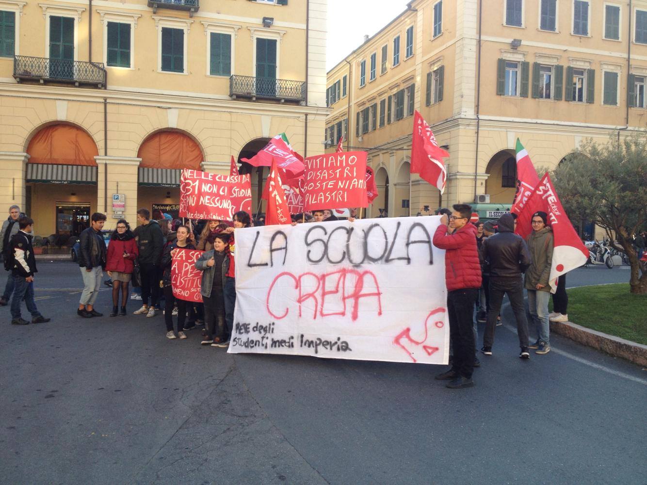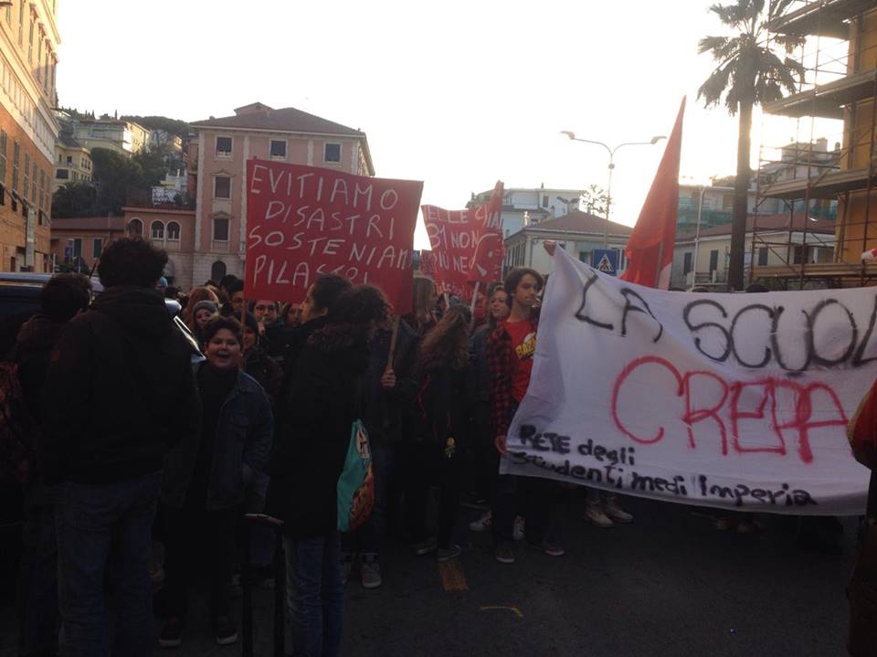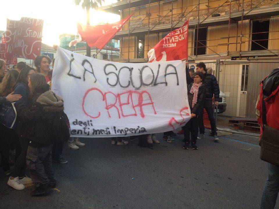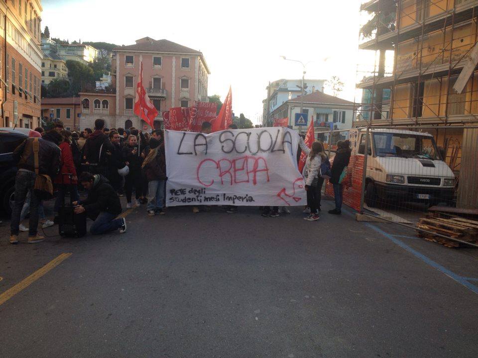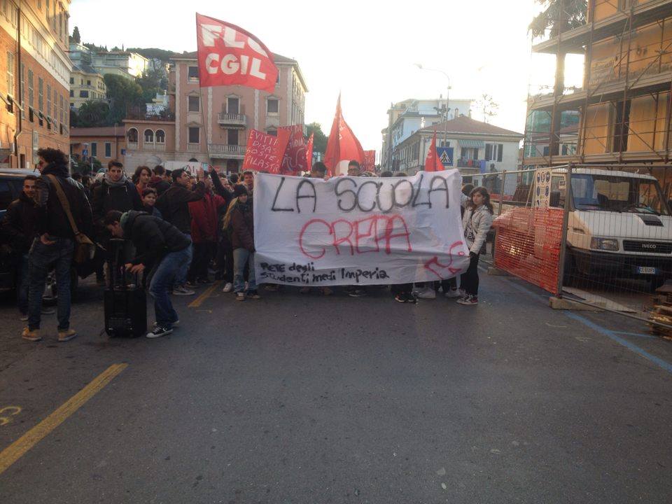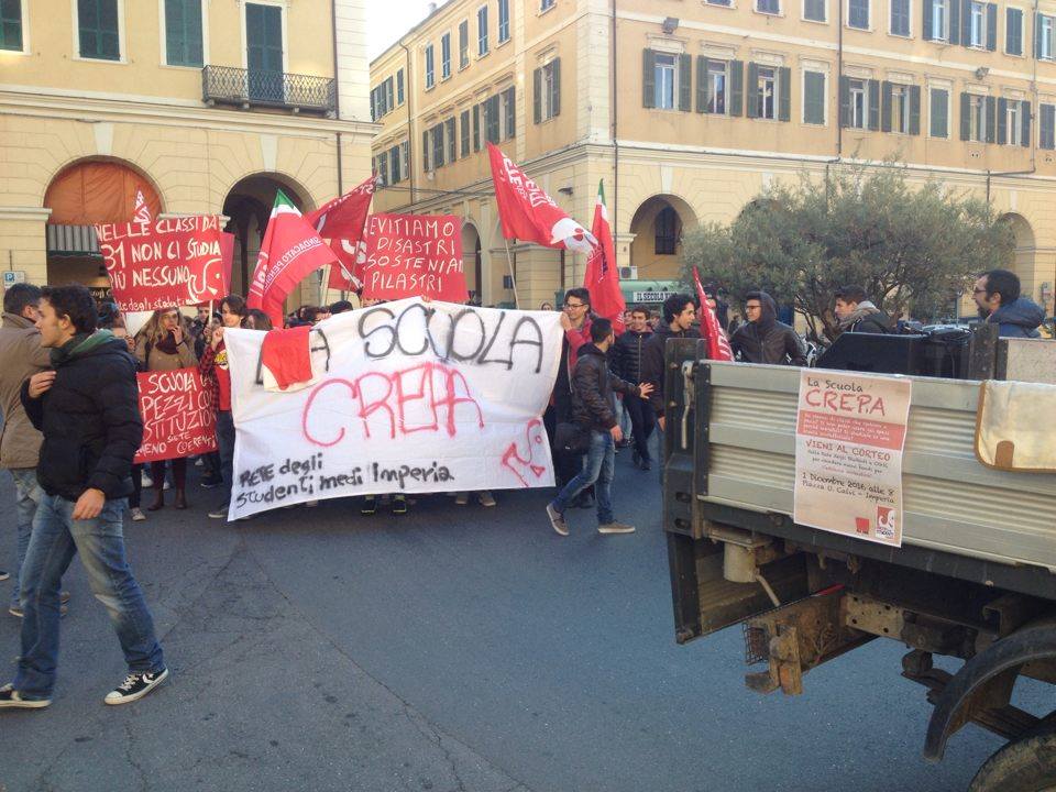 Il corteo “La scuola crepa“, questo lo slogan della manifestazione organizzata dalla “Rete degli studenti medi di Imperia”, in collaborazione con la Cgil, è partito poco dopo le 8 da piazza Ulisse Calvi, snodandosi, scortato da Polizia e Carabinieri, lungo via Amendola, via Bonfante, piazza Dante, via della Repubblica e Viale Matteotti, sino a raggiungere la sede della Provincia, dove una delegazione incontrerà il presidente della Provincia Fabio Natta per consegnare un documento con le richiede degli studenti in tema di edilizia scolastica.