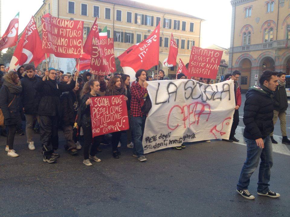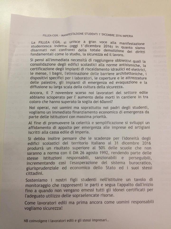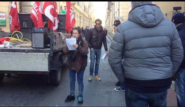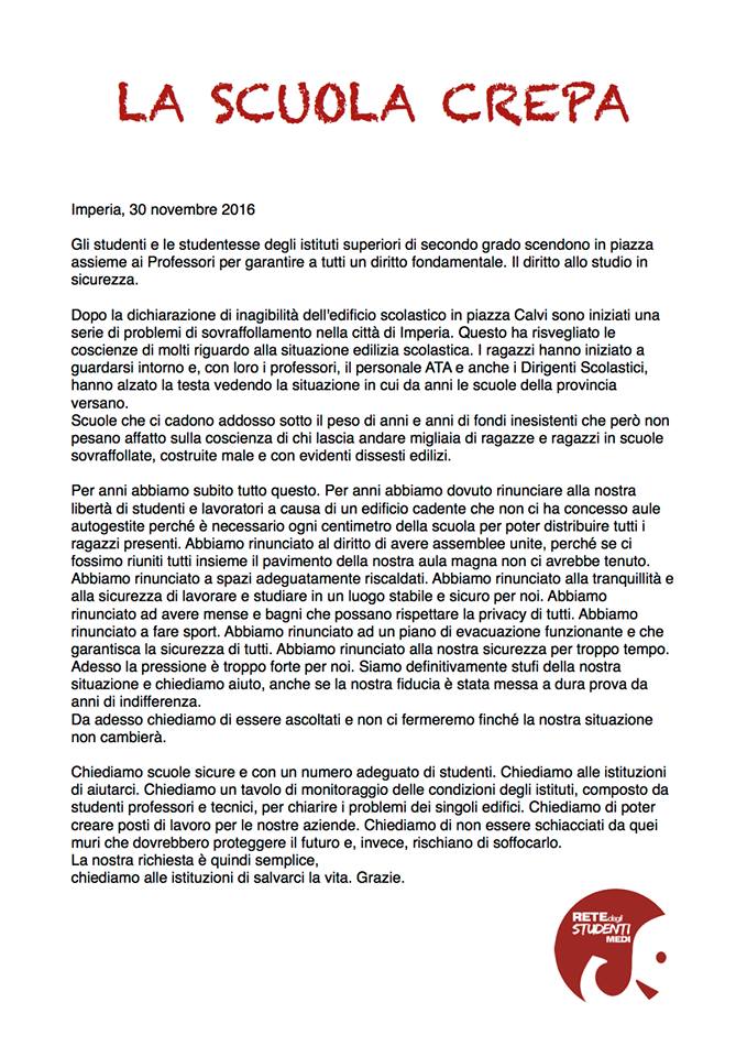 “Per anni ci è stato detto che dovevamo adattarci, perché ci è stato detto che in fondo c’è chi sta peggio. A noi non è mai sembrata una motivazione valida. La nostra è una situazione incoerente, come la digitalizzazione tanto cara al Ministro Giannini che pare più urgente degli edifici che dovrebbero contenerla. Basta vedere gli alunni del Liceo Classico di Imperia che non hanno più una propria sede, ma hanno a disposizione registri elettronici e tutto ciò per fare bella figura con gli altri Paese. Siamo qui per dire che le priorità e le dinamiche dei finanziamenti della scuola dovrebbero essere discusse con chi la vive. Siamo qui per dimostrare che noi studenti ci siamo”.