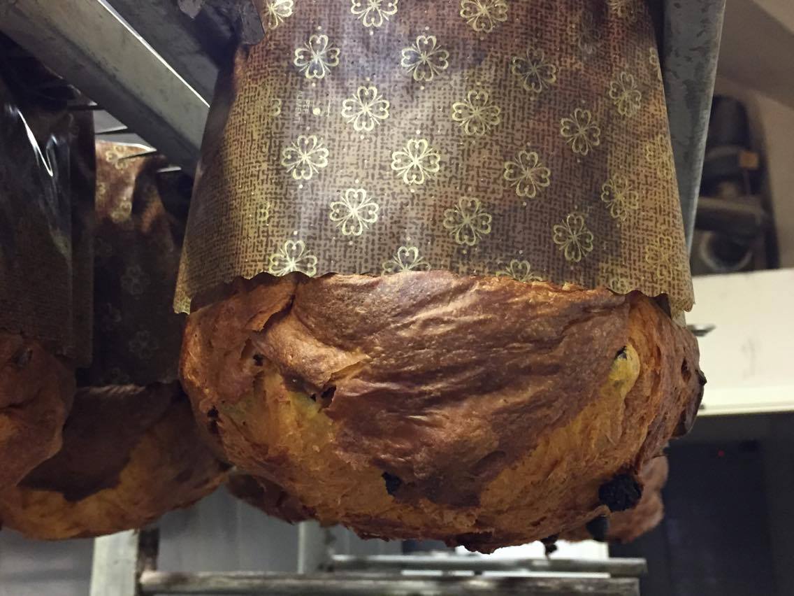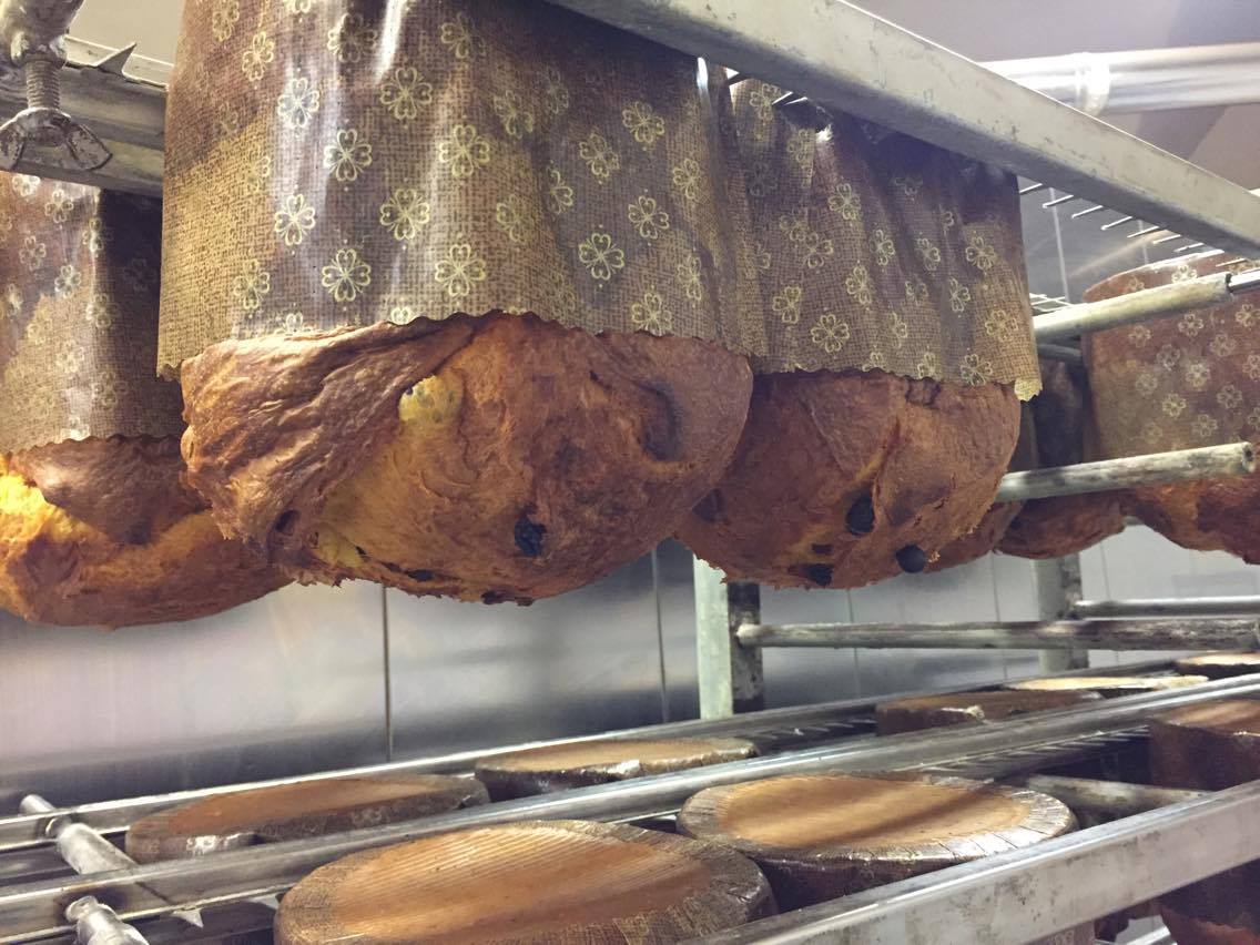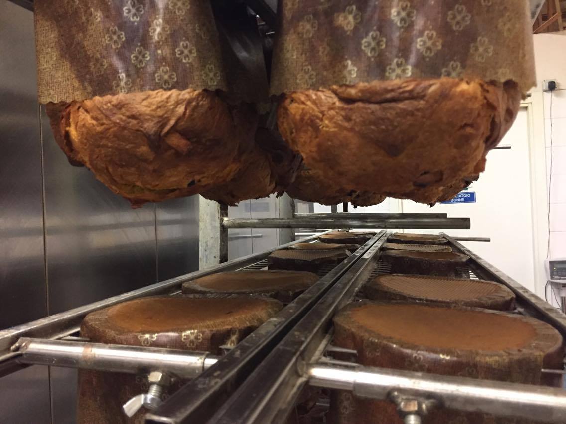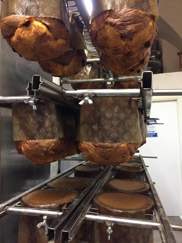 Poi la lavorazione: si lavora il primo impasto base, con uova farina, zucchero e si lascia riposare 12 ore. Passate le 12 ore si rifà un altro impasto con canditi e uvetta, poi si aggiungono altri elementi a seconda del tipo di panettone che si vuole ottenere, dal cioccolato, alle pere, ai marron glacé, oppure con cioccolato bianco e pistacchi. Una volta ottenuta la versione desiderata la si pesa e si informa (dentro il classico contenitore in carta) e lo si lascia risposare per altre 10 ore alla temperatura di 27/28° .