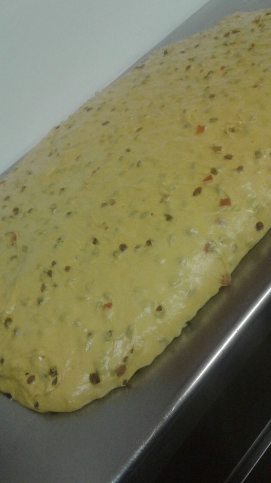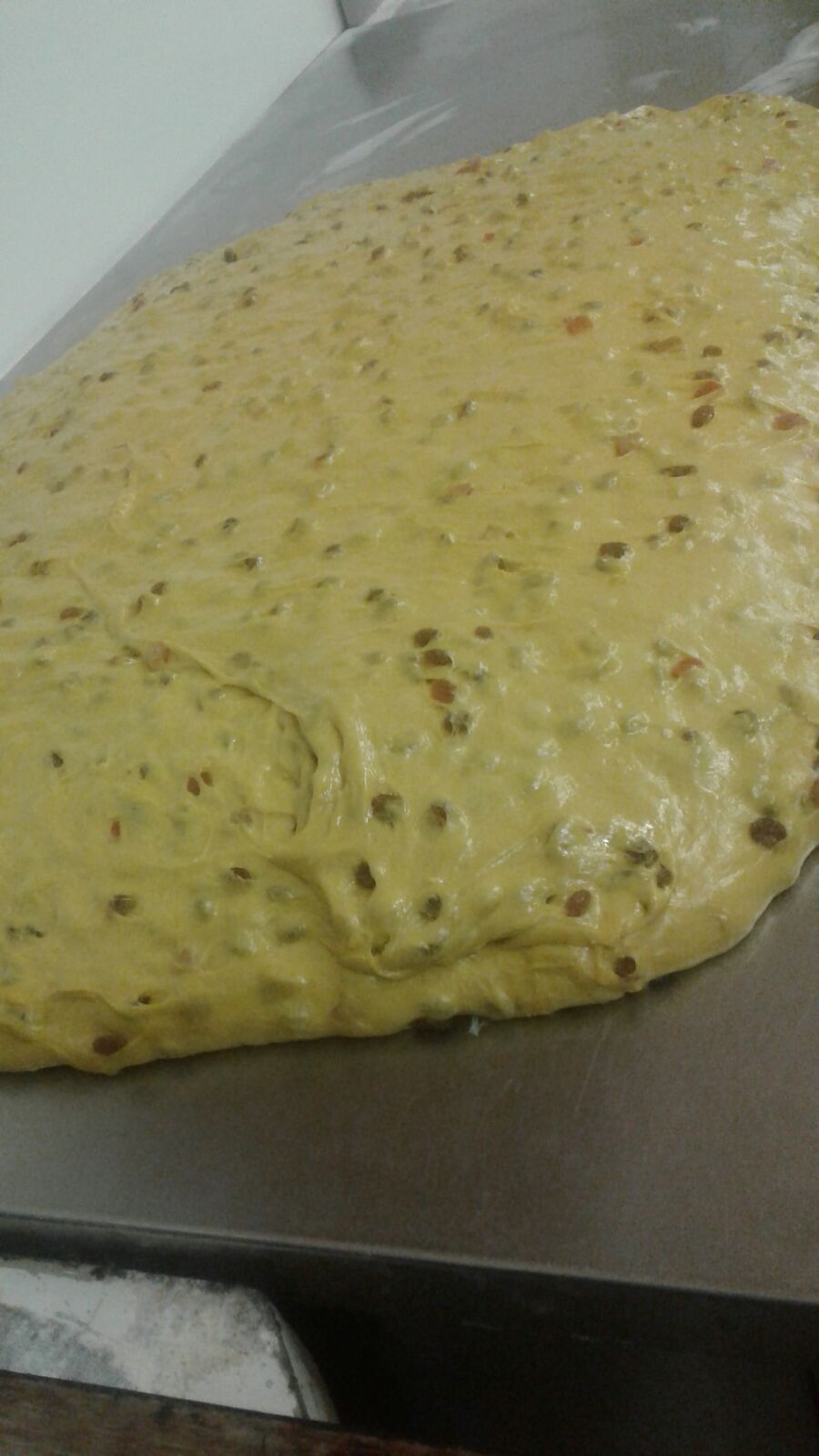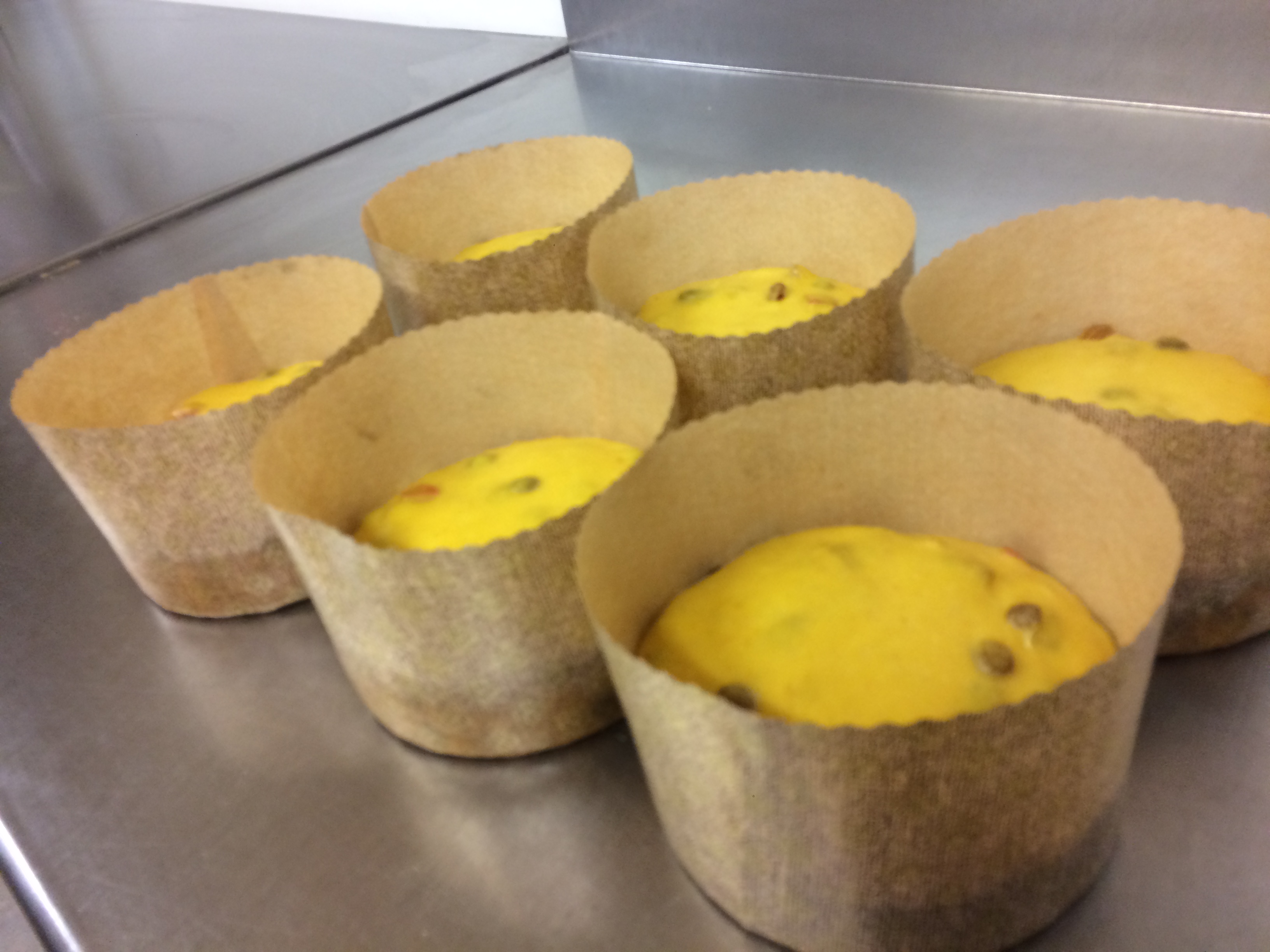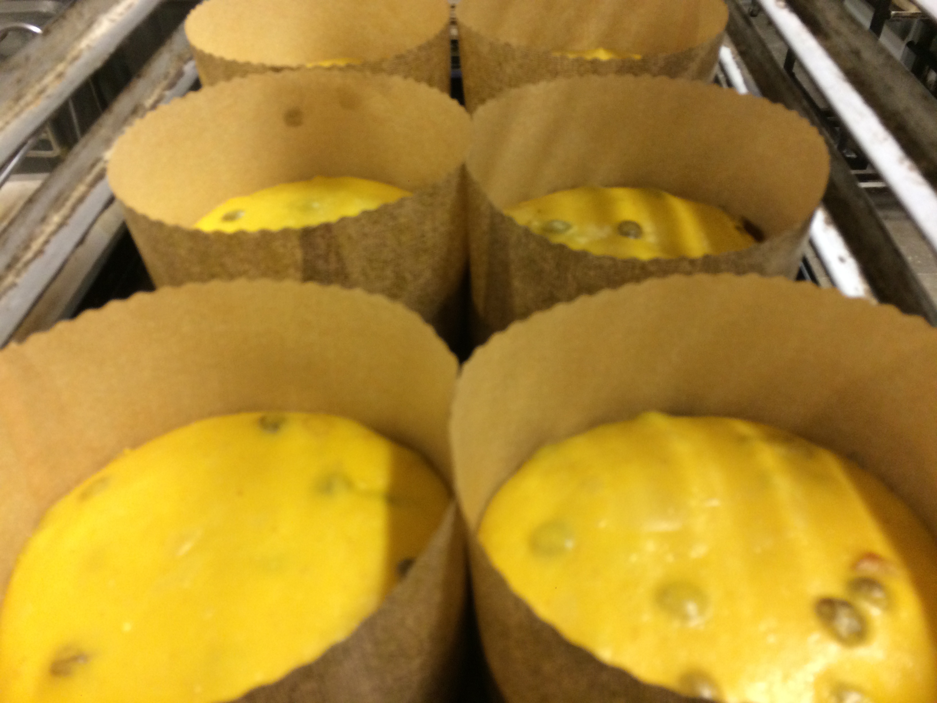 Poi la lavorazione: si lavora il primo impasto base, con uova farina, zucchero e si lascia riposare 12 ore. Passate le 12 ore si rifà un altro impasto con canditi e uvetta, poi si aggiungono altri elementi a seconda del tipo di panettone che si vuole ottenere, dal cioccolato, alle pere, ai marron glacé, oppure con cioccolato bianco e pistacchi. Una volta ottenuta la versione desiderata la si pesa e si informa (dentro il classico contenitore in carta) e lo si lascia risposare per altre 10 ore alla temperatura di 27/28° .