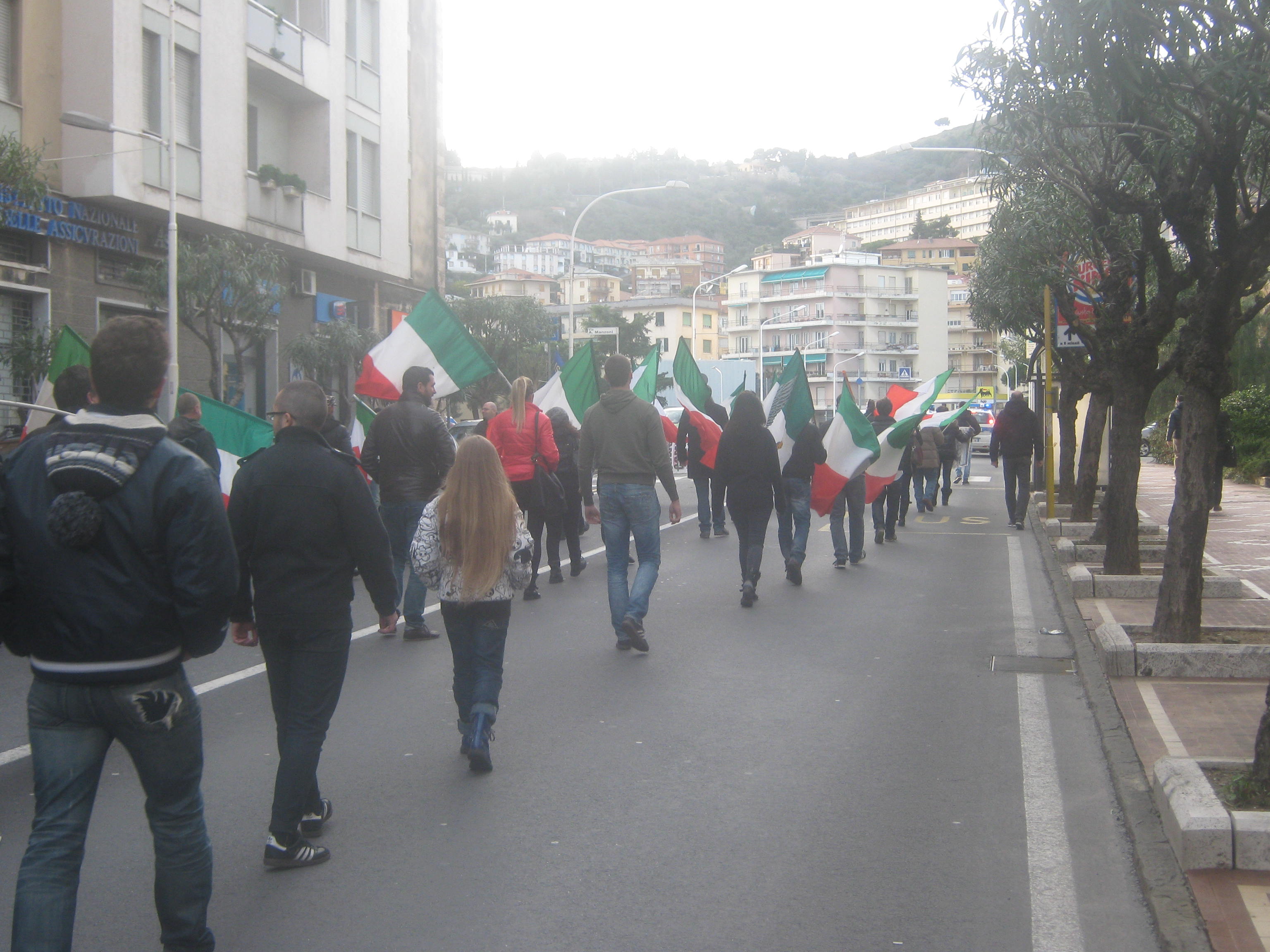 I partecipanti, oltre un centinaio, si sono riuniti in Largo Brea (area fronte Oviesse) da dove è partito un corteo tricolore che ha attraversato