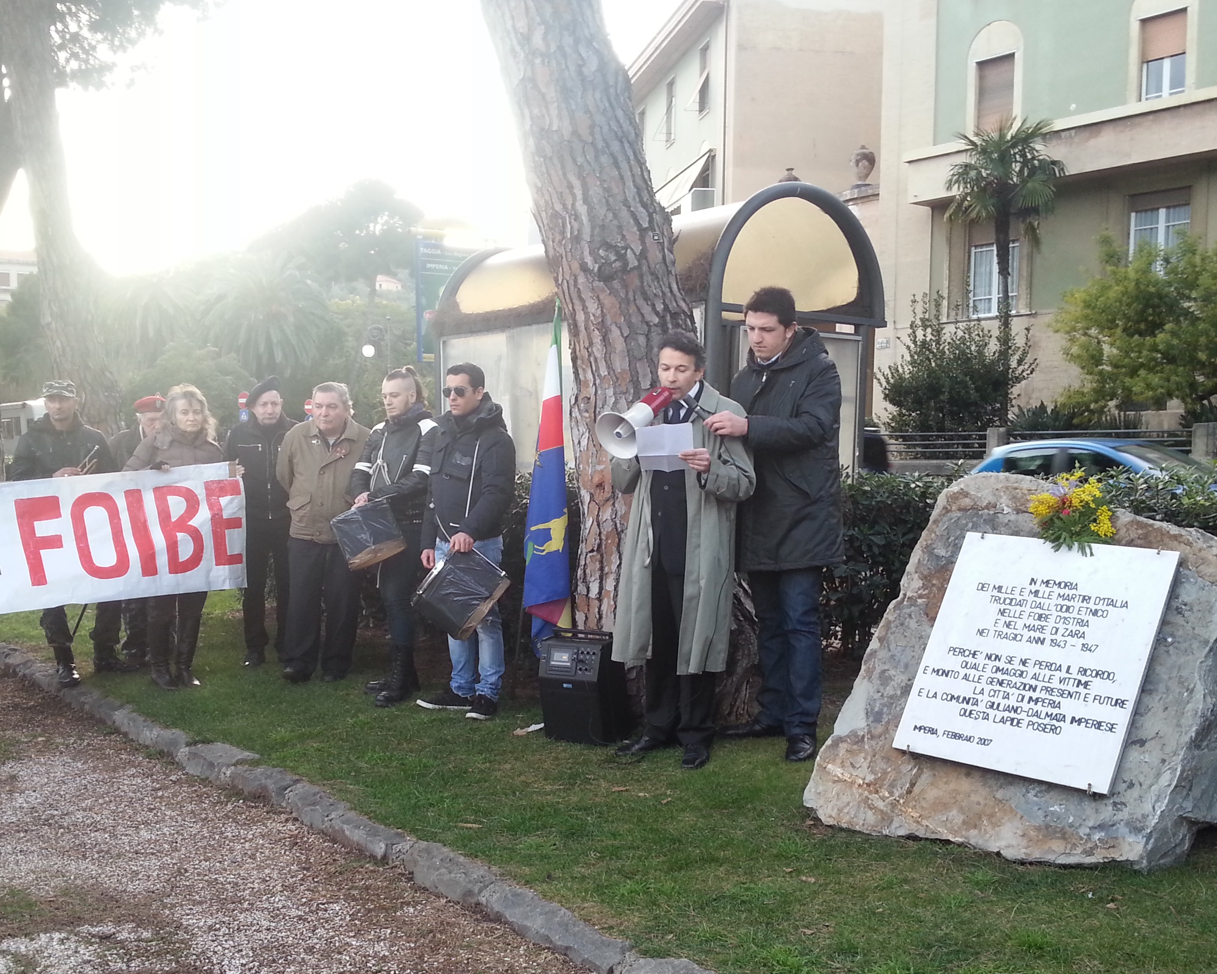 Piazza della Vittoria, dove si sono tenuti i consueti interventi. Quest’anno, a prendere la parola, sono stati Angelo Dulbecco e Valerio Ramini (a nome del Coordinamento 10 Febbraio), Pietro Chersola (Presidente provinciale dell’Associazione Nazionale Venezia Giulia e Dalmazia) e Giuseppe Fossati (Consigliere Comunale ad Imperia). Al termine degli interventi è stato apposto un omaggio floreale al monumento intitolato ai Caduti sulle note del “Silenzio fuori ordinanza” eseguito alla tromba e si è poi provveduto alla lettura dell’Invocazione per le vittime delle Foibe di Mons. Antonio Santin, Vescovo di Trieste.