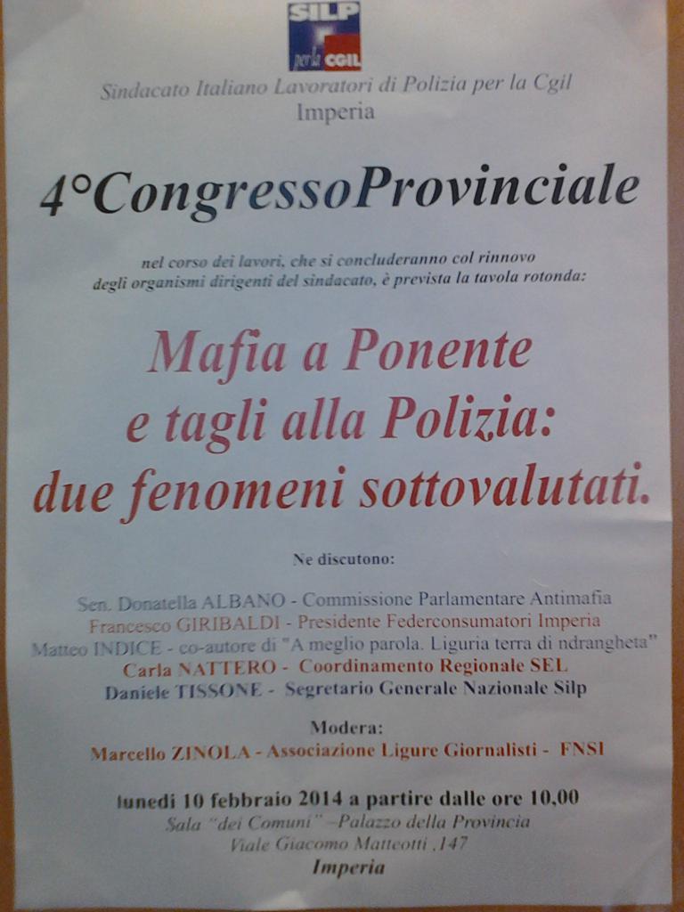 La Sala Comuni della Provincia di Imperia era gremita di persone questa mattina: lavoratori, giovani studenti e poliziotti si sono ritrovati per parlare di mafia nel Ponente. In sala erano presenti anche il Questore Zazzaro e l’assessore De Bonis oltre ai giovani della classe 2°B del Liceo Scientifico G.P. Vieusseux.