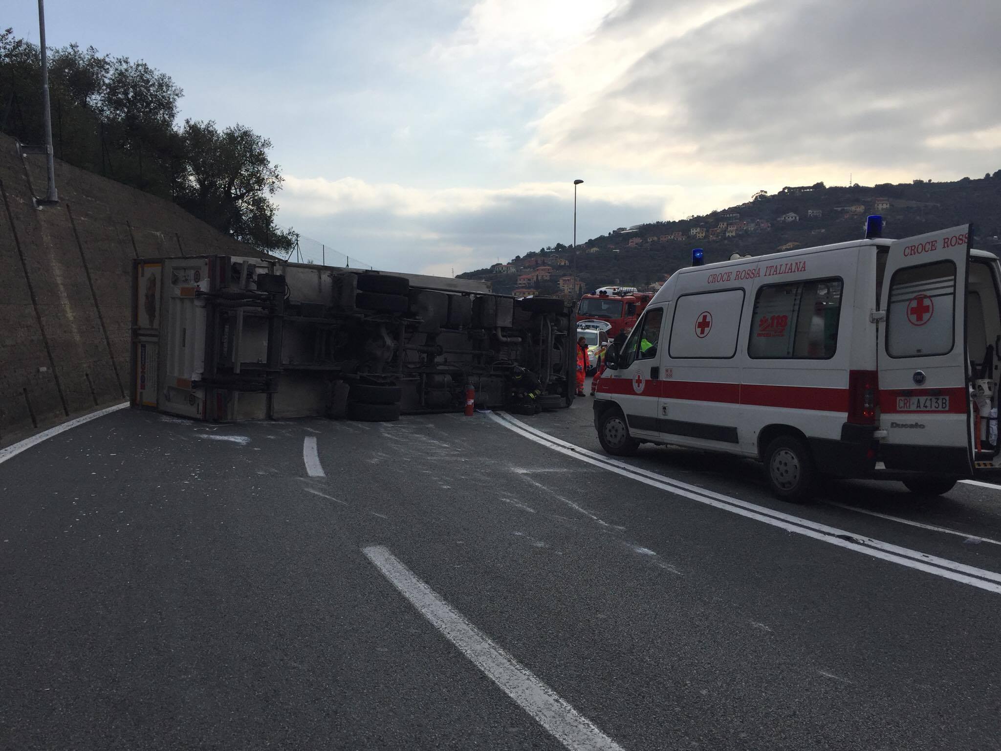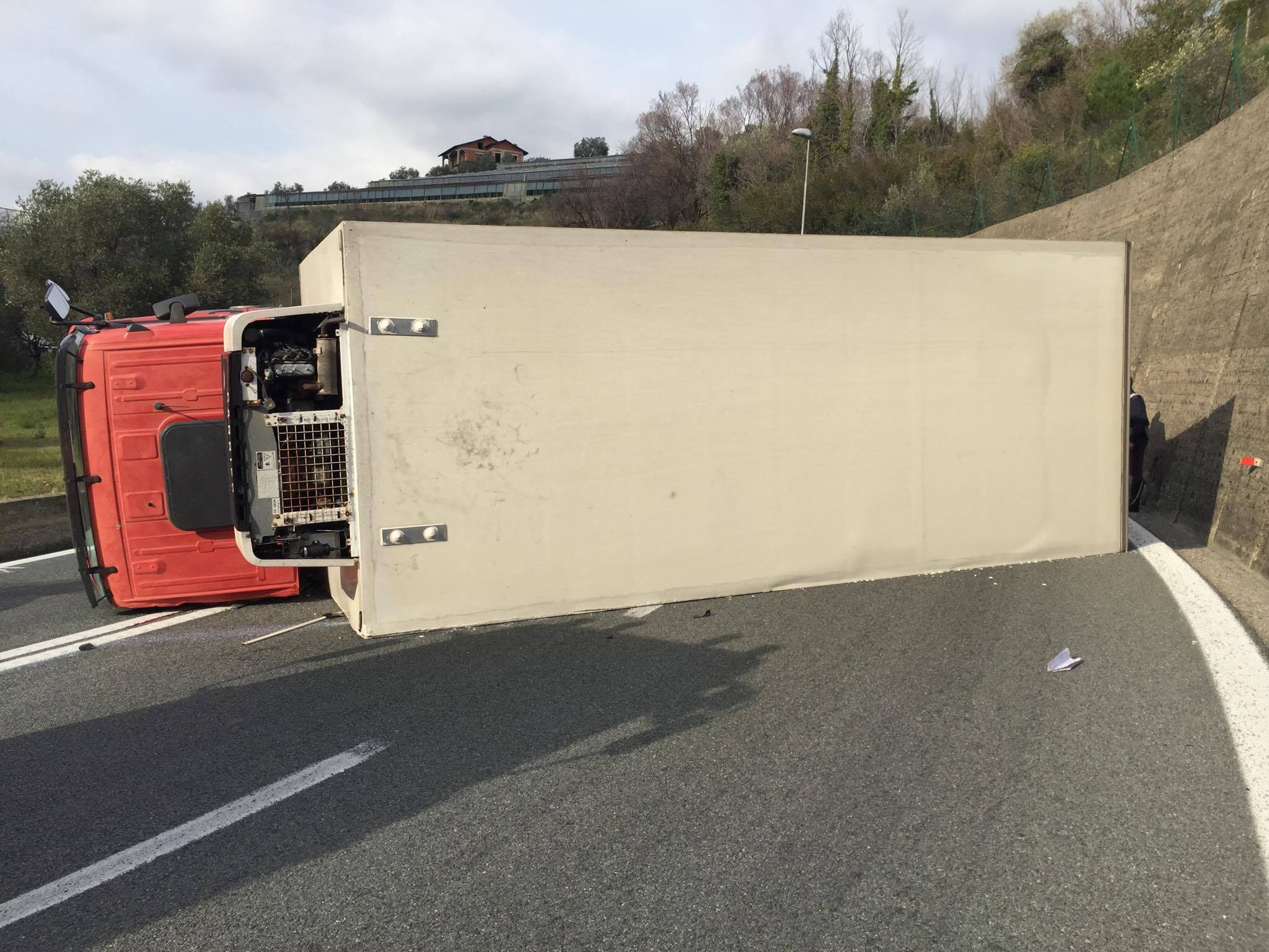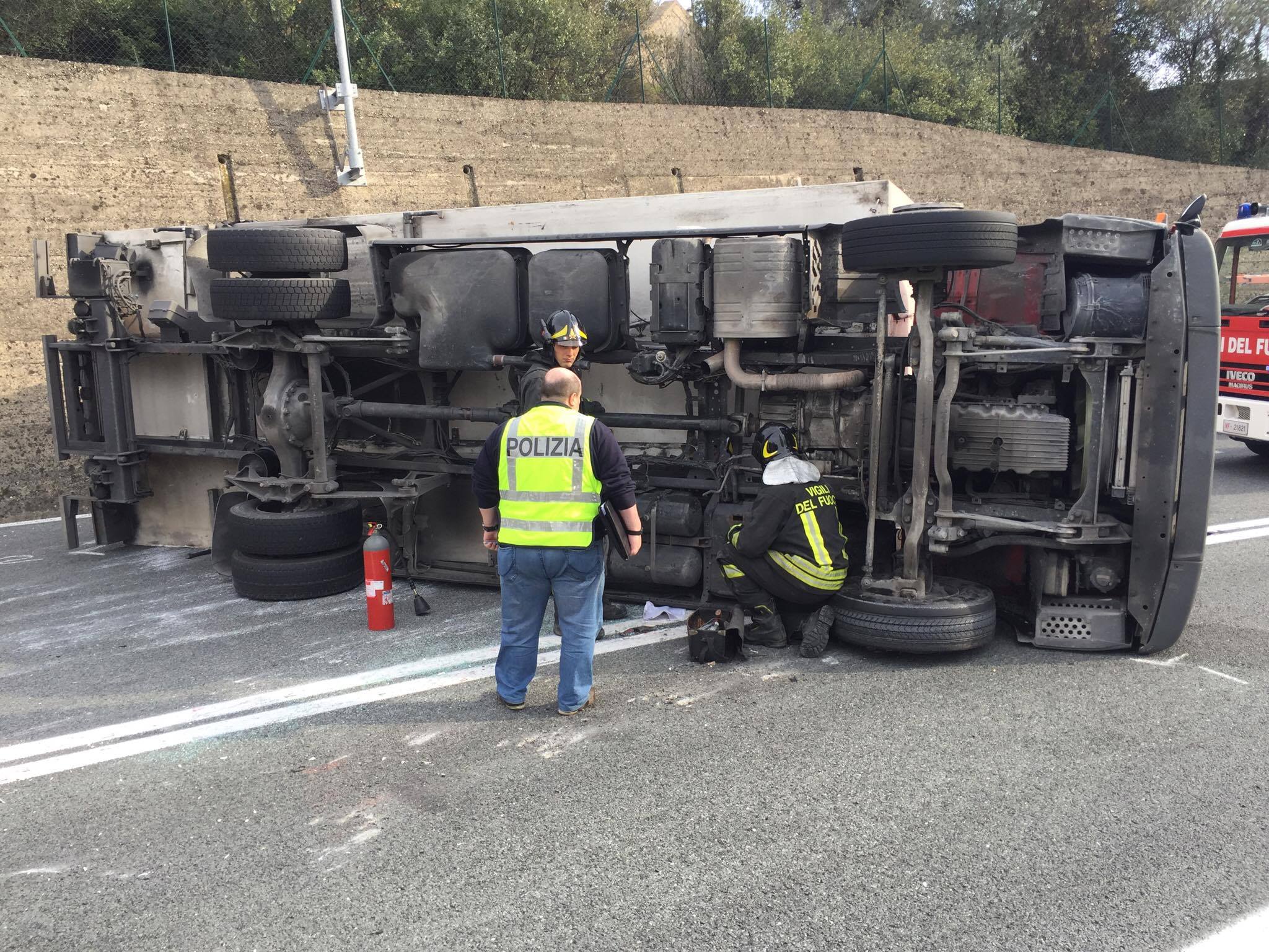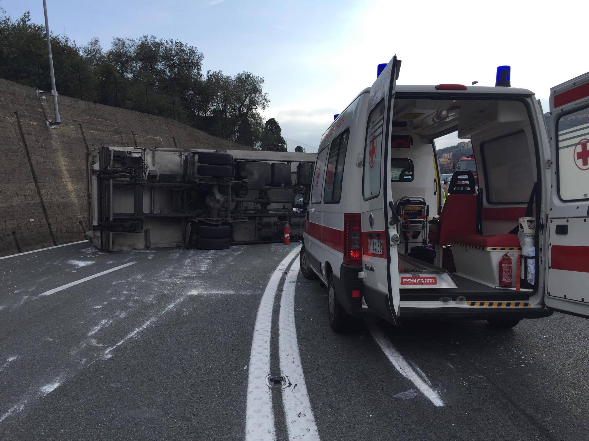 Incidente stradale nel primo pomeriggio di oggi, giovedì 23 febbraio, all’uscita dello svincolo autostradale di Imperia Ovest. Un camion, guidato da un 45enne, che trasportava prodotti alimentari, per cause ancora in fase di accertamento, si è ribaltato.
