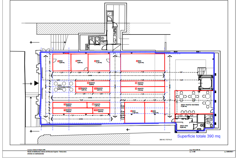 La superficie commerciale complessiva è di 390 metri quadrati e sono state individuate 6 aree box, 9 posti vendita e un’area ristoro, di cui 27,85 metri quadrati saranno destinati ad ospitare sedie e tavolini, mentre gli altri 20 metri quadrati saranno adibiti alla somministrazione di alimenti e bevande.