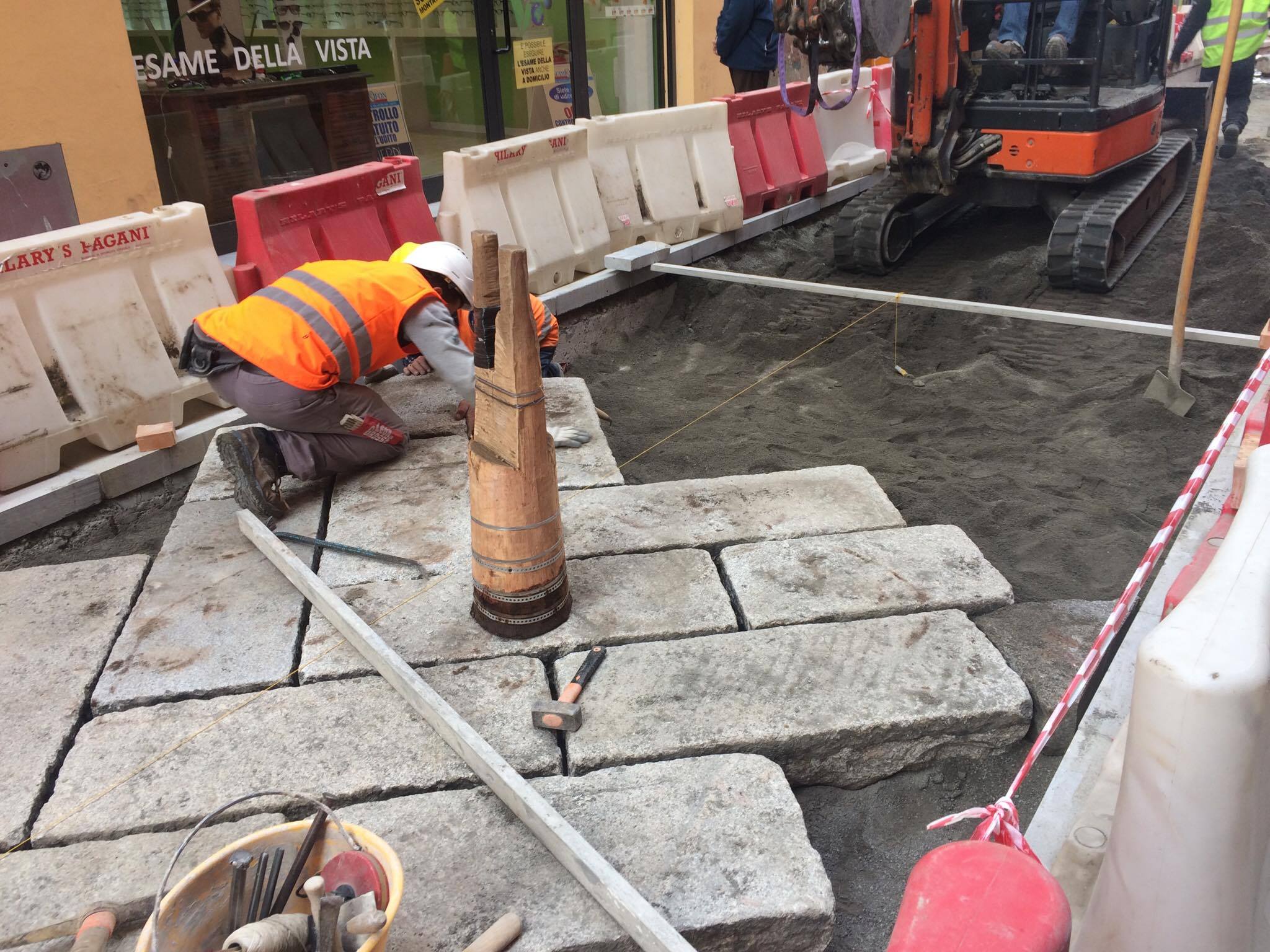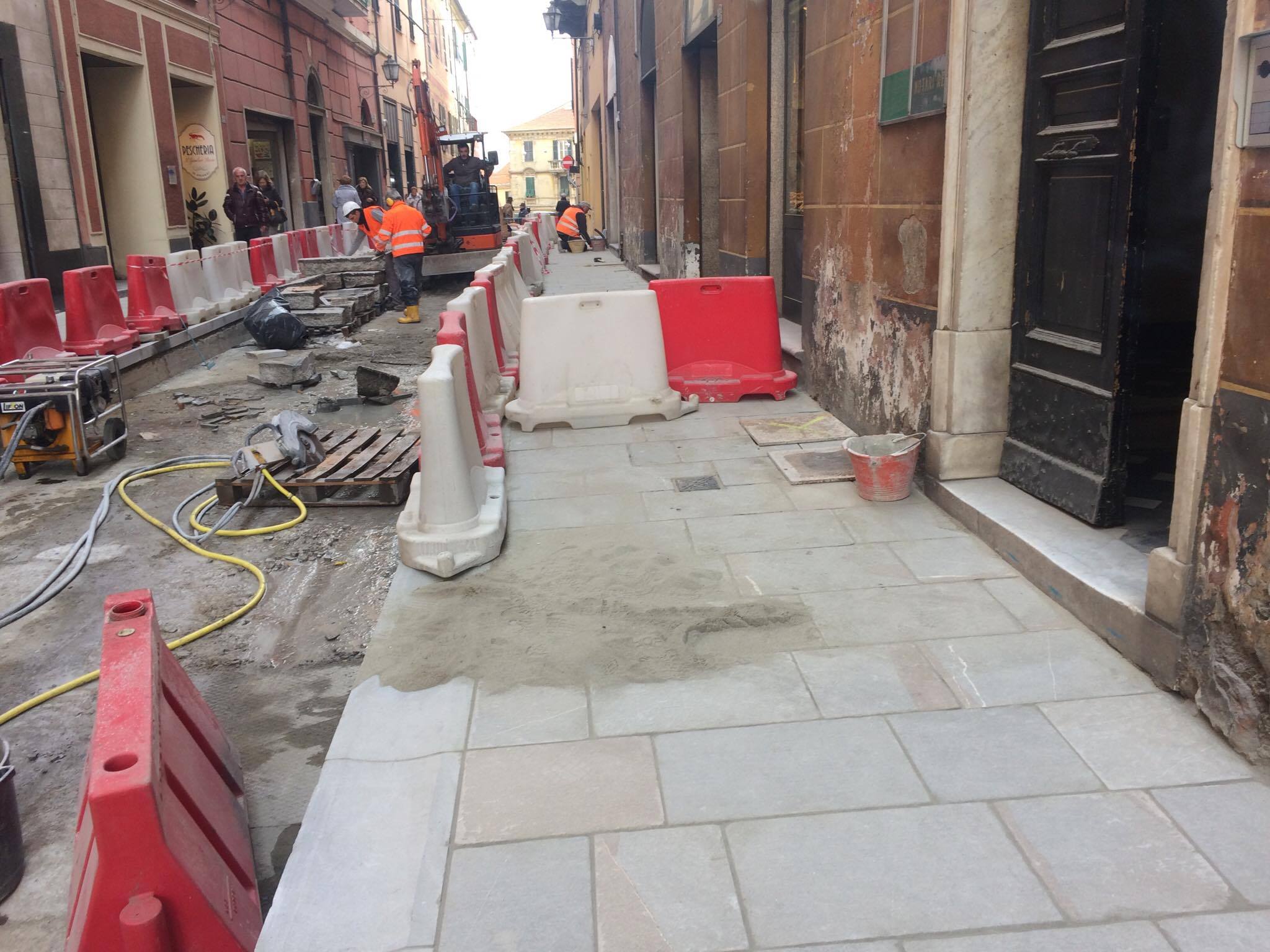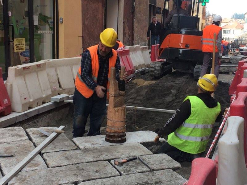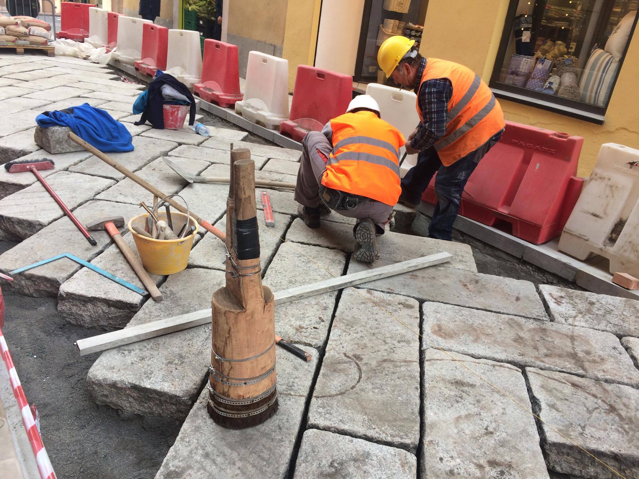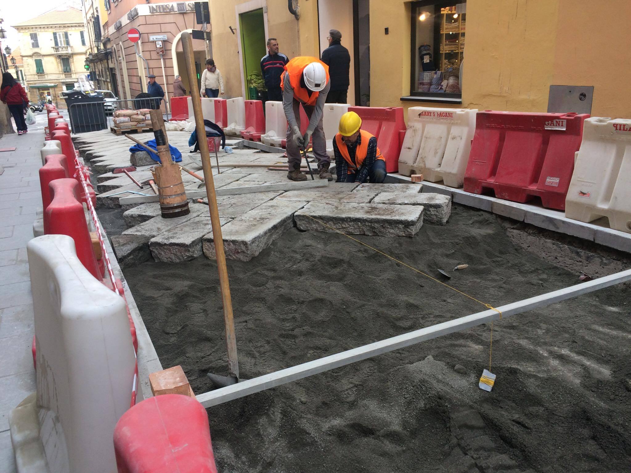 Prende forma la nuova via Cascione. Con la posa delle basole al centro della strada e delle pietre di Verezzo ai lati, si inizia a intravedere finalmente come si presenterà la zona una volta terminati i lavori.