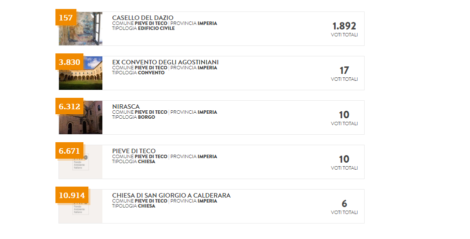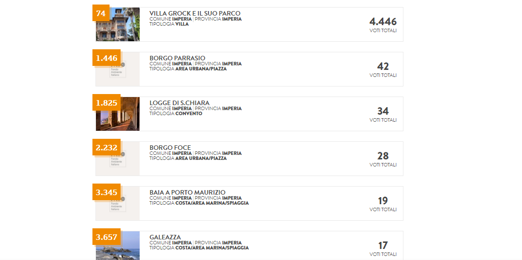 Indipendentemente dalla top ten, le due attrazioni della provincia di Imperia hanno ottenuto un ottimo risultato, considerando l’elevato numero di luoghi in gara, più di 33 mila, in oltre 6 mila comuni italiani. Il Casello del Dazio di Pieve di Teco si è posizionato al 157° posto, con 1.892 voti, mentre Villa Grock ha conquistato la 74esima posizione, con ben 4.446 voti. Oltre ai premi per i primi classificati, il Fai prevede diverse iniziative per tutelare anche altri luoghi che otterranno un alto numero di segnalazioni, a prescindere dal posto in classifica raggiunto.