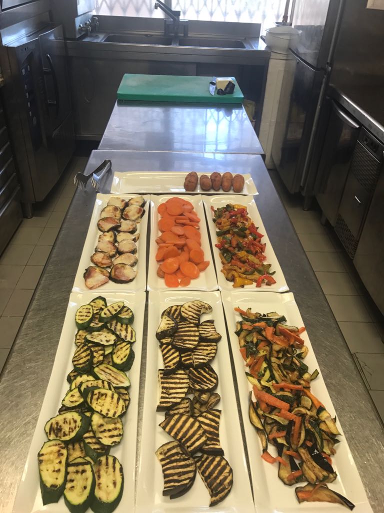 Piatti a base di carne con verdure alla griglia , insalatone ed antipasti.