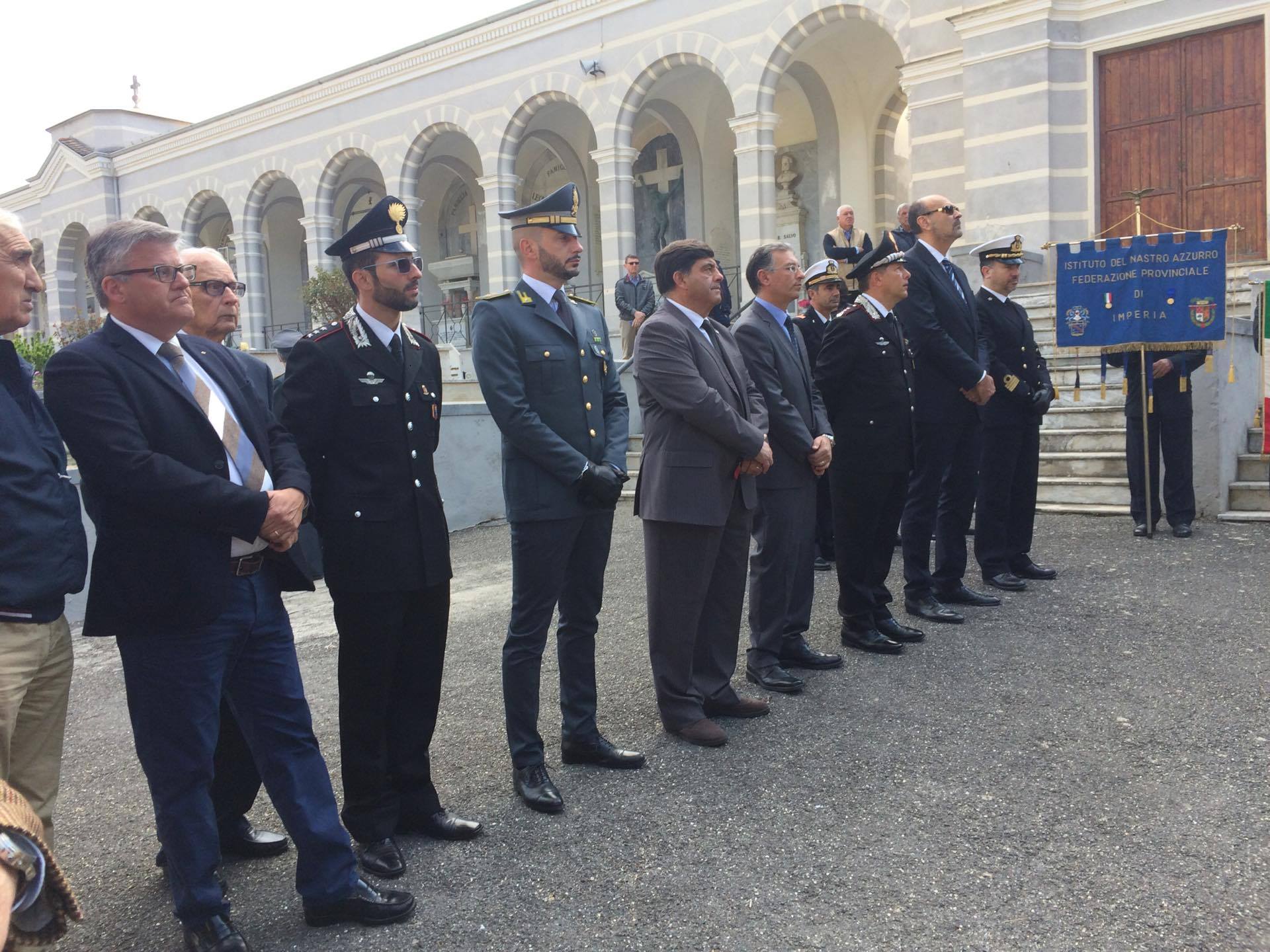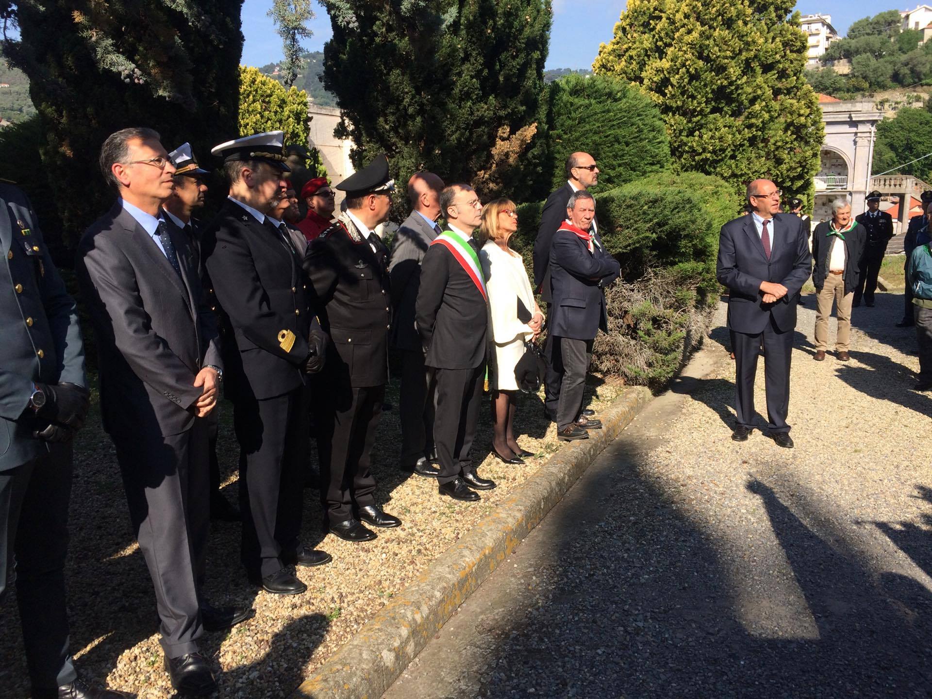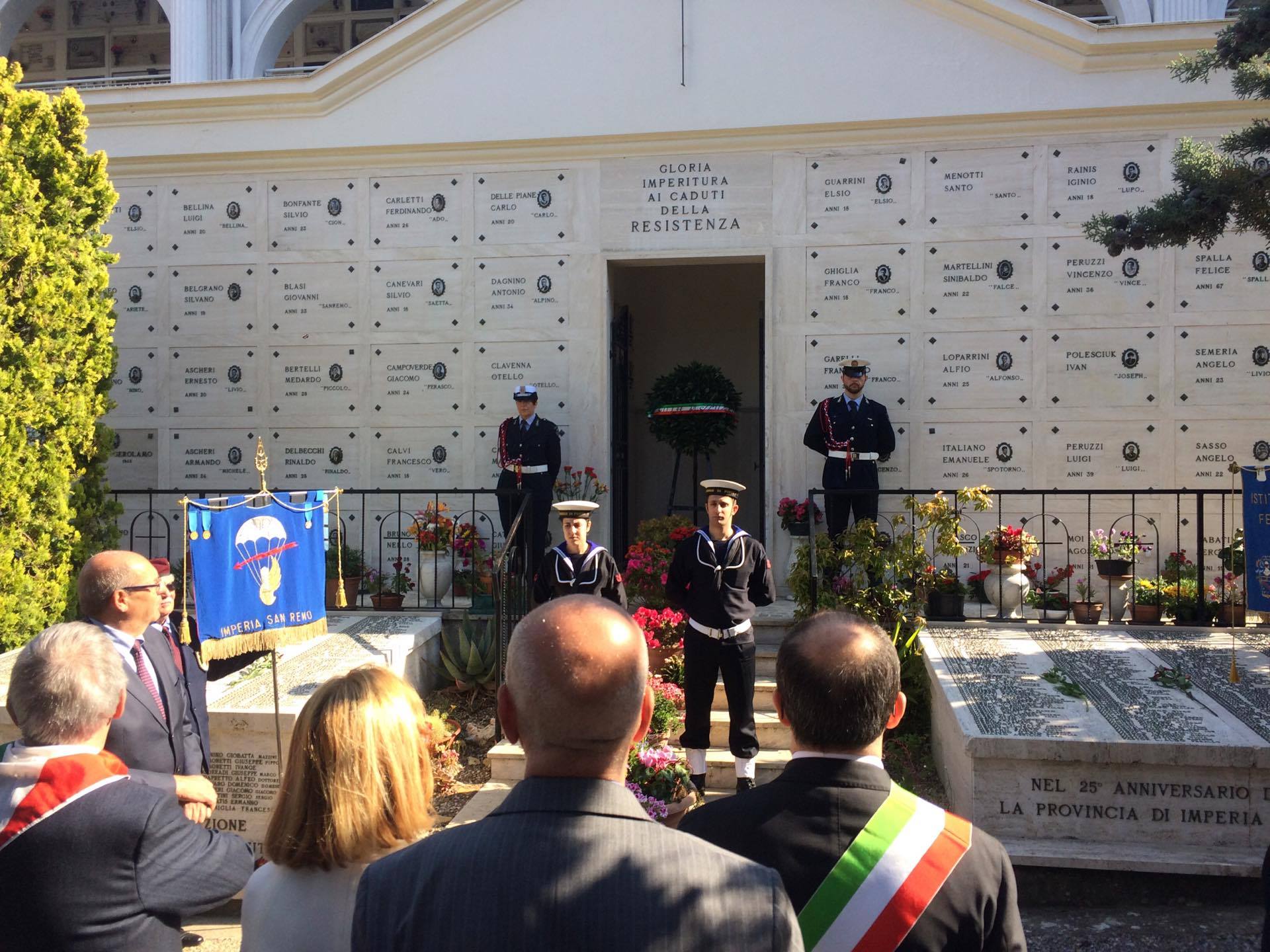 Al Cimitero di Porto Maurizio ha avuto luogo la deposizione della corona di alloro al Mausoleo della Resistenza e, successivamente, la stessa cerimonia si è tenuta al Cimitero di Oneglia. Presenti il sindaco di Imperia Carlo Capacci, sua eccellenza il prefetto Silvana Tizzano, il presidente del comitato provinciale Anpi Ezio Lavezzi, il vicesindaco Giuseppe Zagarella, il presidente Anpi di Porto Maurizio Rinaldo Paglieri, il comandante Capitaneria di Porto di Imperia Luciano Pischedda, il Capitano Giovanni Diglio dei Carabinieri, Angelo Arrigo in rappresentanza della Polizia Municipale di Imperia, il presidente del Circolo Parasio Giacomo Raineri e l’on. Giovanni Rainisio.