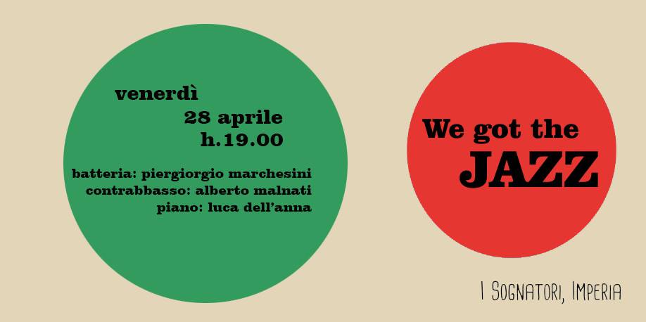 Venerdì 28 aprile alle 19 con la serata a tema We Got the Jazz We got the Jazz Piergiorgio Marchesini: #batteria, Alberto Malnati: #contrabbasso, Luca Dell’Anna: #piano