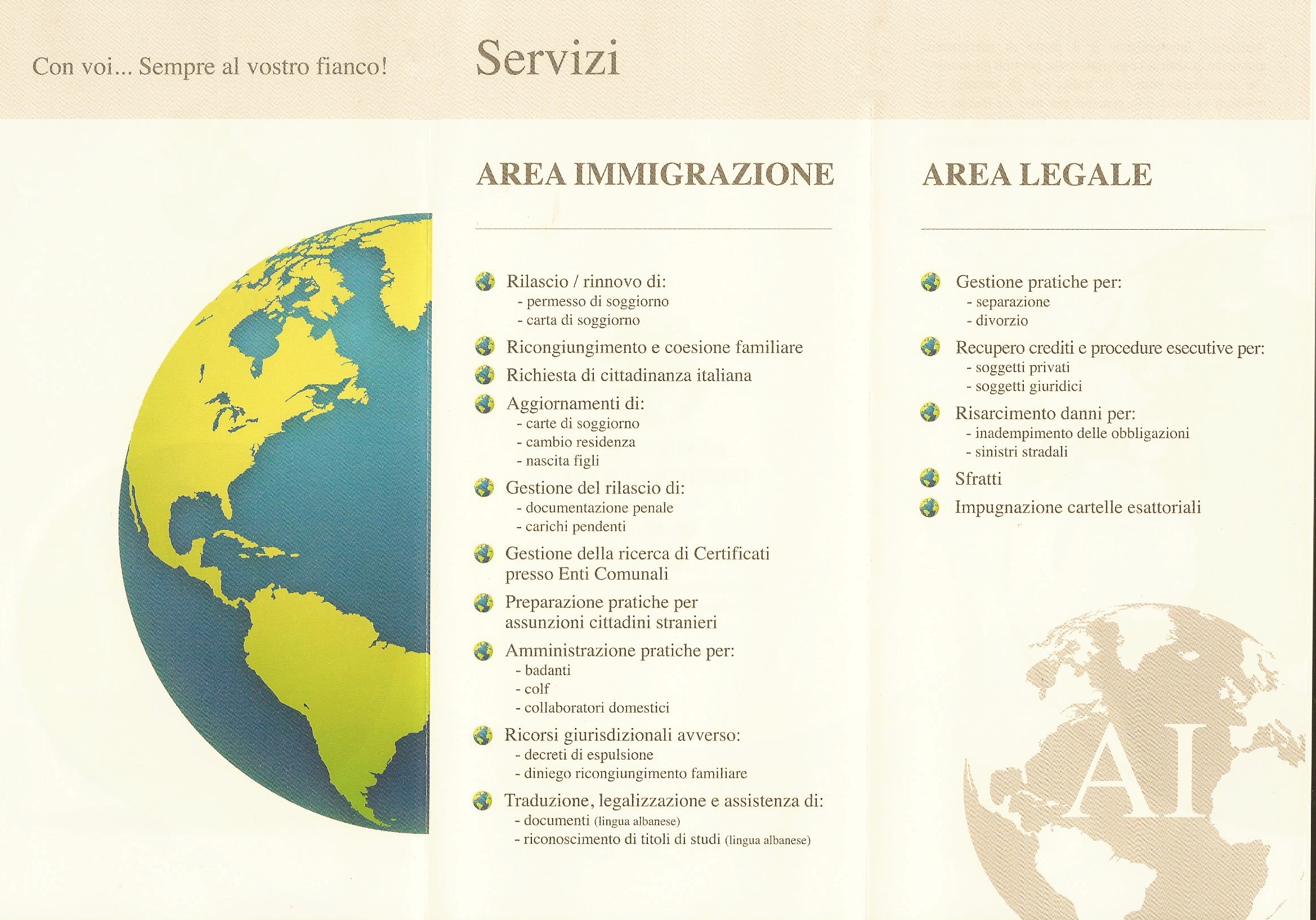 Shërbimet e ofruara nga profesionistët tanë janë të shumta, për shembull: kërkesa per Viza të ndryshme (turizëm, punë etj) kërkesa per leje qëndrimit (permesso di soggiorno, carta di soggiorno etj), rinovim leje qëndrimi, nënshtetësi italiane, bashkim familjar, procedura kundër refuzimit e qëndrimit në Itali , anullim per dekrete përjashtimi Schengen, ndarje martese, procedurave ekzekutimi etj.