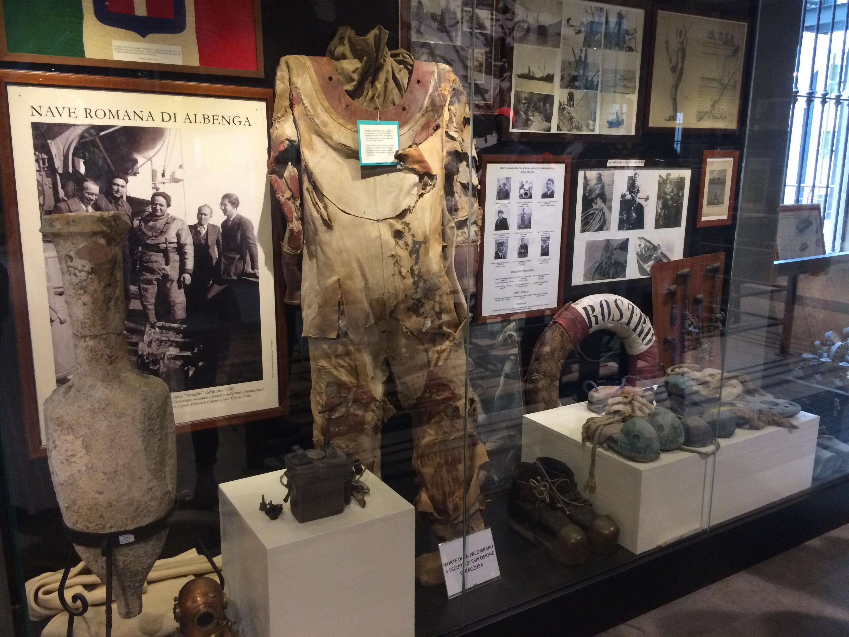 Nella teca è possibile ammirare un vestito da palombaro, appartenuto all’imperiese Adriano Aicardi, usurato dagli anni di attività lavorativa infine rovinato da un’esplosione subacquea che ha causato anche la morte dello stesso palombaro.