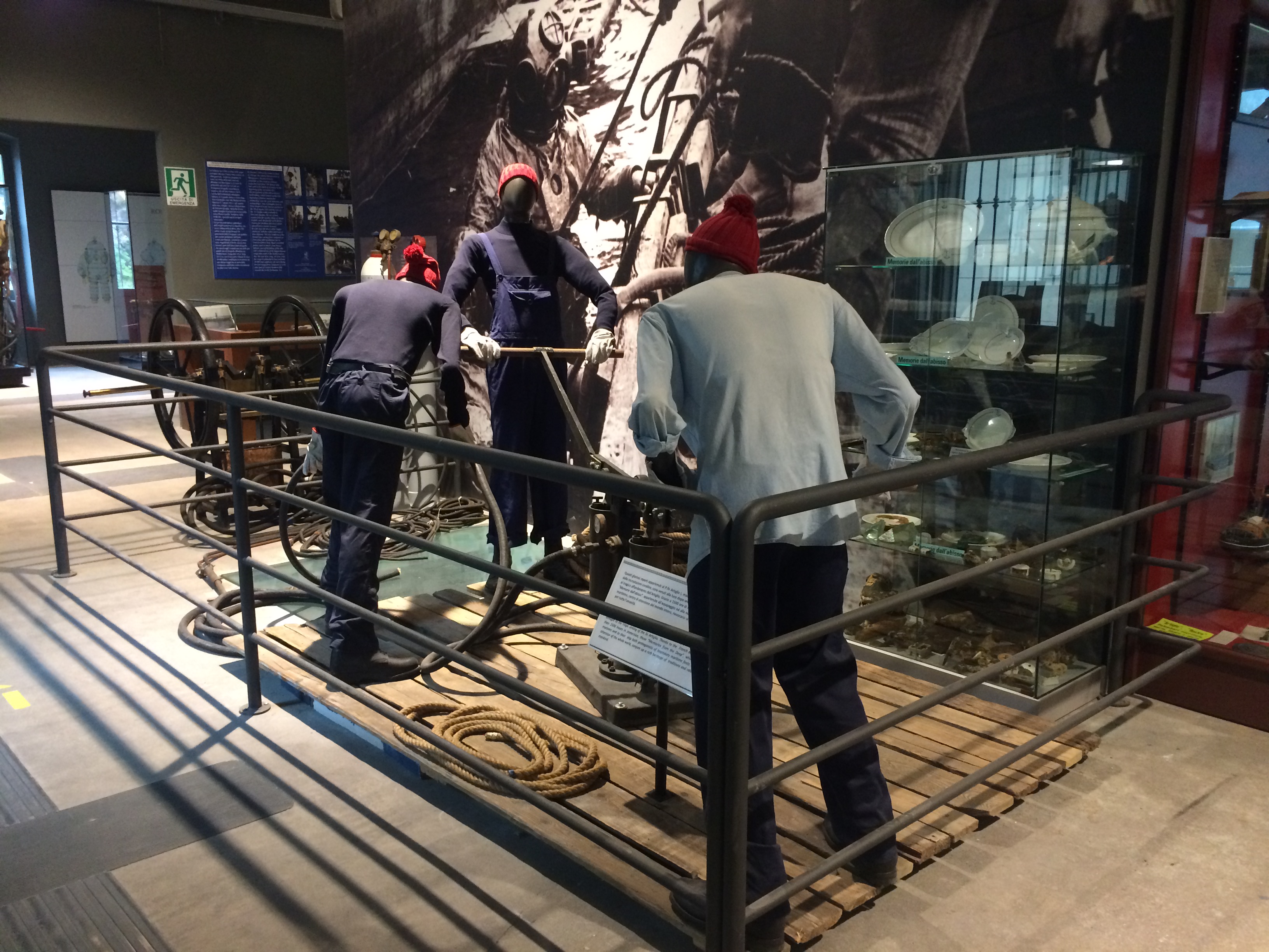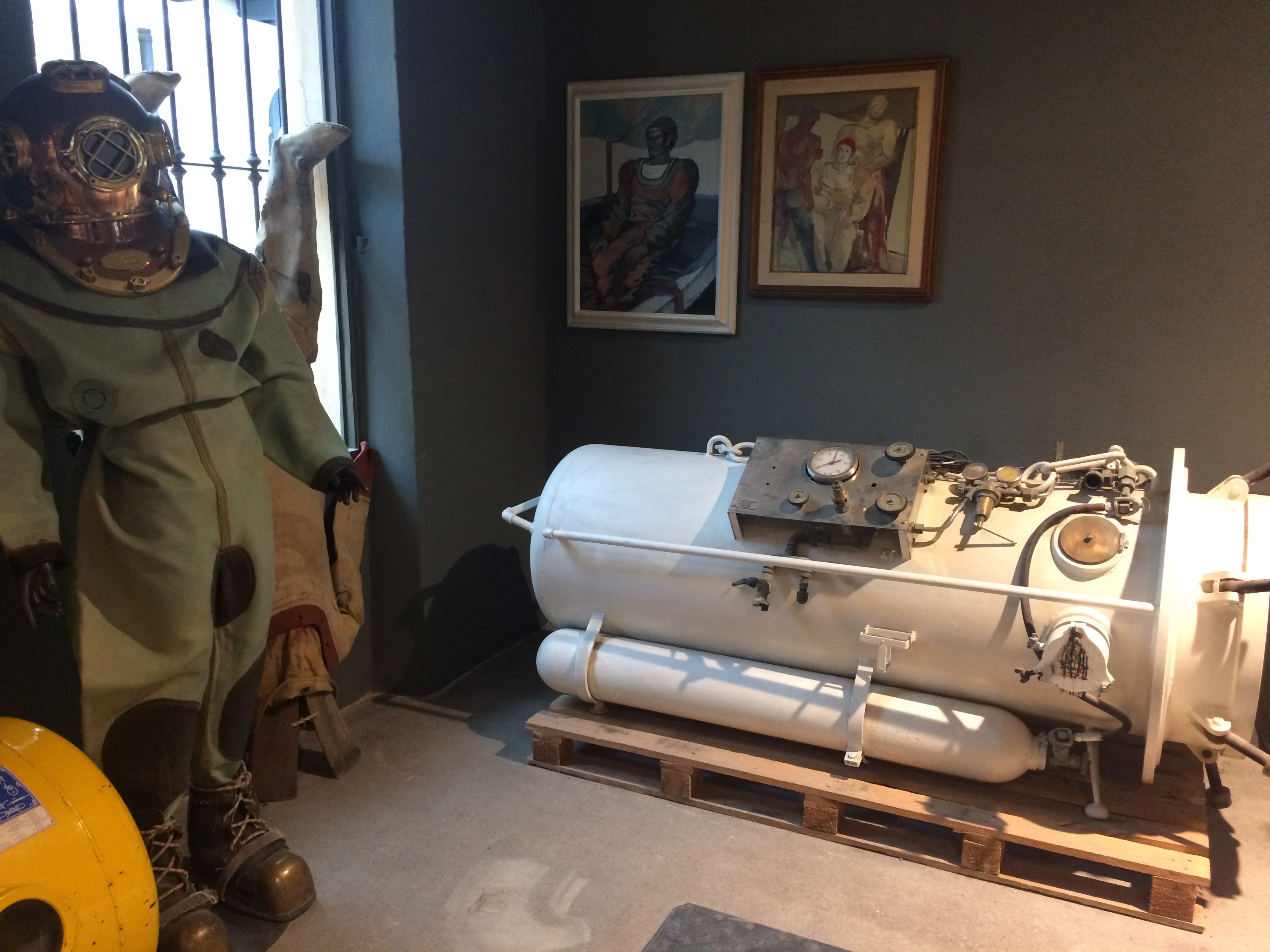 Nella sala, aggirandosi tra reperti storici, ci si imbatte nella riproduzione di un’operazione subacquea: due palombari (guide), sono impegnati al funzionamento della pompa di mandata che permette di inviare l’aria all’elmo del palombaro durante l’immersione.