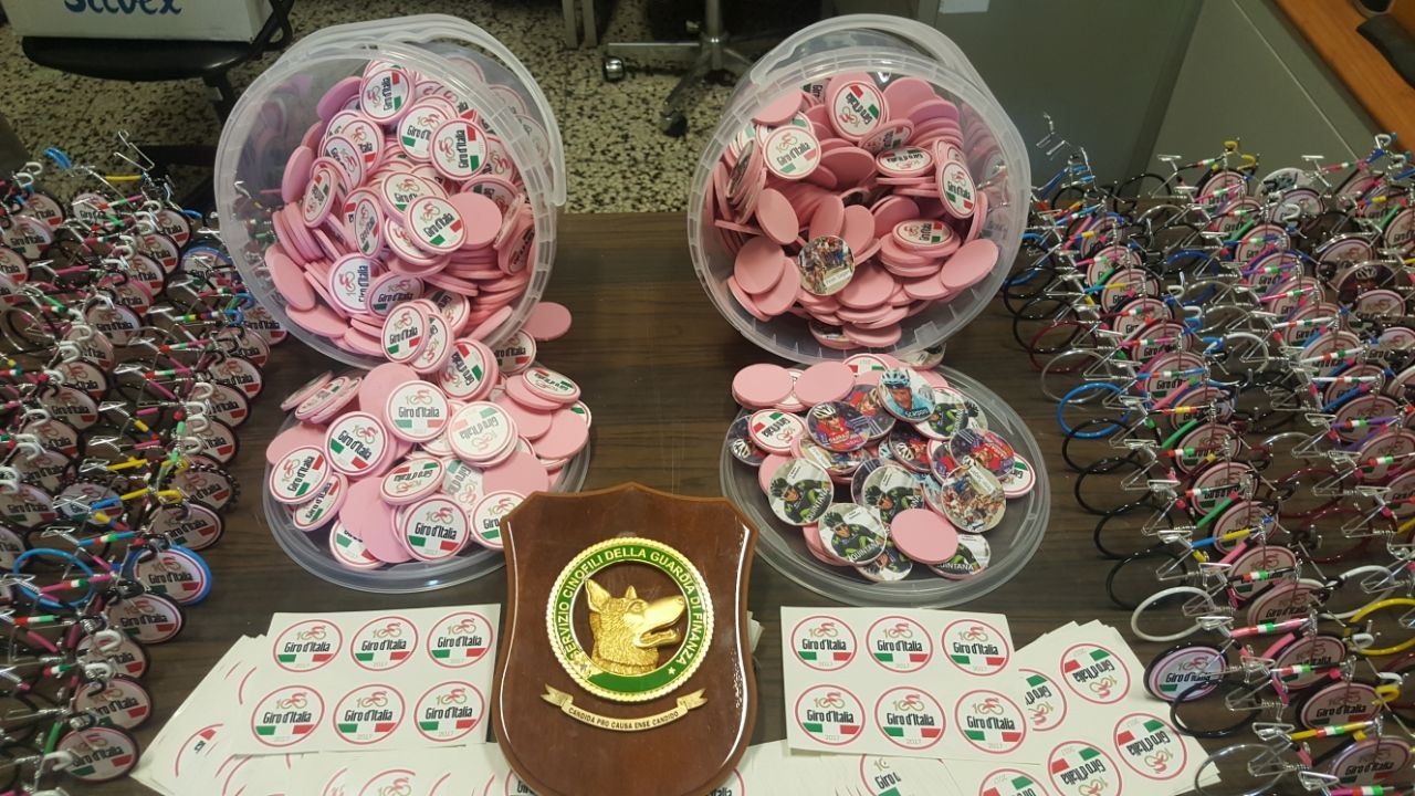 Questa circostanza ha indotto la pattuglia delle Fiamme Gialle ad ispezionare con più attenzione il veicolo, estendendo il controllo anche al portabagagli ipotizzando che vi potesse essere occultato qualcosa di illecito. In questo modo, proprio nel vano posteriore del mezzo, è stata scoperta la presenza di numerosi gadget quali modellini di biciclette, adesivi, piccoli dischi tondi riportanti anche le fotografie di ciclisti, tutti aventi il marchio “Giro d’Italia 2017” falso, seppur a prima vista molto simile a quello ufficiale e registrato dagli organizzatori dell’importante competizione sportiva.