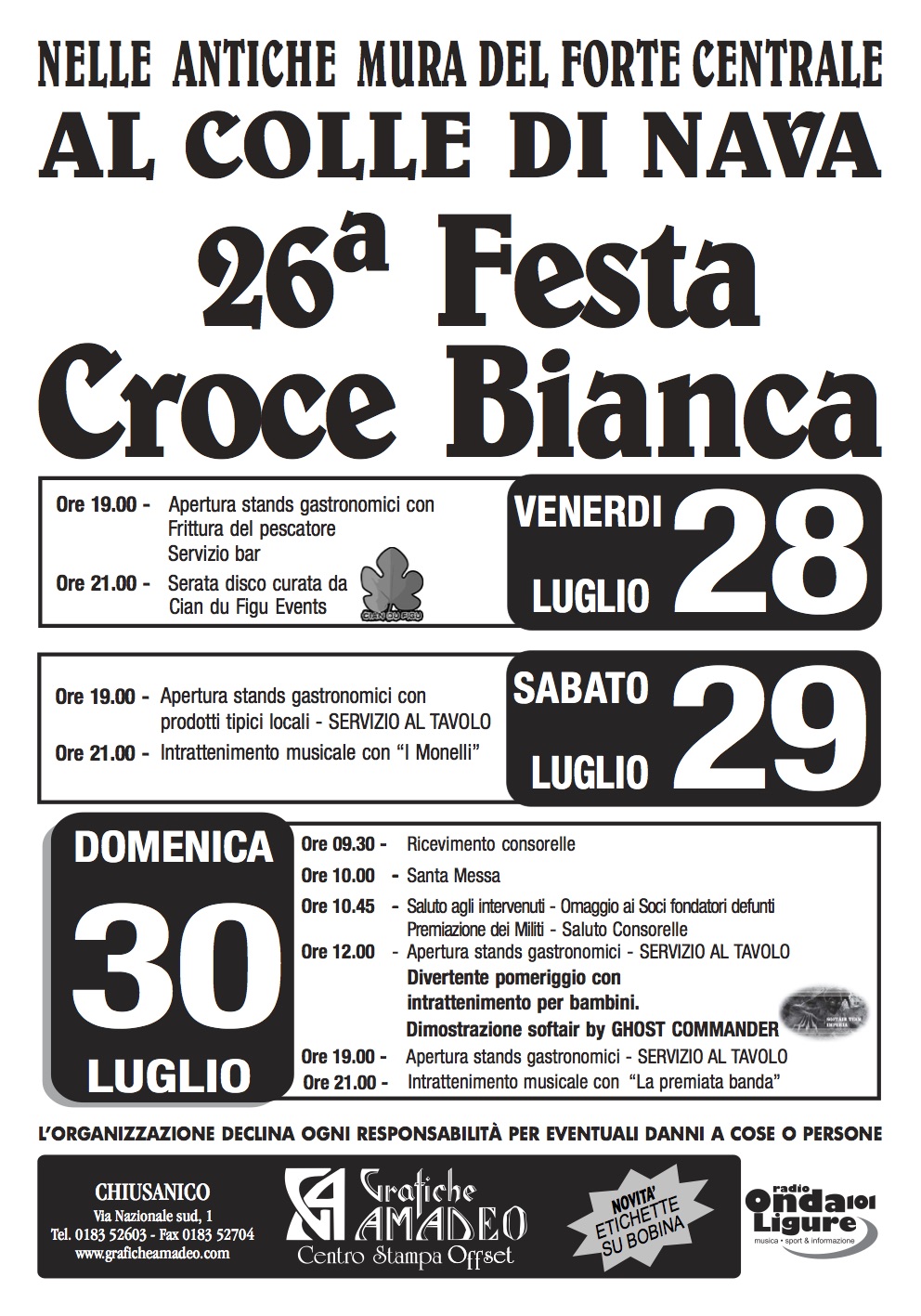 Col di Nava. Ai blocchi di partenza la Festa della Croce Bianca di Pornassio, inizierà venerdì 28 luglio, per terminare domenica sera 30 luglio. Arrivata alla 26 ° edizione è un magnifico ritrovo sia all’interno che all’esterno del forte di Nava, ci si potrà intrattenere