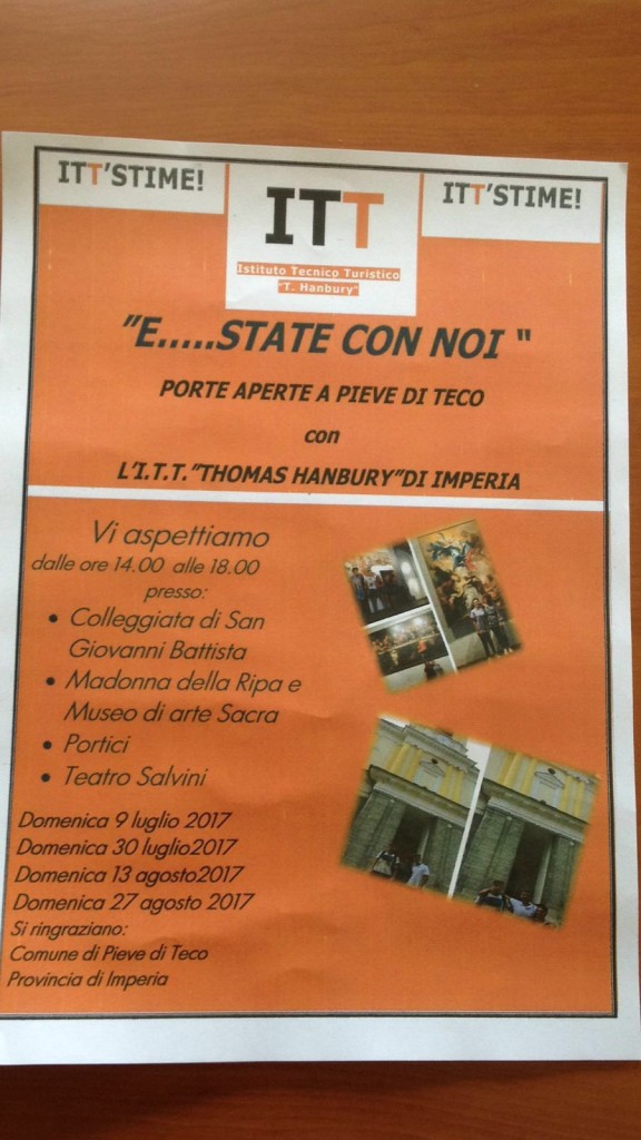 Anche domenica 30 luglio 2017 gli alunni dell’Istituto Tecnico Turistico T.Hanbury hanno accolto nei siti storico-artistici di Pieve di Teco, turisti italiani e stranieri, visitatori occasionali, curiosi. Tutti hanno espresso apprezzamento per l‘iniziativa di alternanza Scuola lavoro “E…state con noi” porte aperte a Pieve di Teco.
