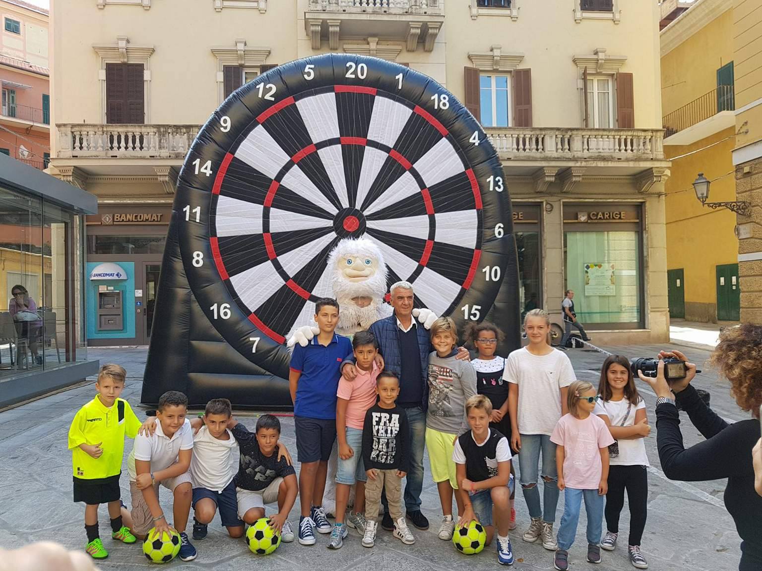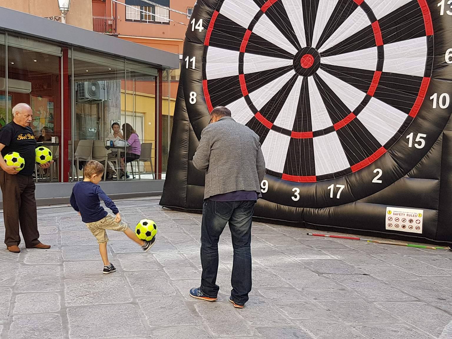 Grande entusiasmo oggi in via Cascione per i festeggiamenti di San Maurizio. In piazza F.lli Serra è stata allestita una struttura gonfiabile che riproduce un grande bersaglio da freccette. Per giocare bisogna calciare un pallone in velcro e cercare di farlo “appiccicare” il più vicino possibile al centro del bersaglio.