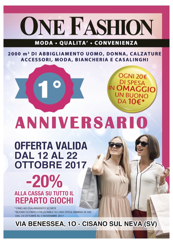 Cisano sul Neva (SV). One Fashion, in via Benessea 10 nell’immediato entroterra di Albenga compie un anno e vi invita a conoscere tutte le offerte presenti in negozio.