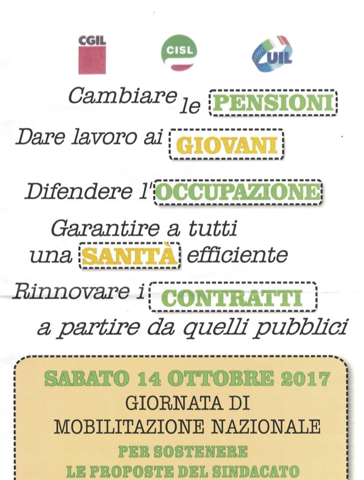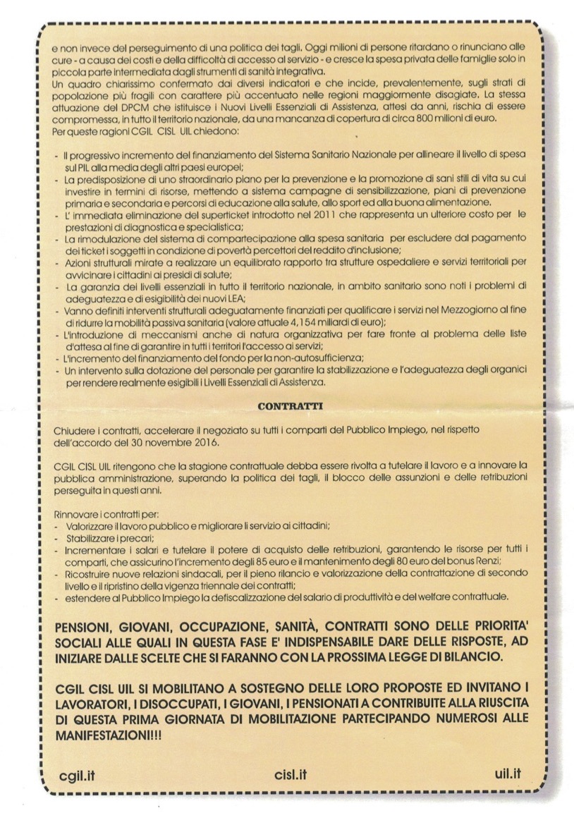 “Siamo in milioni sulle piazze italiane, i temi della piattaforma di questo documento sono temi unitari. Il tema della sanità non è il tema di nuovi ospedali ma significa la presa in carico del paziente, del disabile, dell’assistenza domiciliare per cui crediamo che in un Paese si vive più a lungo e si invecchia ci siano nuovi e diversi bisogni. I contratti collettivi del pubblico impiego e della scuola non vengono rinnovati, della scuola sono 8 anni, del pubblico impiego (Comuni, regioni ed enti locali) sono 7 anni. Vogliamo completare la fase due della riforma pensionistica, i primi risultati dell’APE SOCIAL non sono stati ottimali perché l’inps che doveva attuare questo accordo ha posto dei paletti molto rigidi, c’è ancora un confronto aperto tra il Governo e l’Inps. Abbiamo un problema nell’accesso del mondo del lavoro per i giovani, abbiamo un problema che deve pensare non solo a dare gli incentivi alle imprese ma che deve realizzare un piano di politica industriale. Quando noi non riusciamo a difendere le nostre realtà produttive avremo un problema occupazionale e le risorse dello stato ufficiale andranno a diminuire aumenteranno le fasce deboli in un contesto che è drammatico. Un sindacato attento, riformista, che scende in piazza porta avanti le proprie istanze, vuol far capire che noi non vogliamo contrastare il Governo ma vogliamo insieme anche al mondo delle imprese creare un nuova e più moderna occupazione”.