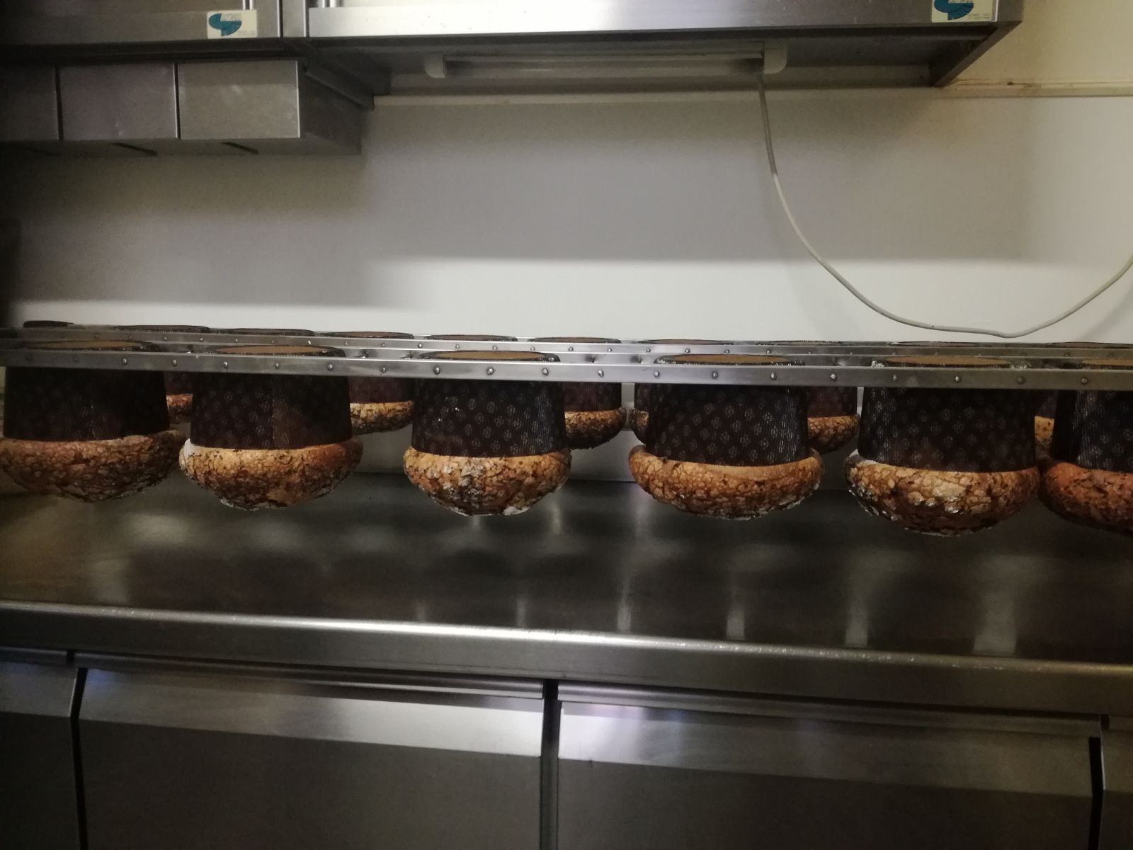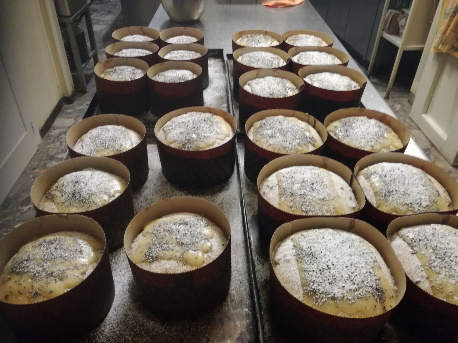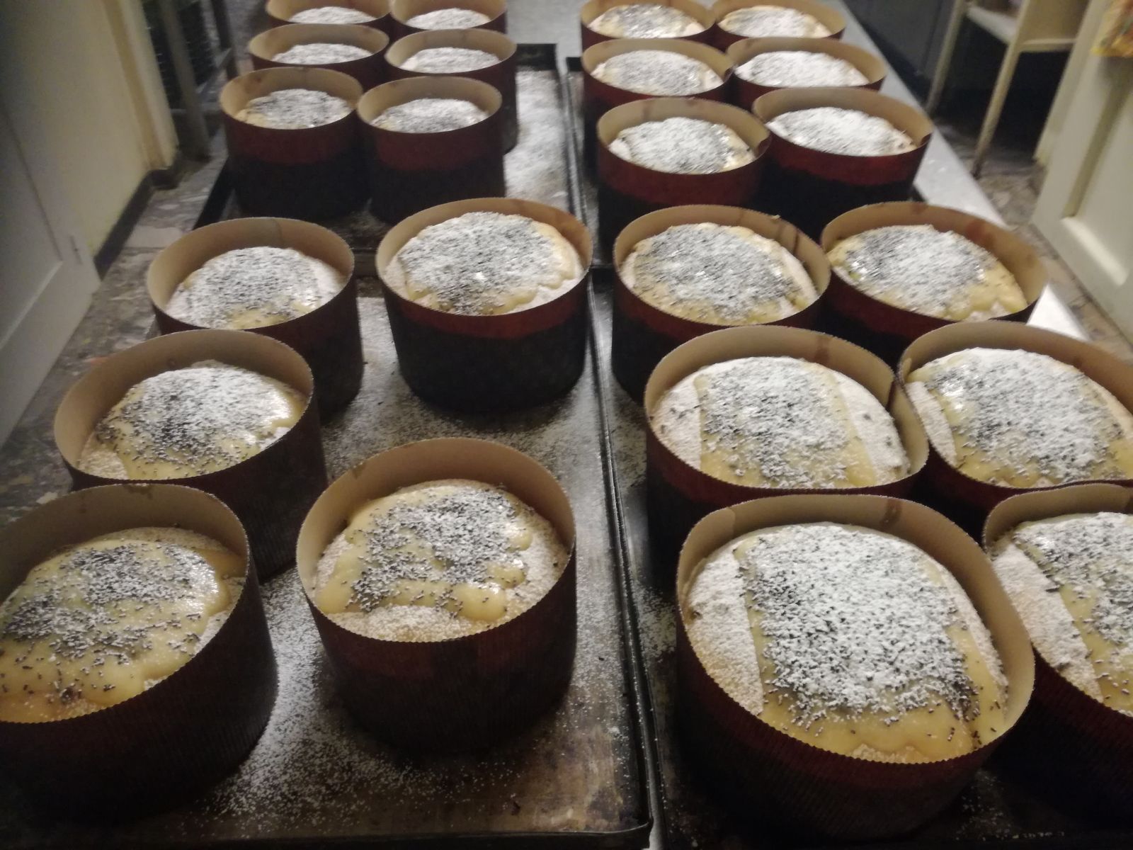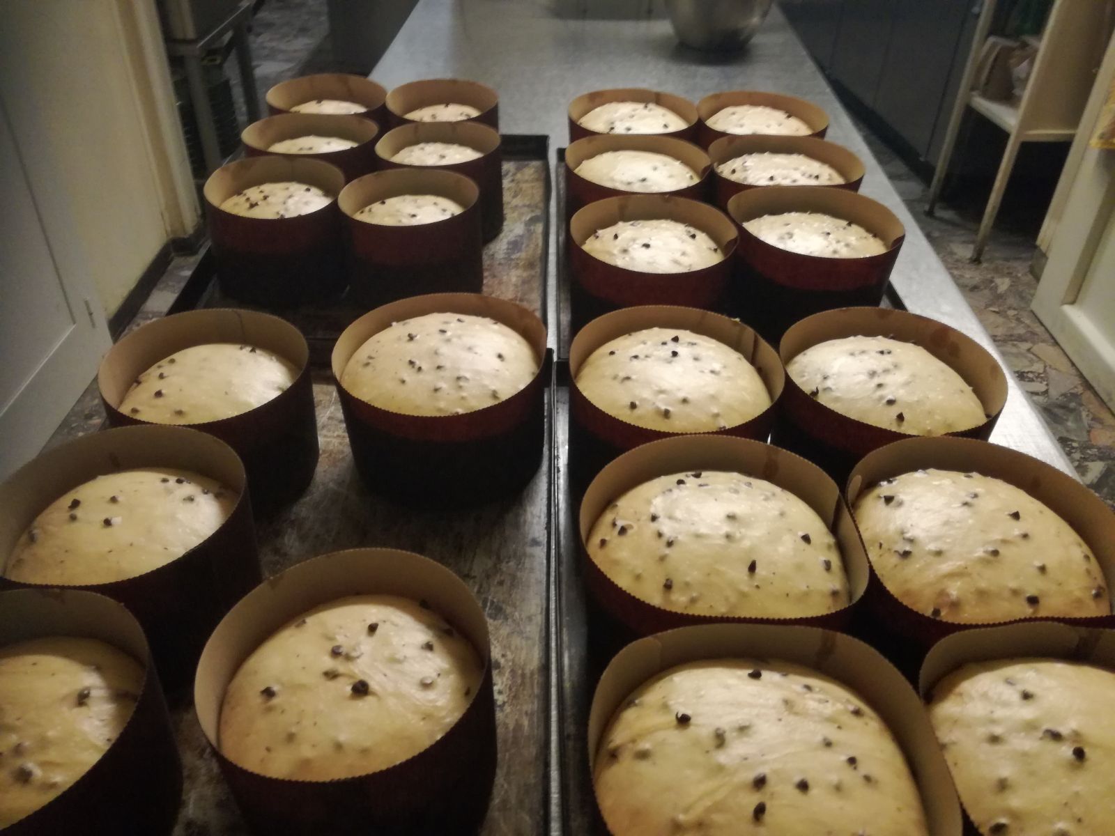 Fra i Panettoni, impastati nel laboratorio in questi giorni è possibile scegliere fra quelli classici, solo con uvetta senza canditi, oppure con gocce di cioccolato e per finire con i marron glacé . Il loro impasto viene preparato in versione neutra la sera, e la mattina dopo viene personalizzato con zucchero, uova e/o canditi e cioccolato.