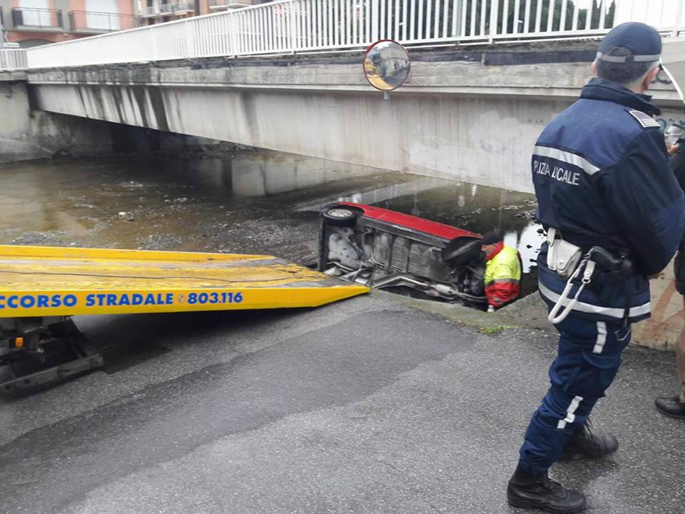 Spettacolare incidente stradale, per fortuna senza gravi conseguenze, questo pomeriggio a Diano Marina. Per cause ancora in fase di accertamento, forse per l’asfalto reso viscido dalla pioggia, un 30enne, mentre percorreva l’argine destro del torrente Evigno, ha perso il controllo della propria auto, finendo nel torrente e cappottandosi. L’incidente è avvenuto nei pressi del ponte dell’ex ferrovia.