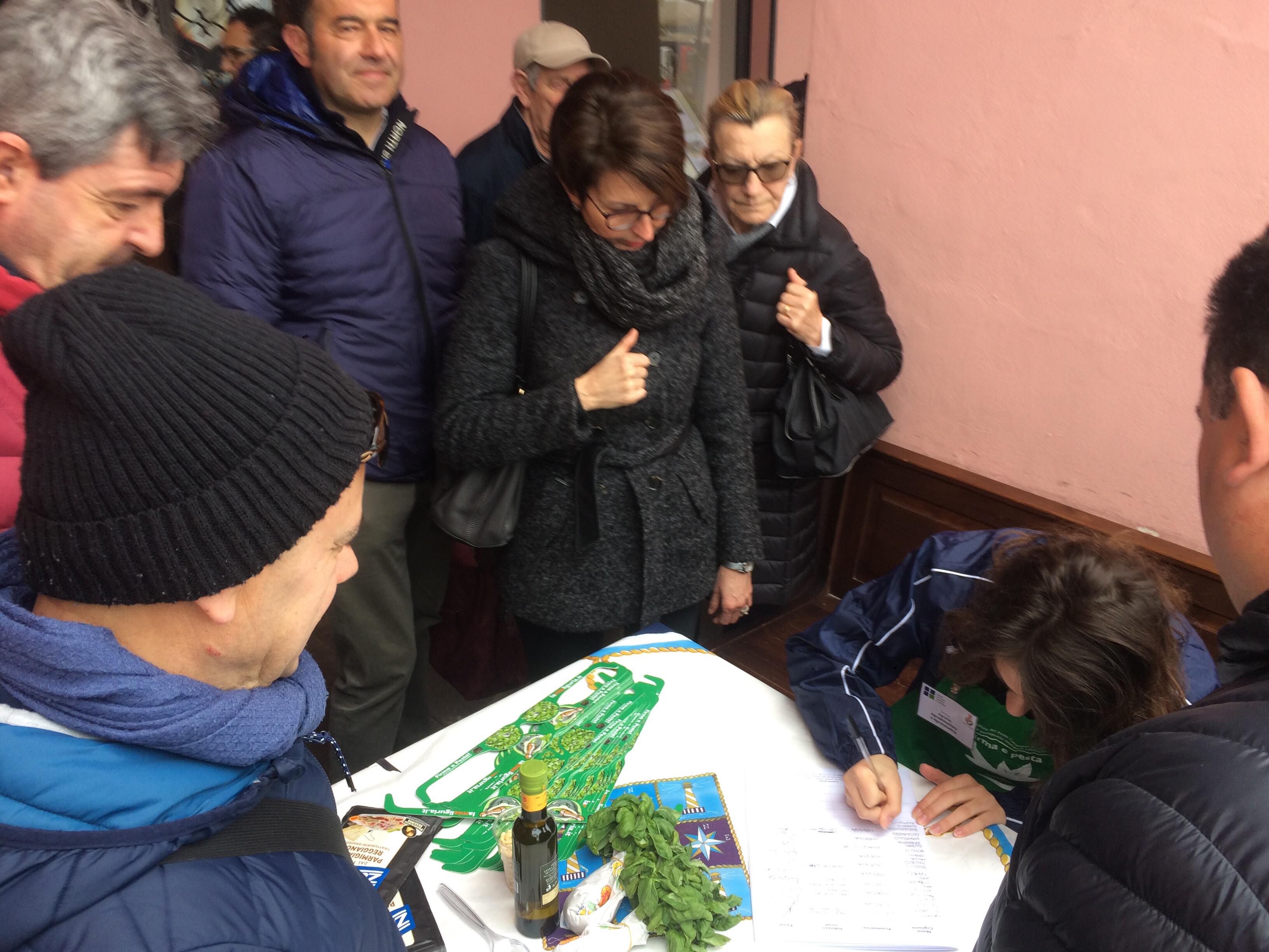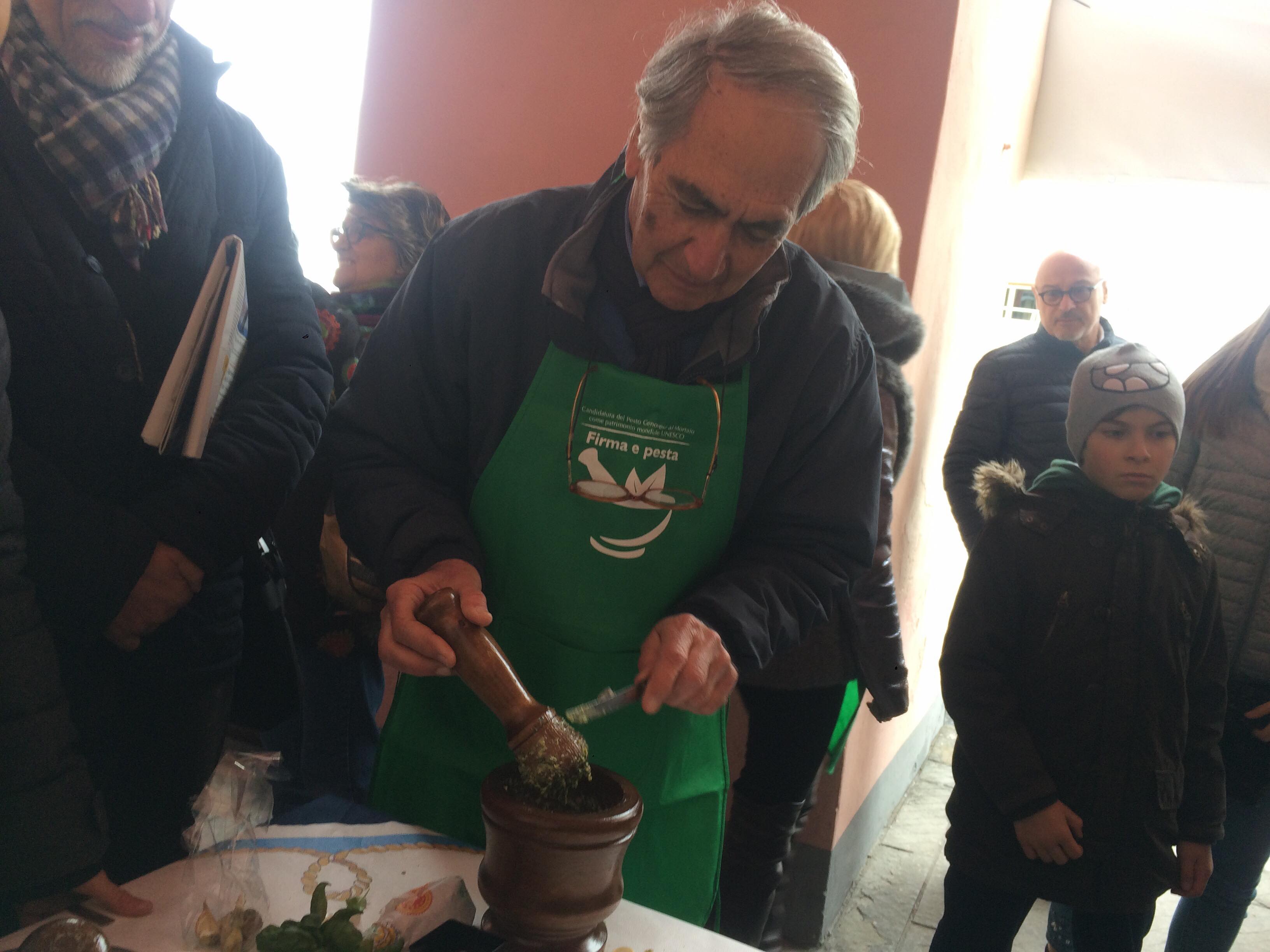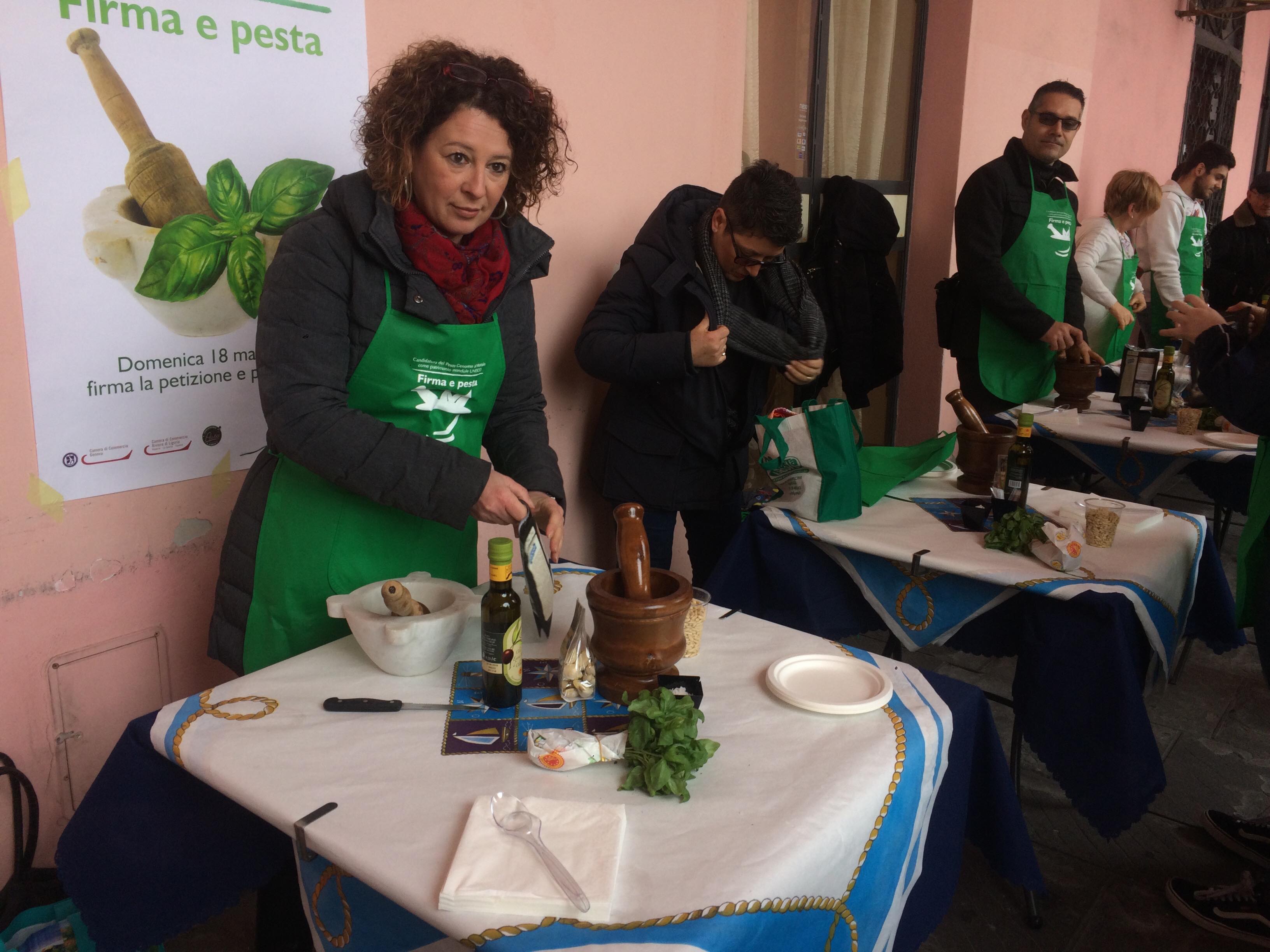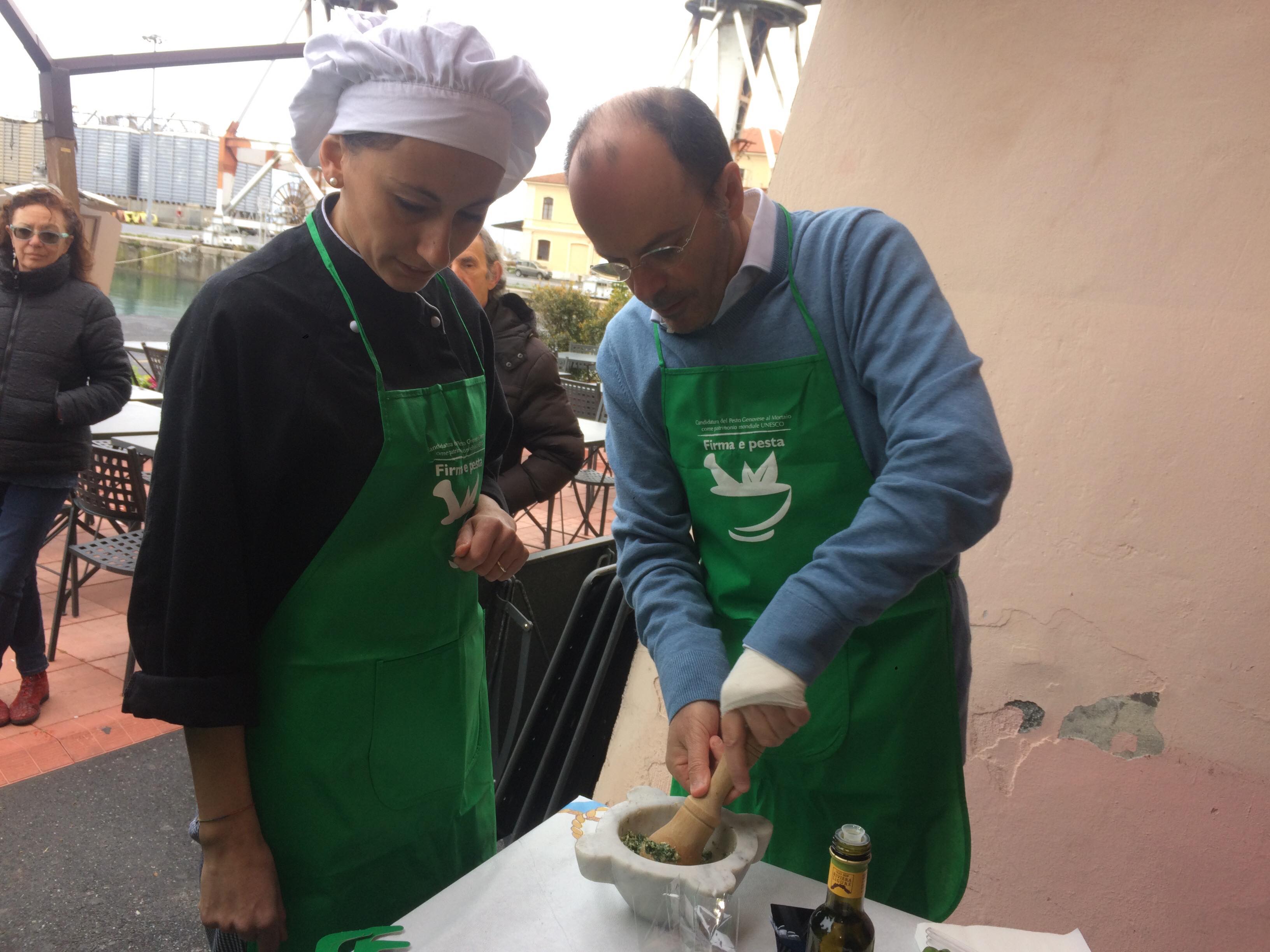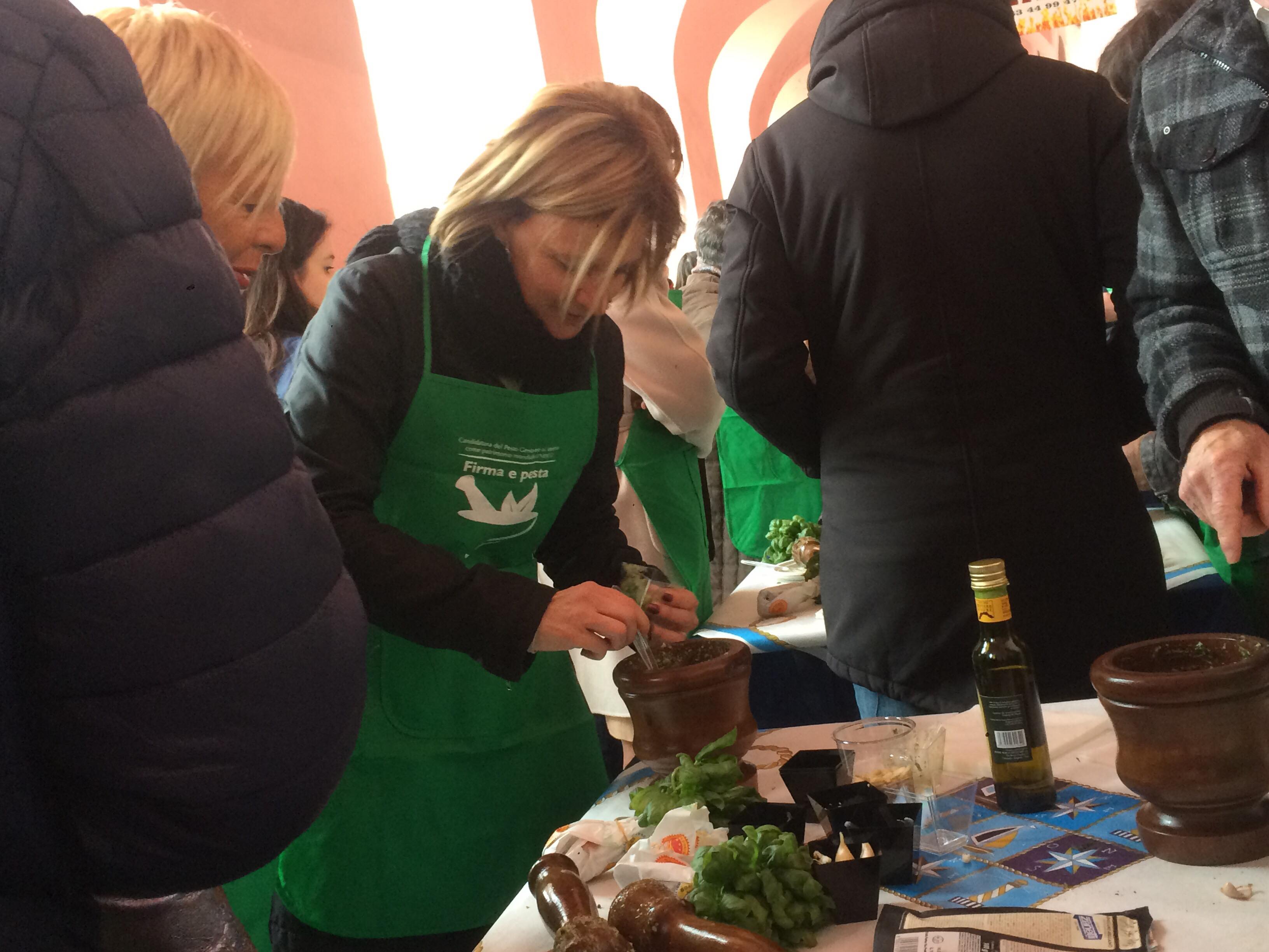 L’iniziativa consiste nel far diventare il pesto e il mortaio patrimonio dell’UNESCO per valorizzare la nostra regione. Noi sosteniamo queste iniziative. Oggi siamo qui in banchina fino a mezzogiorno. Ci sono i nostri cuochi, il gruppo dei cuochi InejaFood che si distribuiscono per aiutare le persone che vengono qui a firmare e a pestare”.