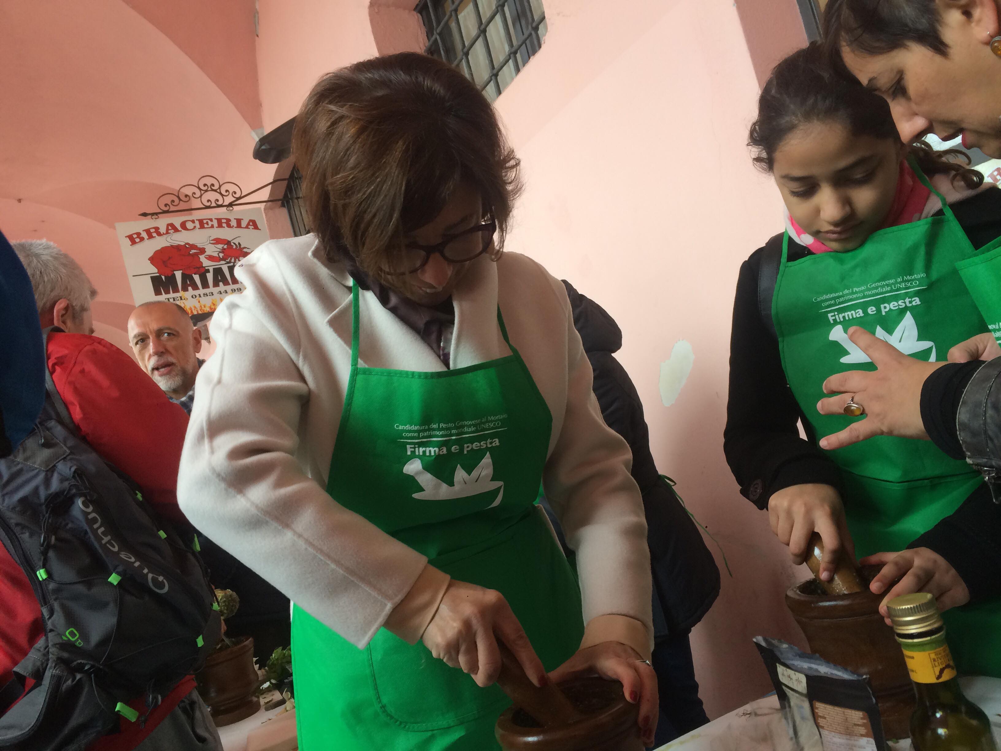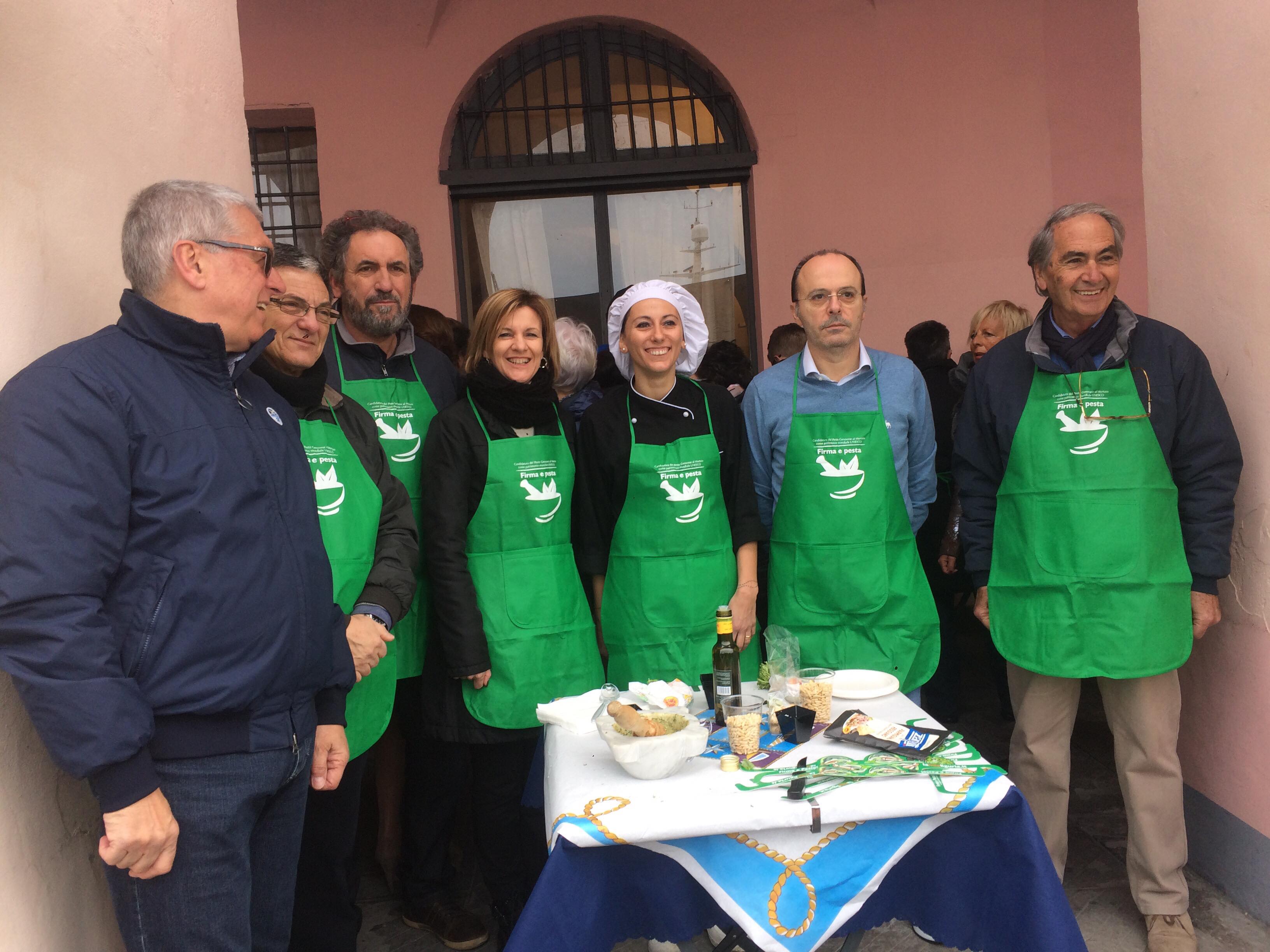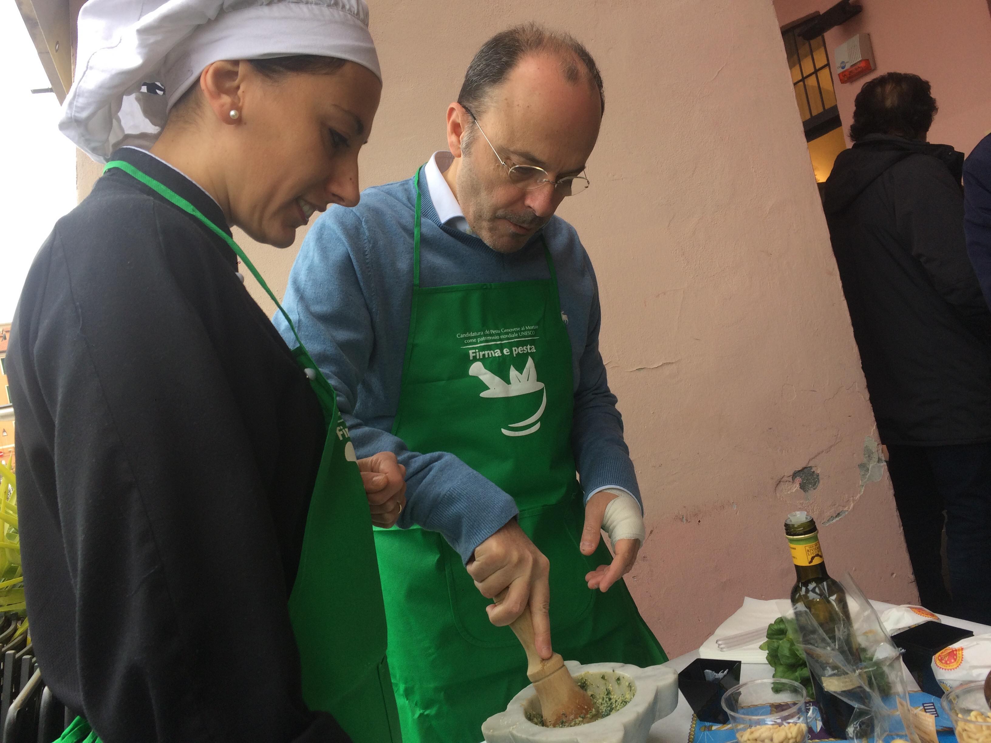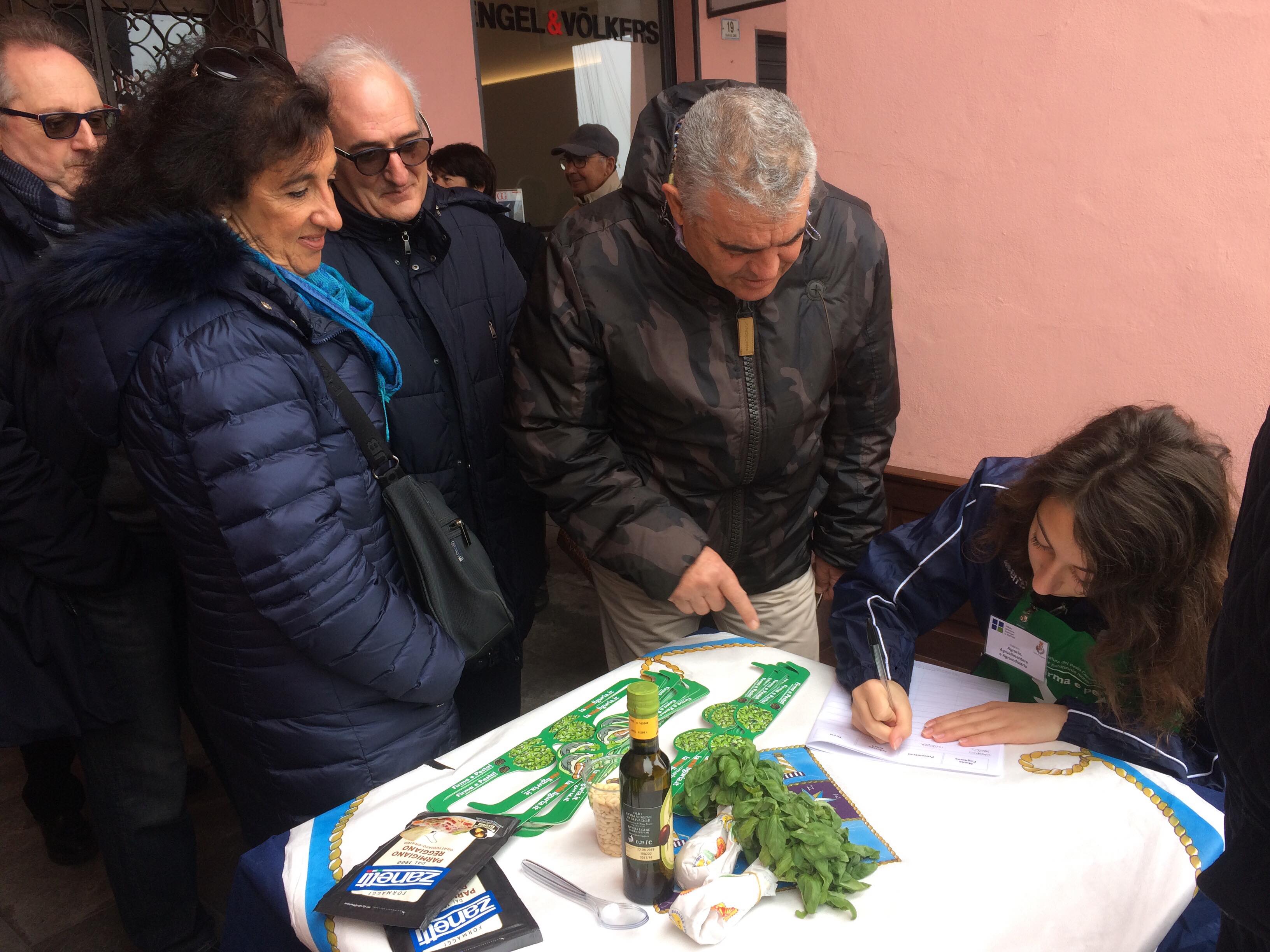 L’iniziativa consiste nel far diventare il pesto e il mortaio patrimonio dell’UNESCO per valorizzare la nostra regione. Noi sosteniamo queste iniziative. Oggi siamo qui in banchina fino a mezzogiorno. Ci sono i nostri cuochi, il gruppo dei cuochi InejaFood che si distribuiscono per aiutare le persone che vengono qui a firmare e a pestare”.