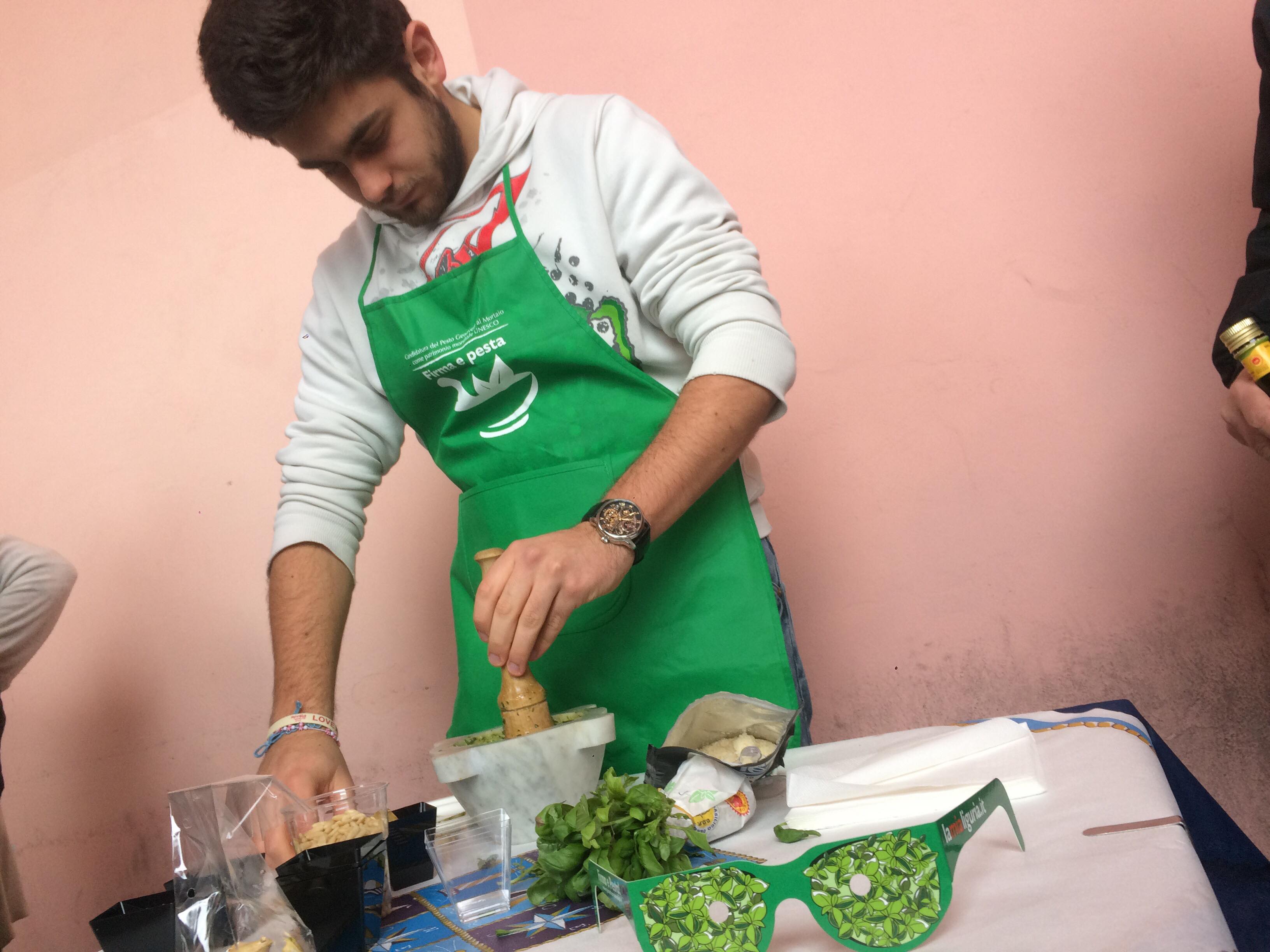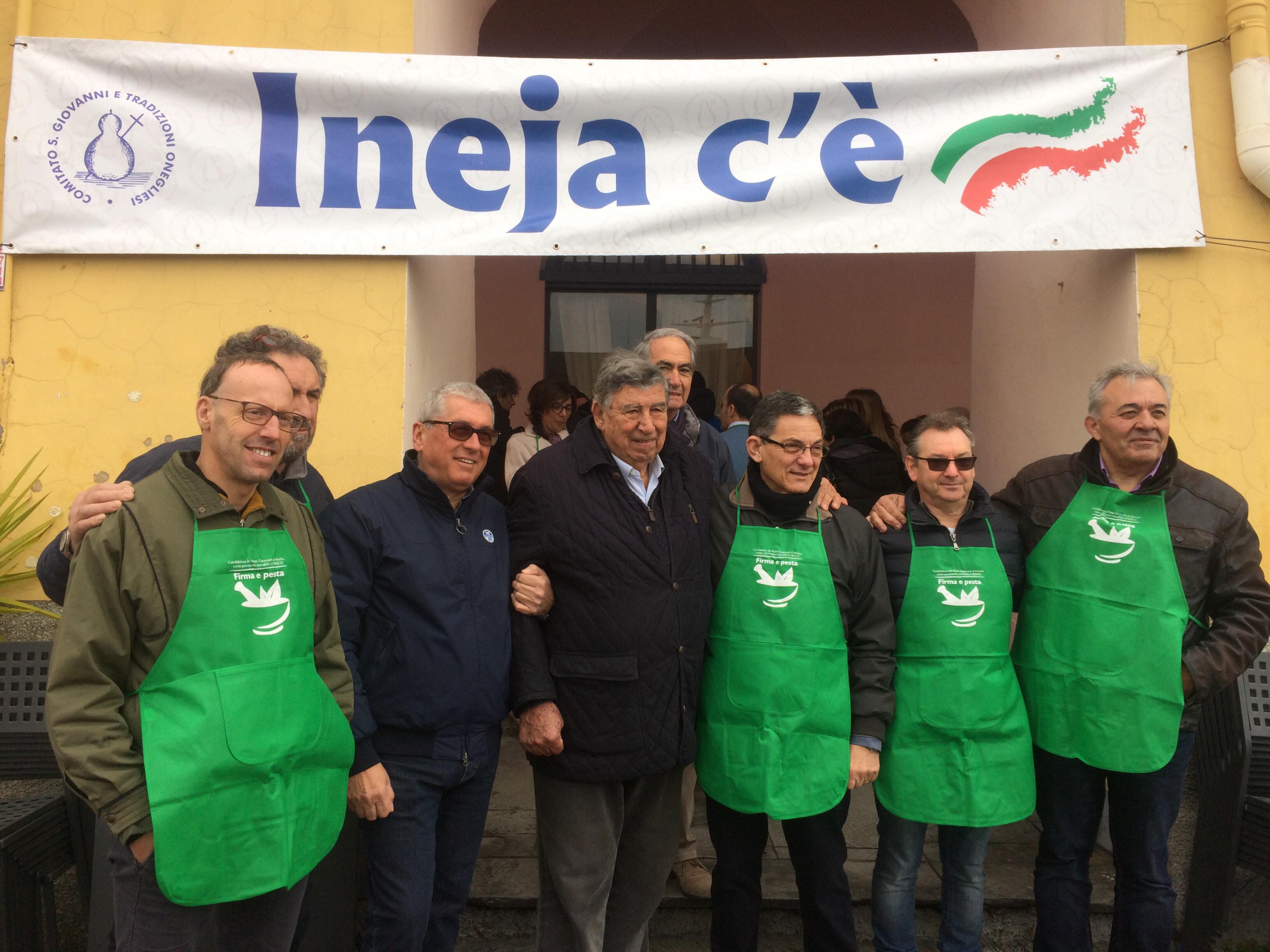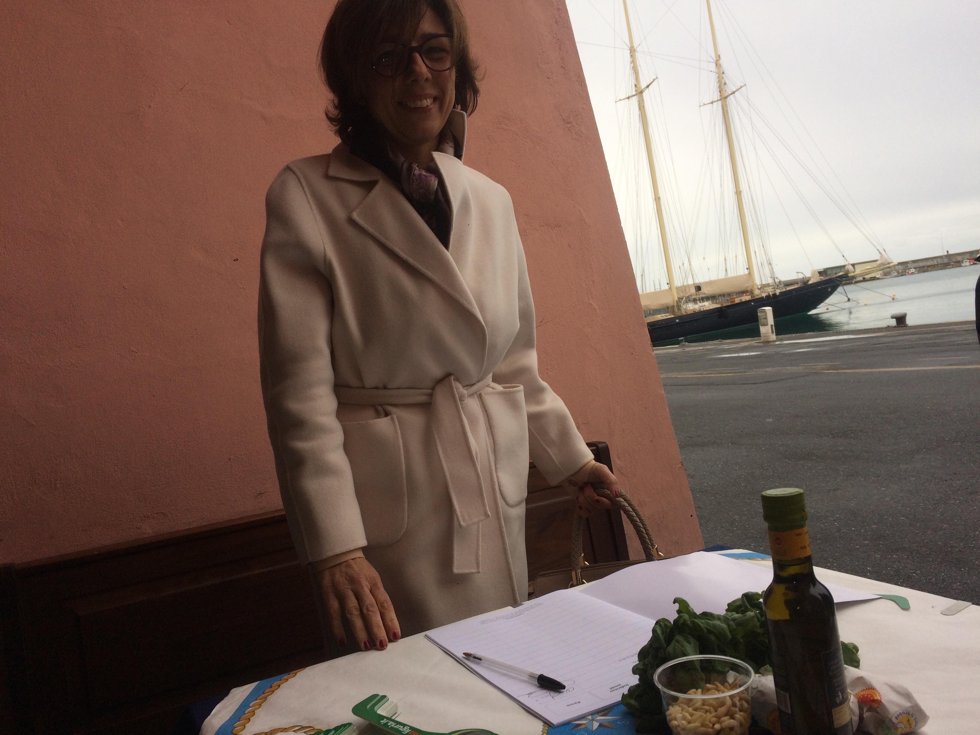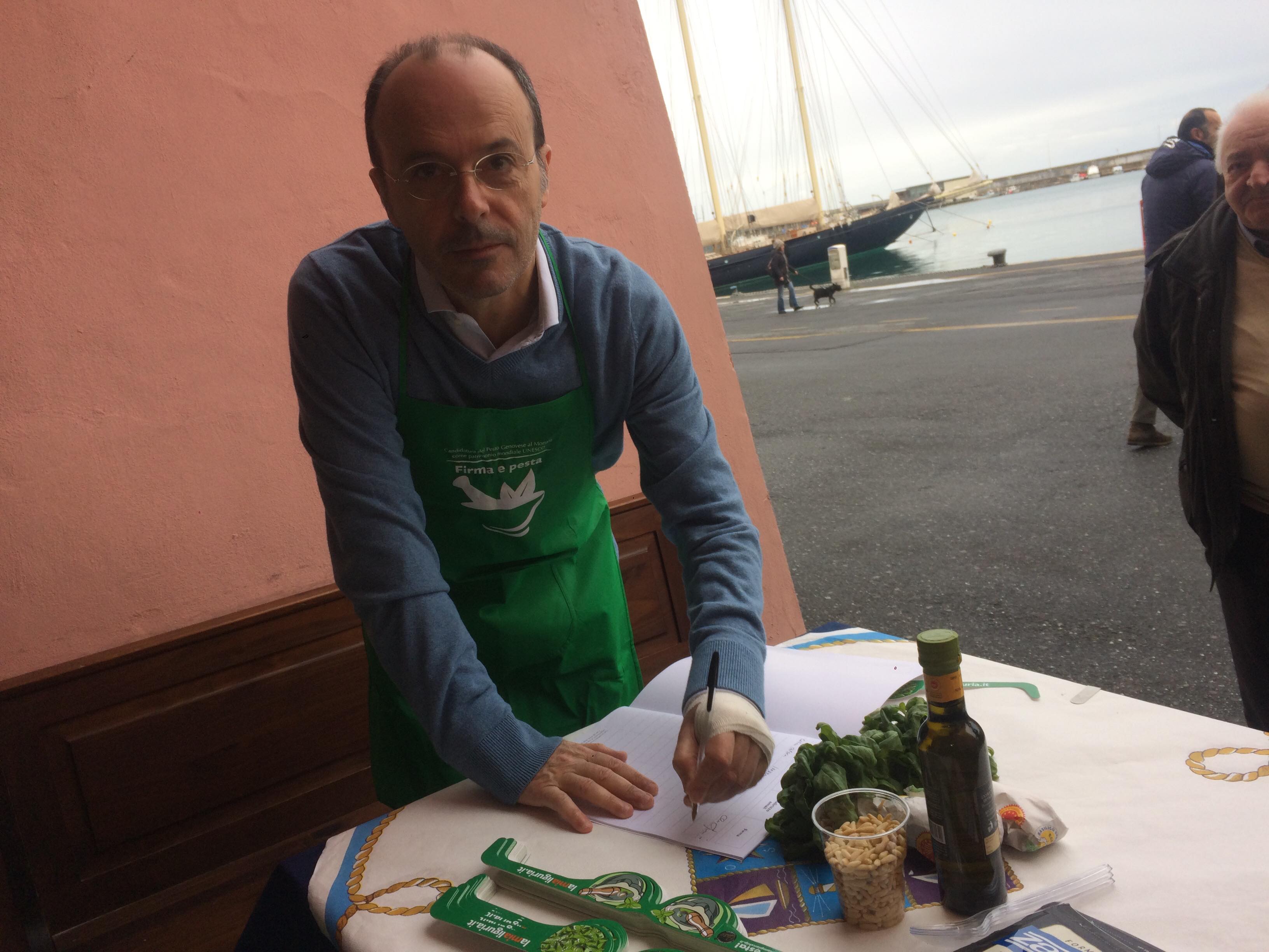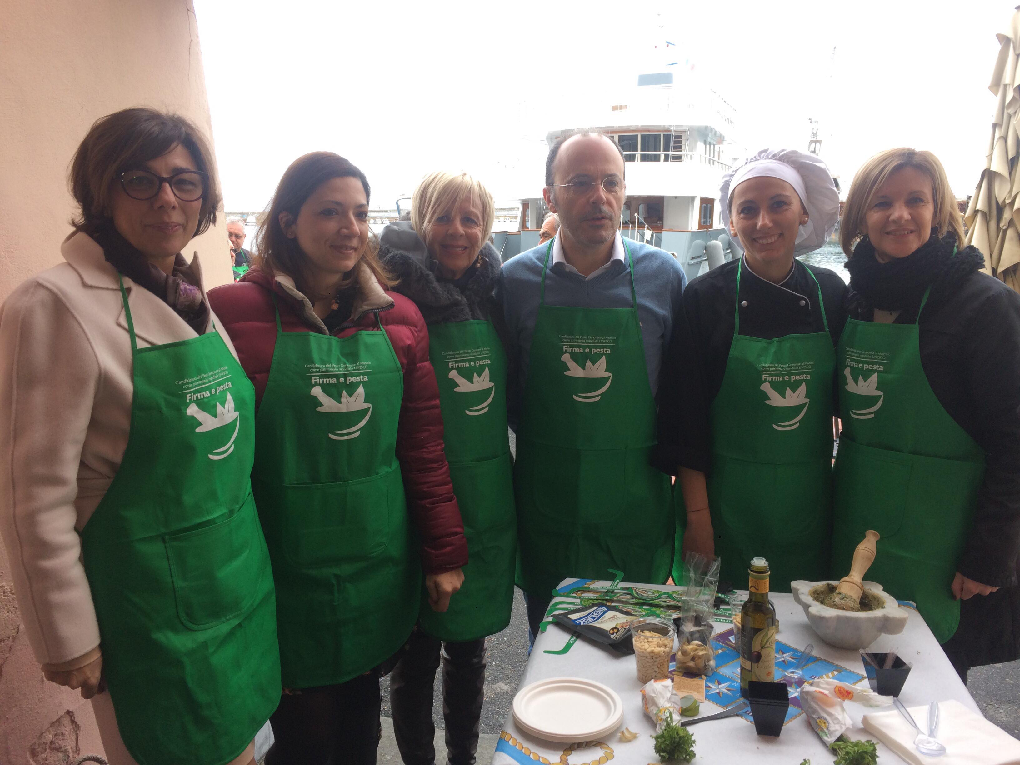 L’iniziativa consiste nel far diventare il pesto e il mortaio patrimonio dell’UNESCO per valorizzare la nostra regione. Noi sosteniamo queste iniziative. Oggi siamo qui in banchina fino a mezzogiorno. Ci sono i nostri cuochi, il gruppo dei cuochi InejaFood che si distribuiscono per aiutare le persone che vengono qui a firmare e a pestare”.