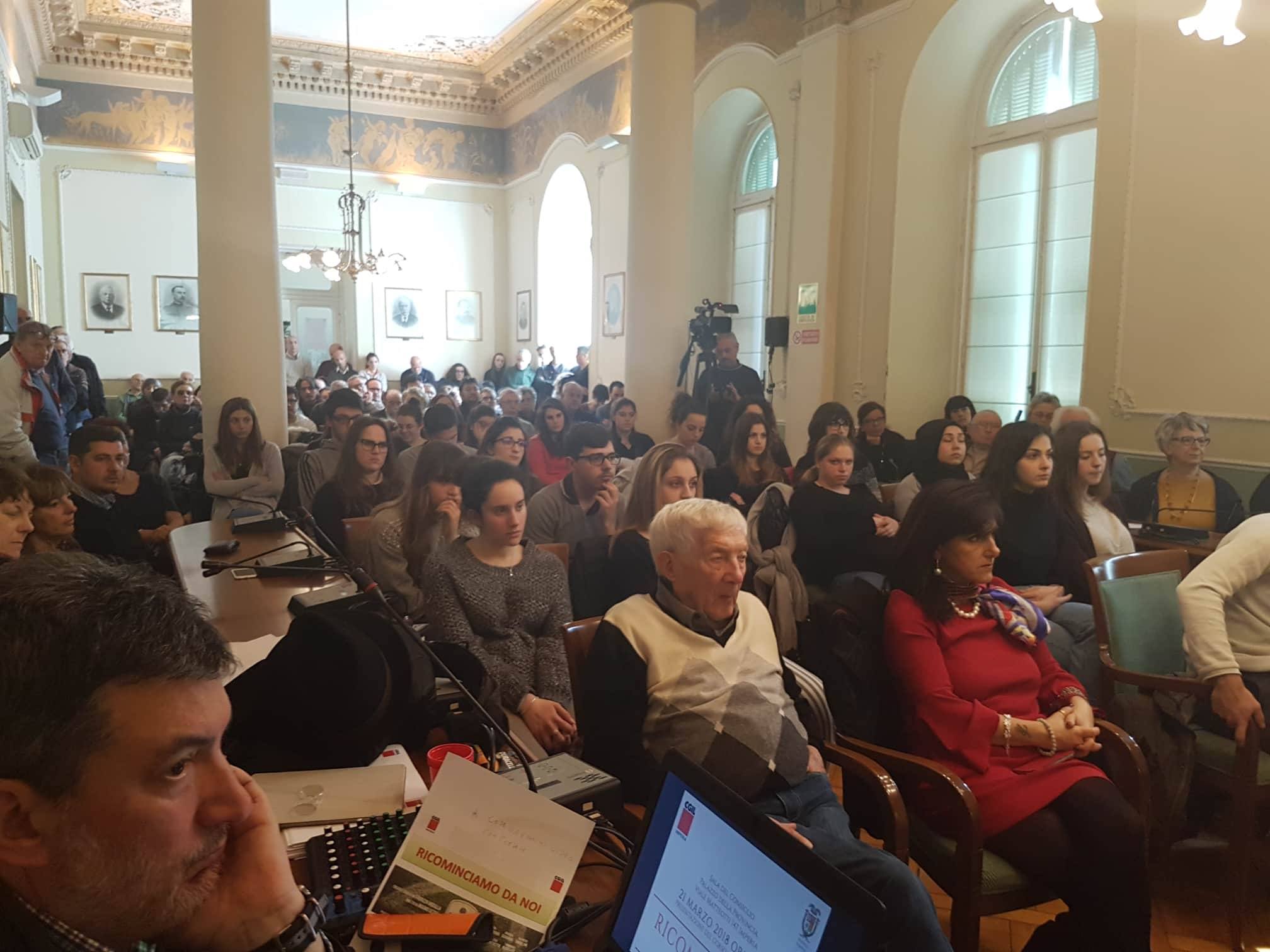 Presenti la responsabile della formazione Cgil Liguria Cristiana Ricci, il Segretario generale Cgil Liguria Federico Vesigna, il segretario generale Camera del Lavoro Imperia Fulvio Fellegara, la rappresentante degli Studenti Medi Camilla Pelosi, il sindaco di Imperia Carlo Capacci Sindaco e il presidente della Provincia Fabio Natta.