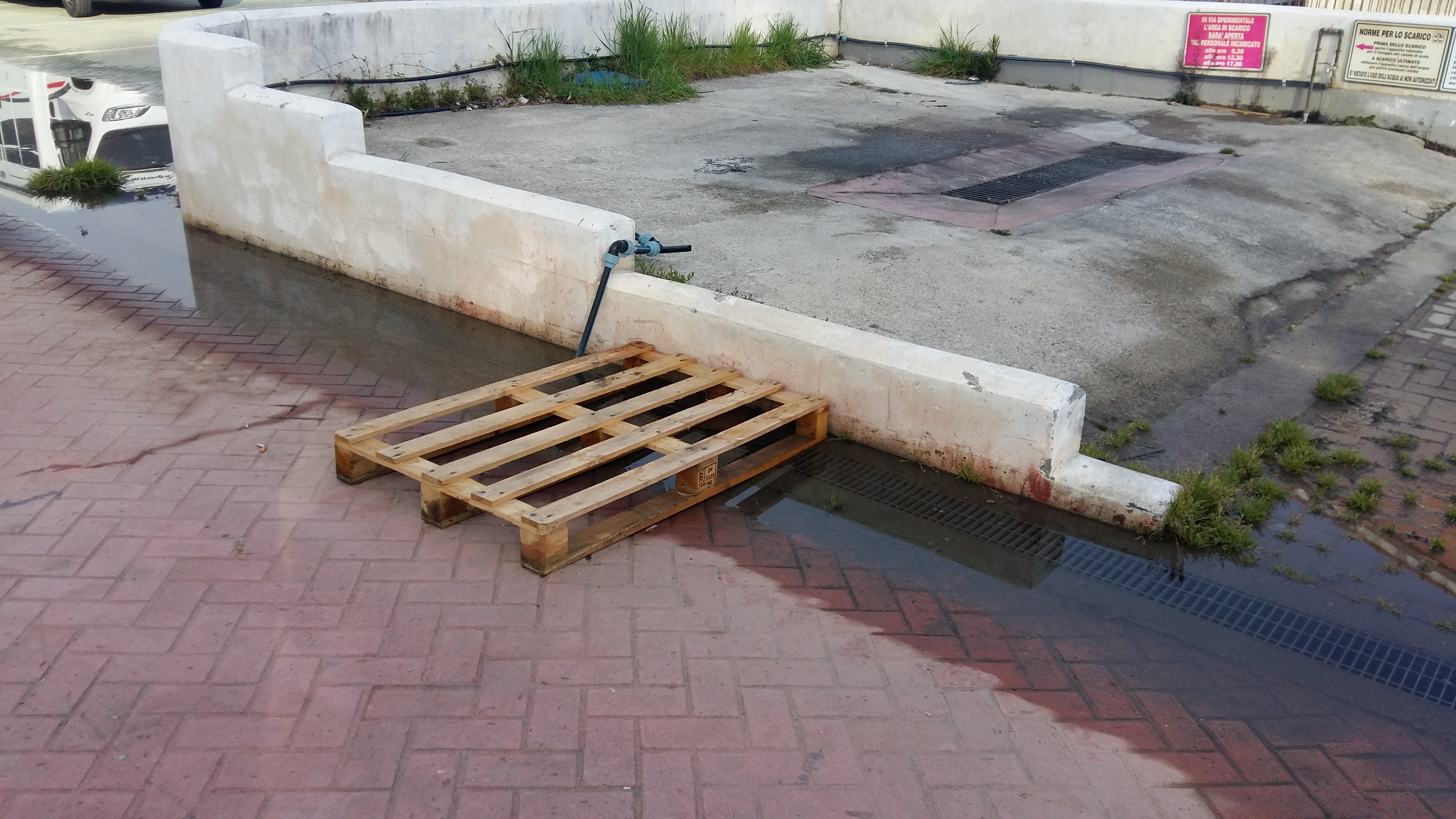 Ieri sera rientrando accompagnati al camper abbiamo trovato tutto il parcheggio inondato di acqua mescolata a scarichi provenienti dal basso. Mio marito è riuscito a richiudere il tubo e fermare il flusso d’acqua.