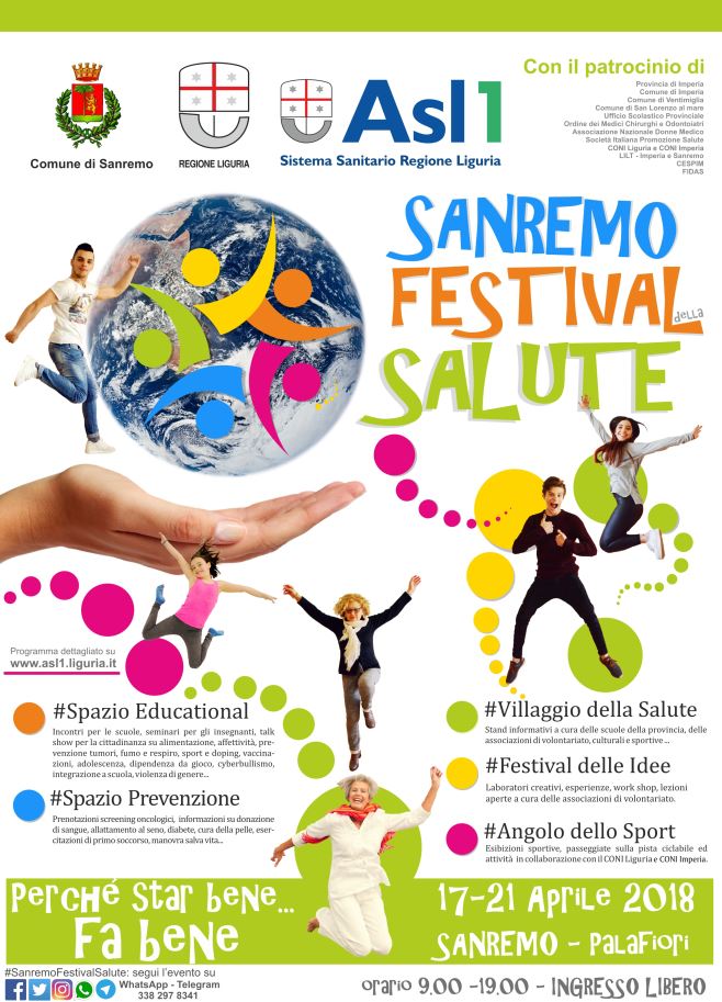 Riapre i battenti il “Sanremo Festival della Salute”, evento di promozione del benessere e degli stili di vita sani, organizzato dall’ASL 1 Imperiese insieme al Comune di Sanremo, con il patrocinio della Regione Liguria, che sarà in programma dal 17 al 21 aprile, presso il Palafiori di Sanremo.