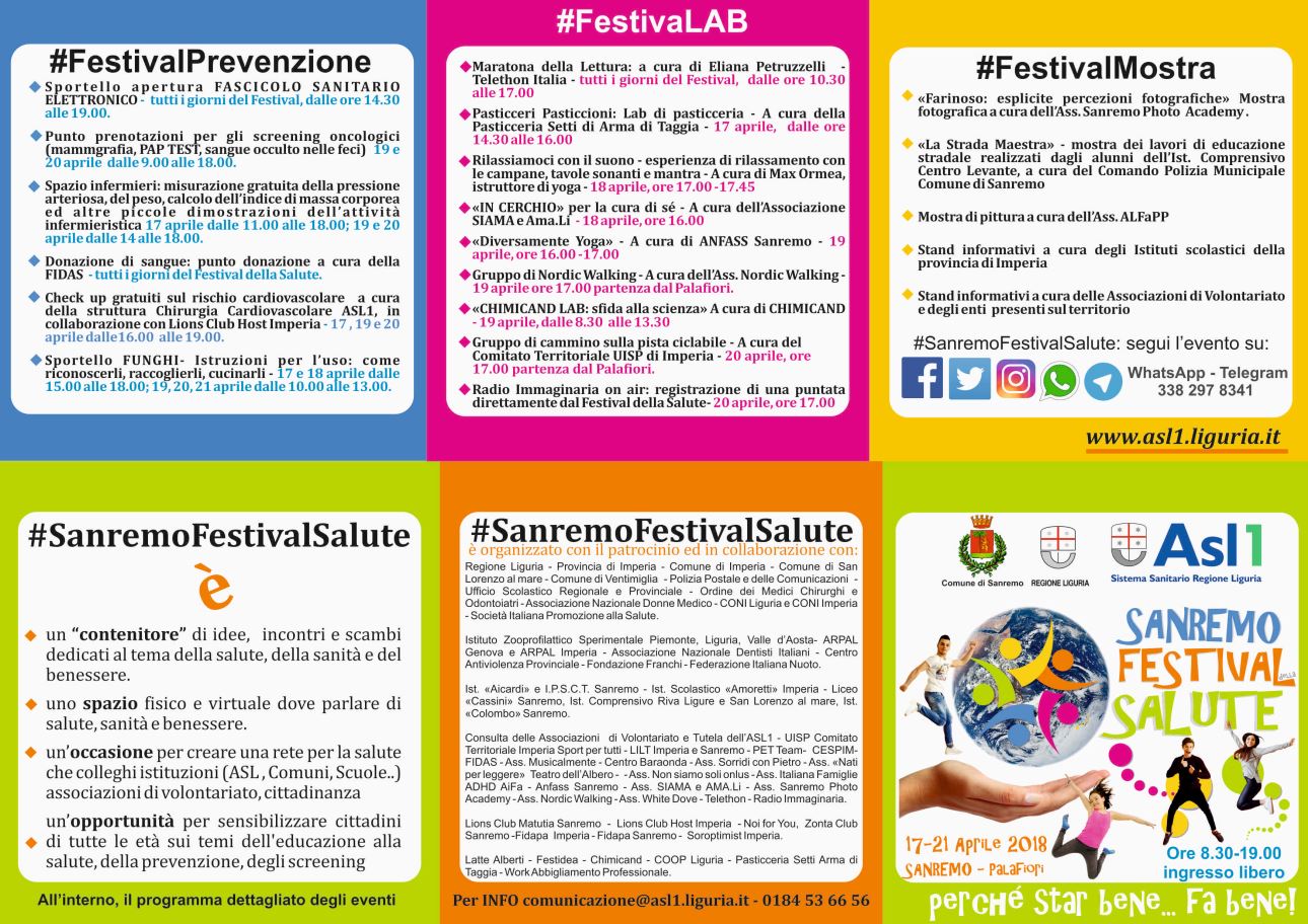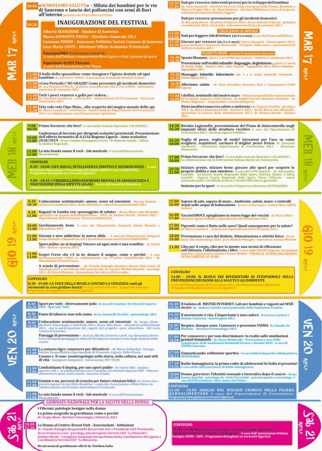 Tutti gli eventi sono ad ingresso gratuito e aperti a tutta la cittadinanza. Agli insegnanti partecipanti verrà consegnato l’attestato di partecipazione valido per i crediti formativi. Per essere aggiornati su tutte le novità del Sanremo Festival Salute: www.asl1.liguria.it o la pagina Facebook www.facebook.com/ASL1Imperiese.