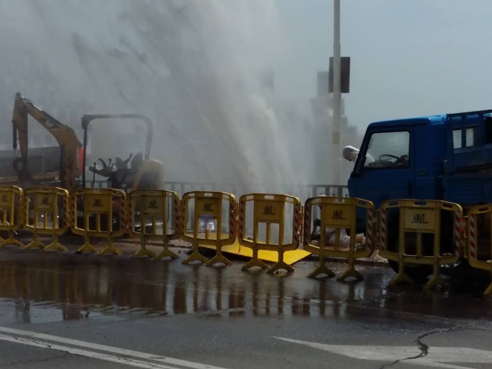 Per consentire le operazioni di riparazione del tubo, sotto al ponte Impero e per arrecare il minimo disagio possibile alle utenze, gli operai dell’Amat hanno operato con l’acqua aperta. Spaccando il marciapiede per raggiungere il guasto, si è alzato un muro d’acqua alto alcuni metri.