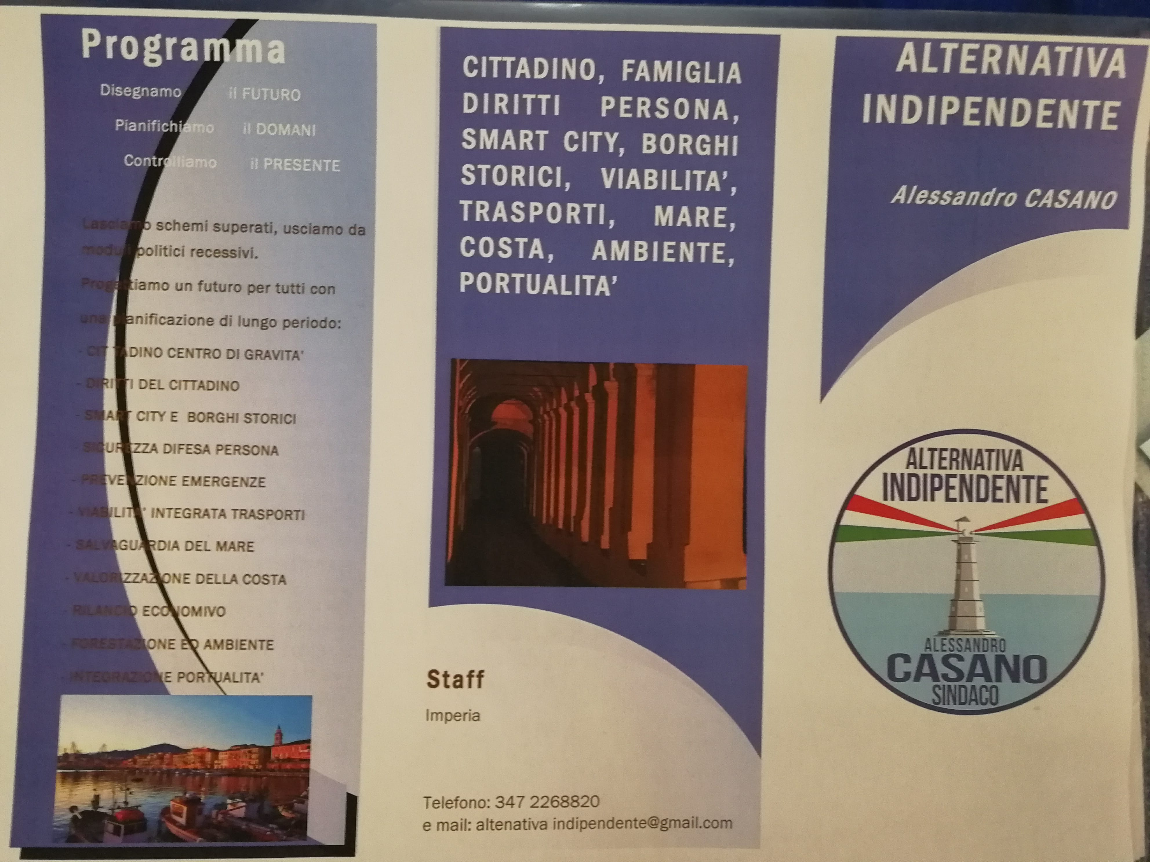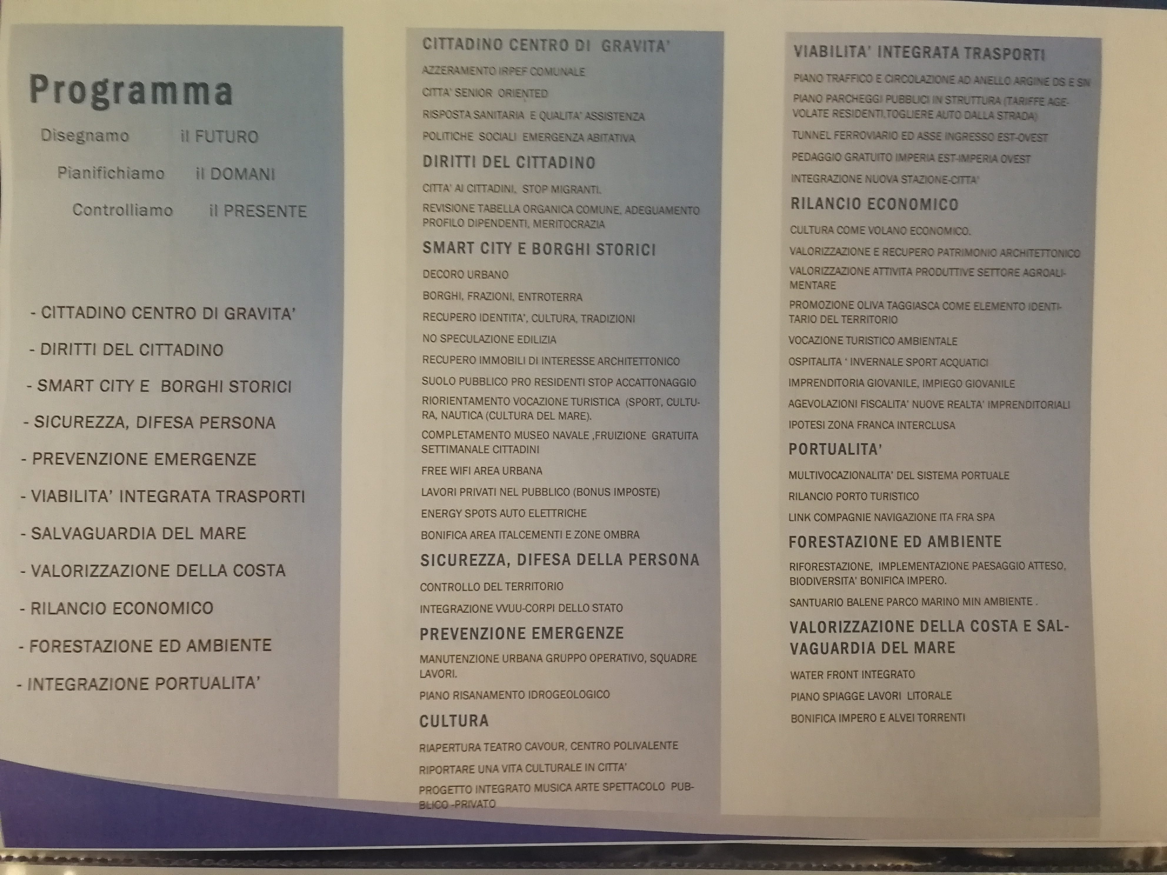 Il nostro simbolo è il faro perché siamo in una città di mare e perché rappresenta il punto di riferimento e la metafora della coerenza. Il faro emette una luce tricolore che testimoniano i nostri valori. Il nostro programma mette al centro il cittadino, la famiglia, i diritti della persona, i borghi storici, il recupero delle identità, viabilità, trasporti, lo sviluppo del mare e della sua cultura e turismo, nautica, sport legati al mare, sviluppo e cura della costa e soprattutto la portualità. Serve un piano di gestione adeguato del porto che abbiamo e che va fatto ripartire, anche se non ho mai nascosto la mia ostilità personale a questo progetto, frutto della famosa legge Burlando, e non è assolutamente il porto che questa città avrebbe meritato”.
