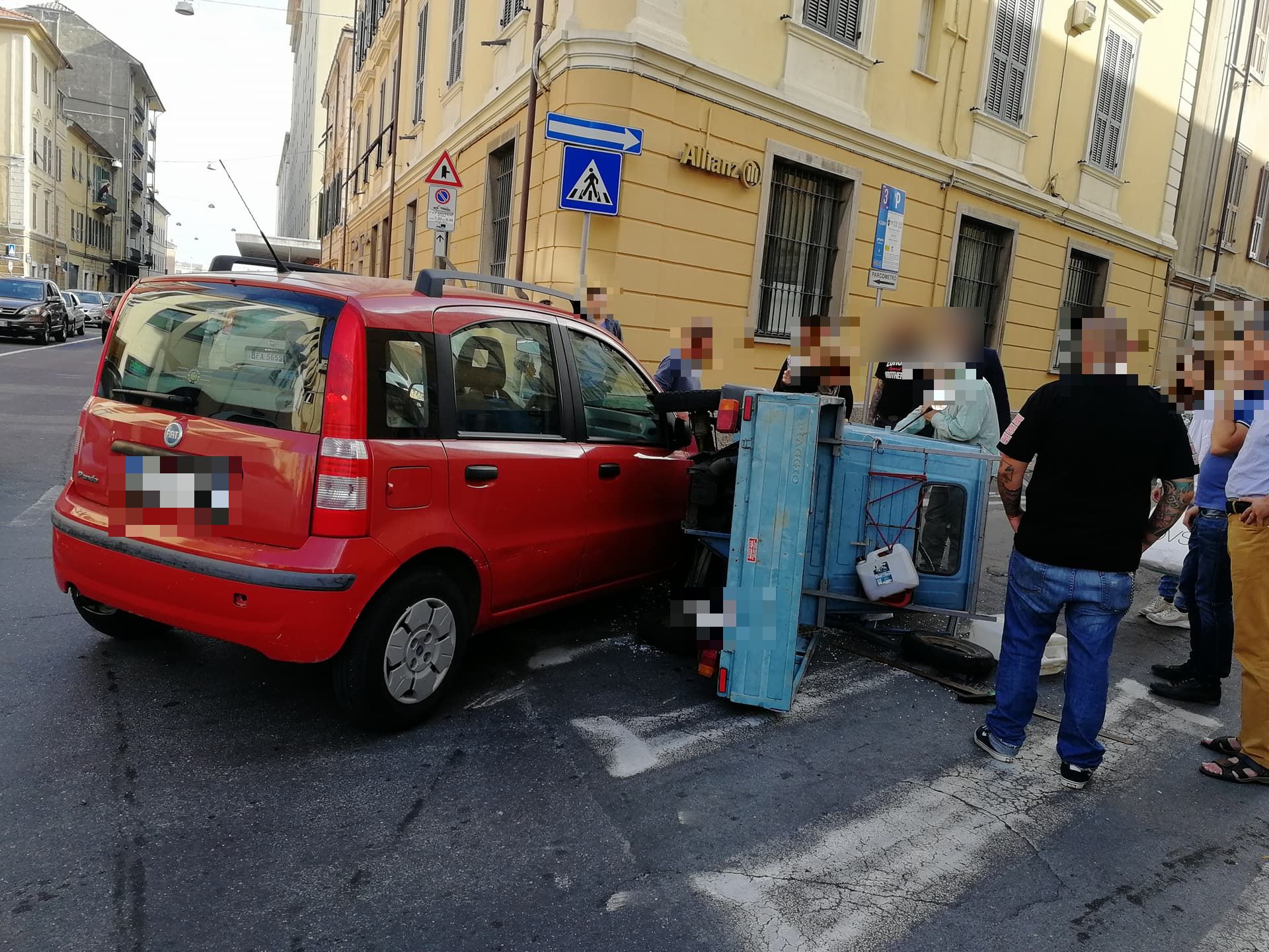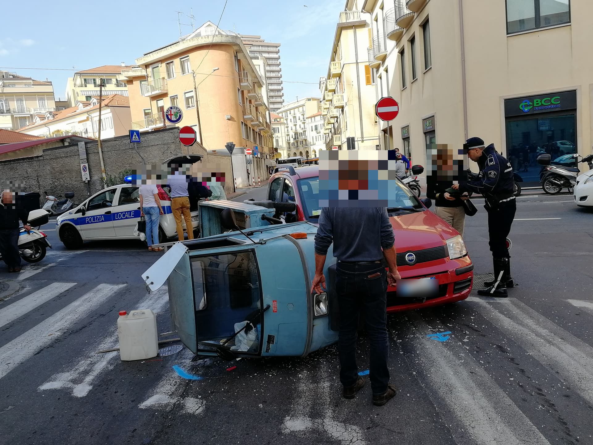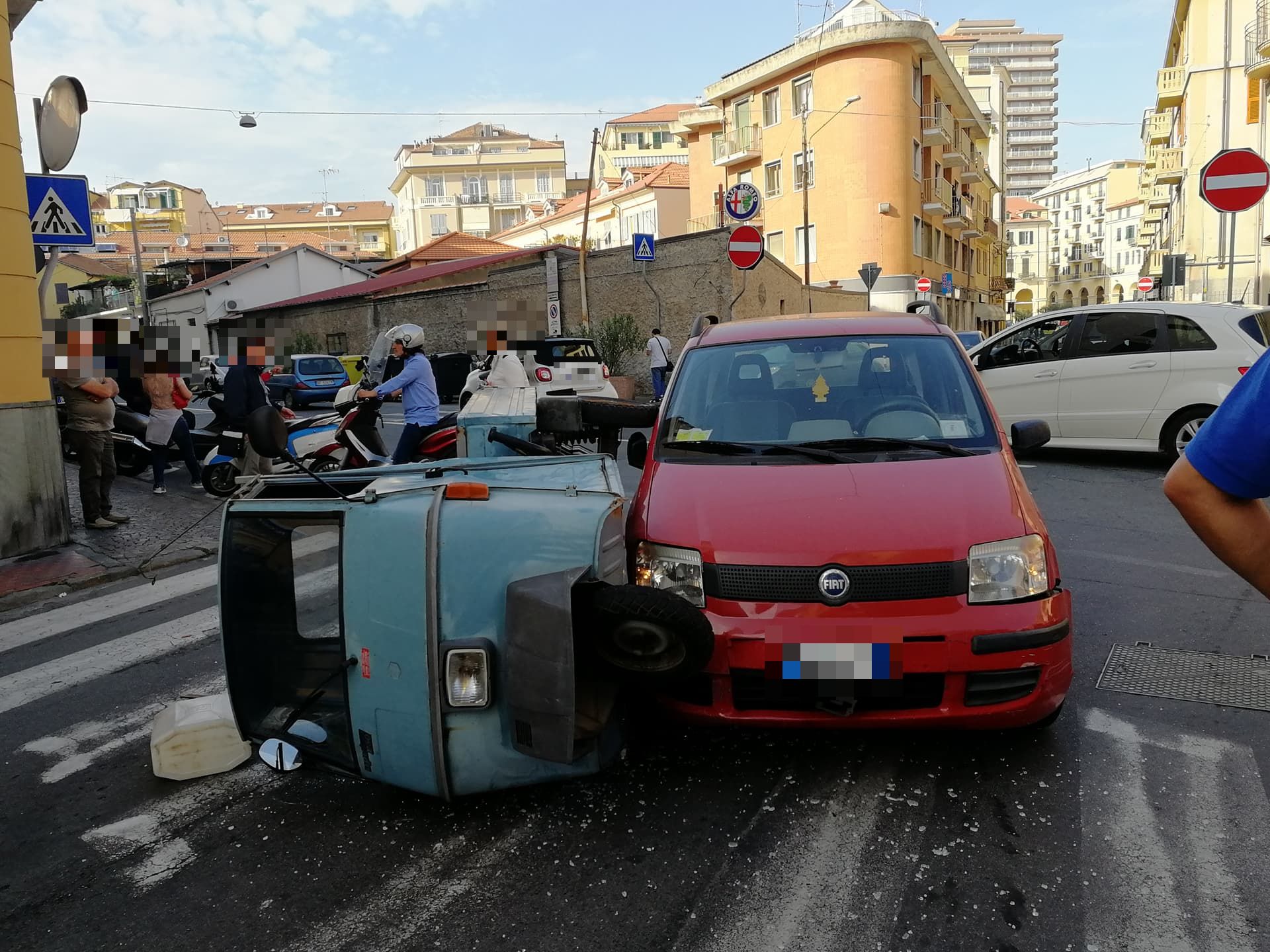 Secondo una prima ricostruzione, un’Ape Piaggio, con a bordo due uomini (il conducente R.B. di 67 anni e il passeggero di circa 70 anni), proveniente da via Schiva e impegnata a svoltare verso Porto Maurizio, si è scontrata, per cause ancora in fase di accertamento, con una Fiat Panda, condotta da una donna, 72enne, proveniente da via Alfieri, anch’essa diretta verso Porto Maurizio. L’Ape, a causa dell’impatto, si è cappottata su un lato.