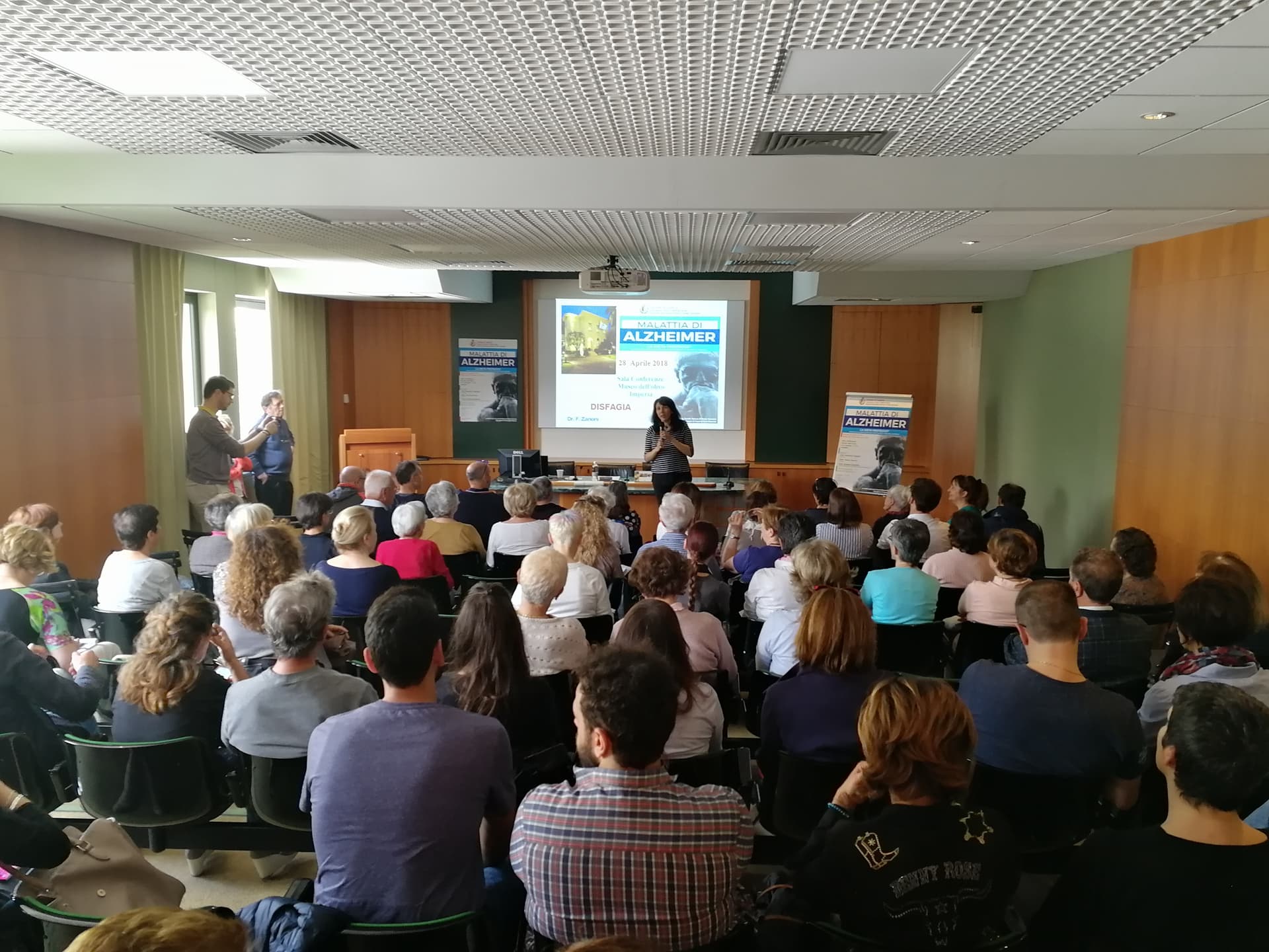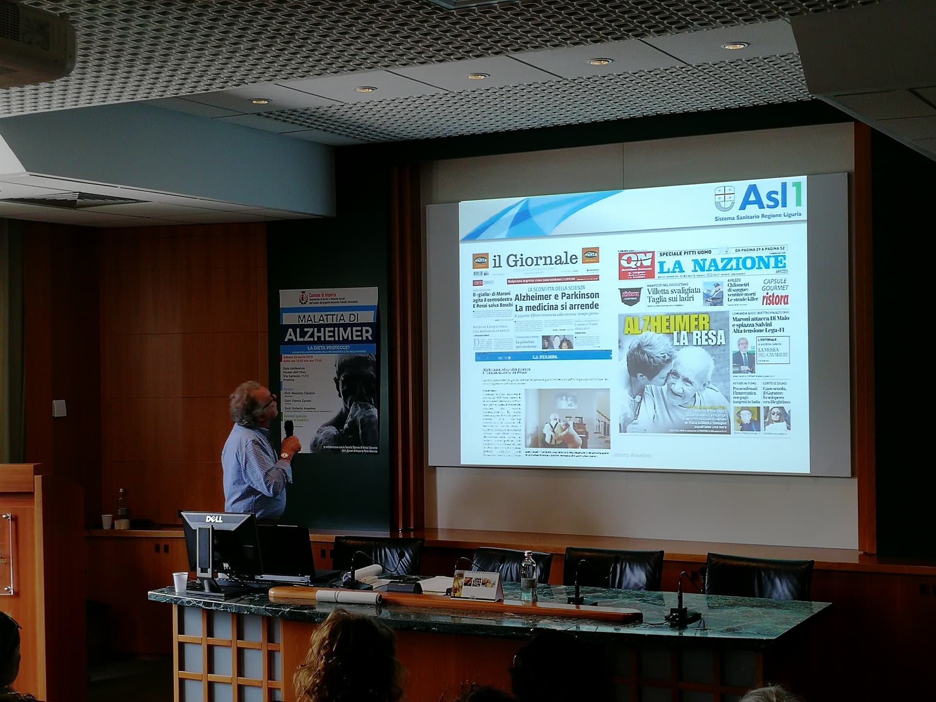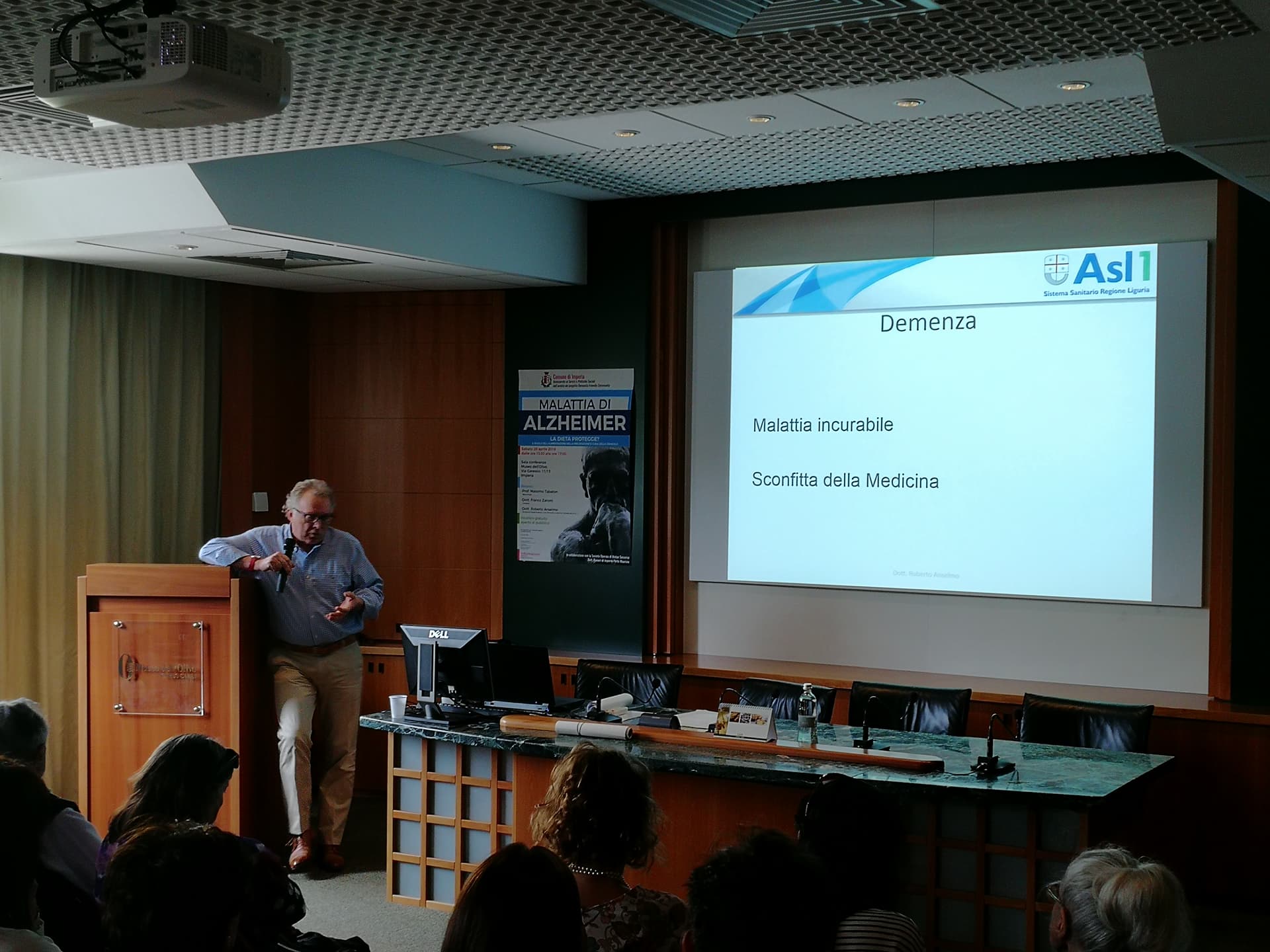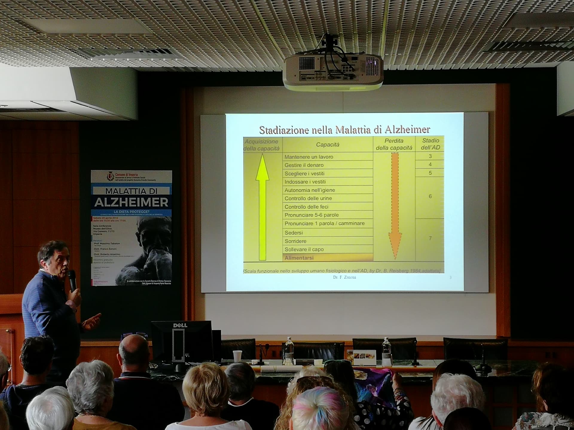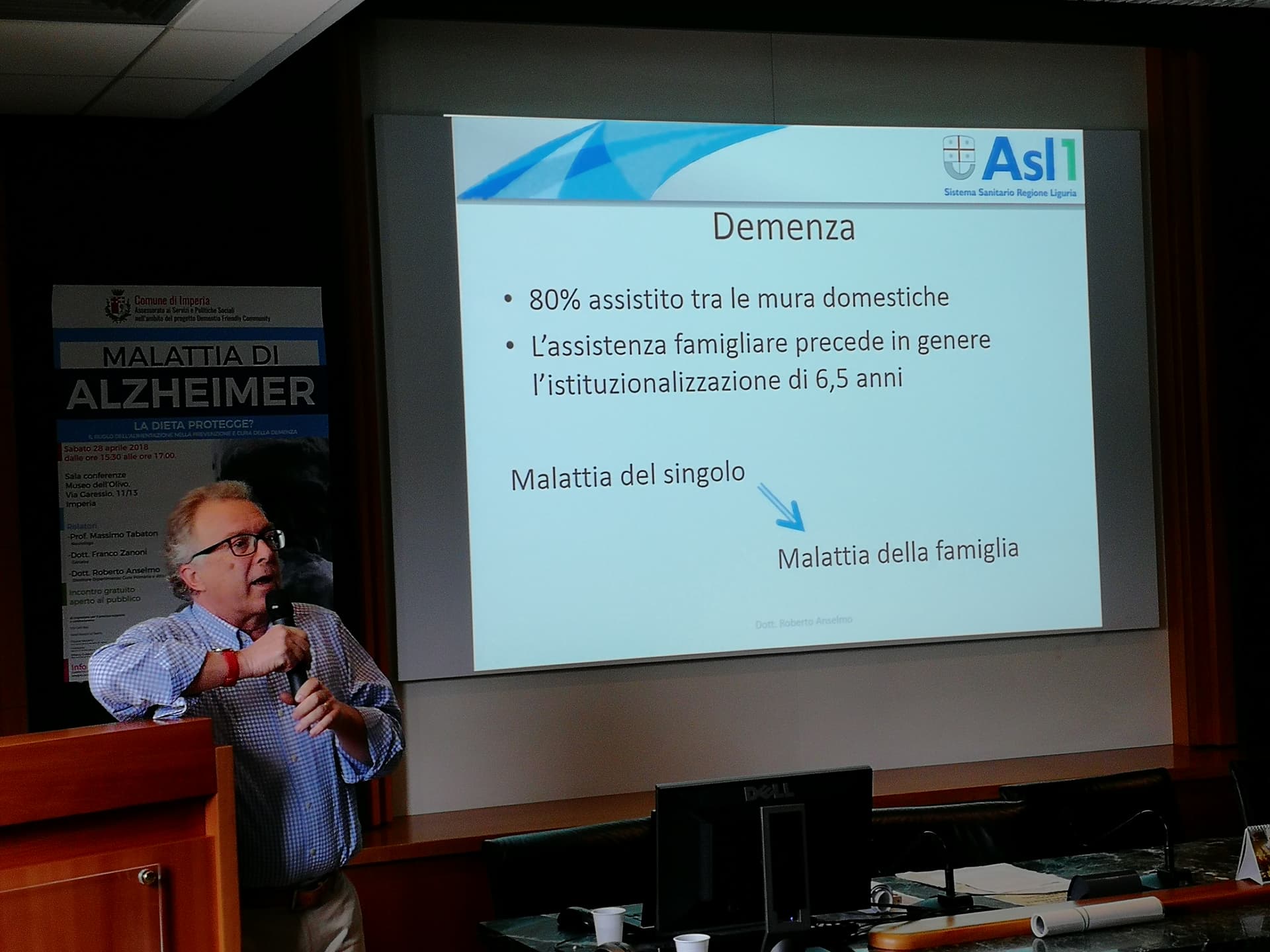 Relatori dell’evento il Dott. Anselmo (Geriatra, gerontologo, neurofisiopatologo – ASL 1 Imperiese), che ha illustrato il progetto di matrice comunale sopra citato Dementia Friendly Community, svolto in collaborazione con ASL 1 Imperiese, Federazione Alzheimer Italia/Liguria e A.LI.SA., il Dott. Zanoni (Specialista in geriatria e gerontologia) – ASL 1 Imperiese) che ha spiegato l’efficacia di una dieta adeguata da somministrare al paziente malato di Alzheimer in particolare se affetto anche da disfagia.