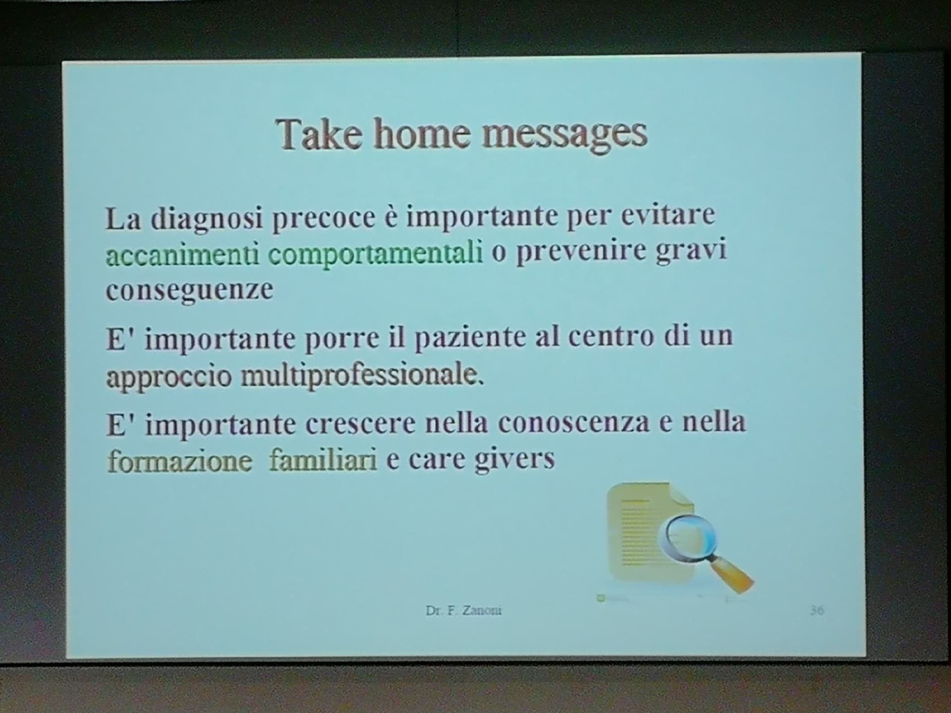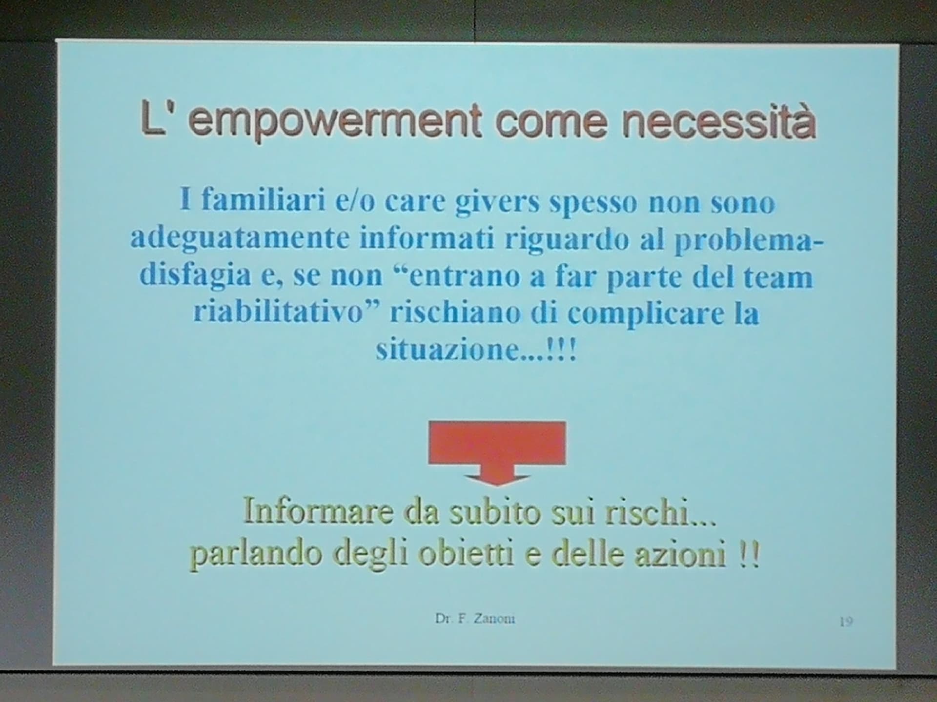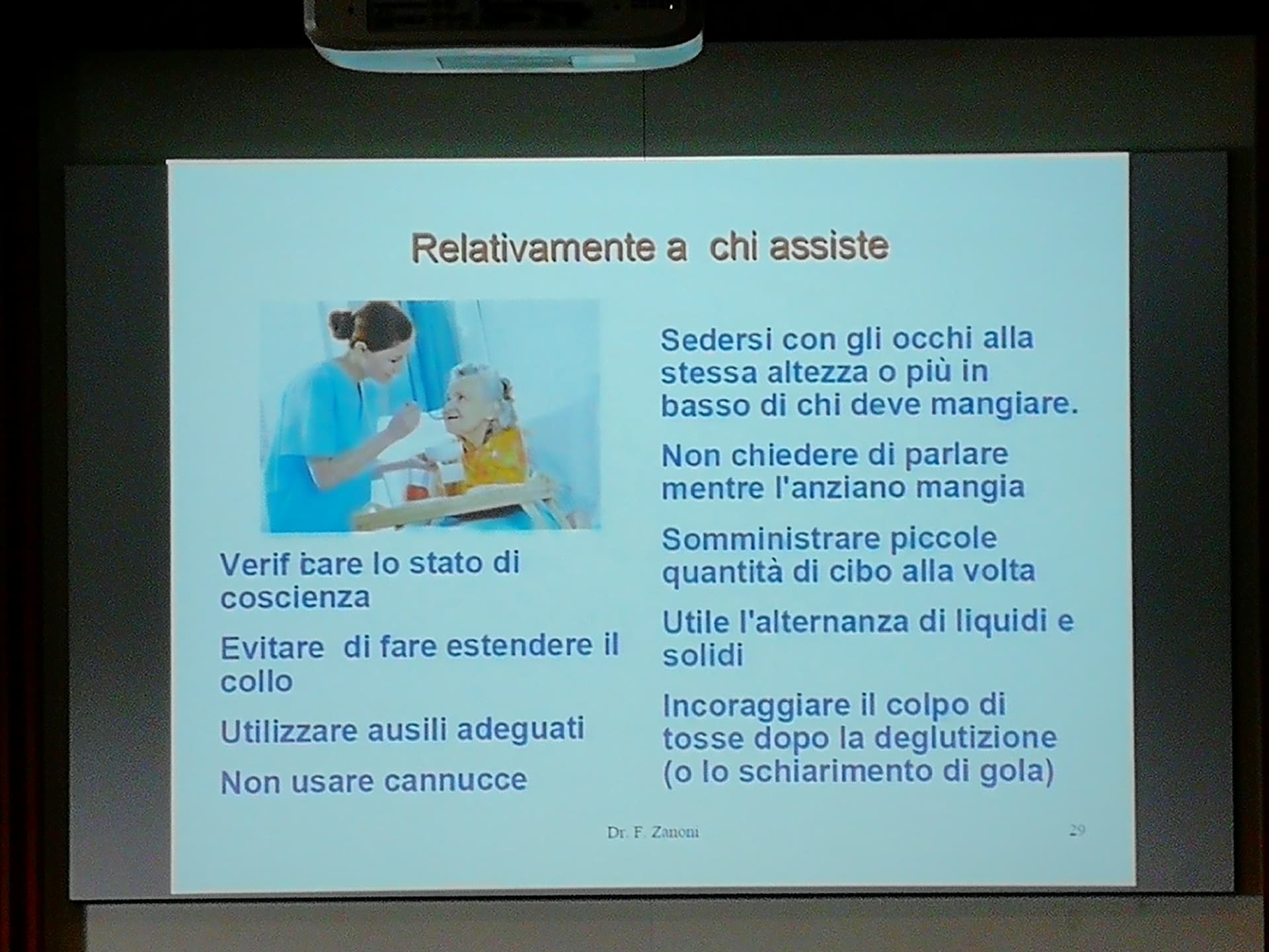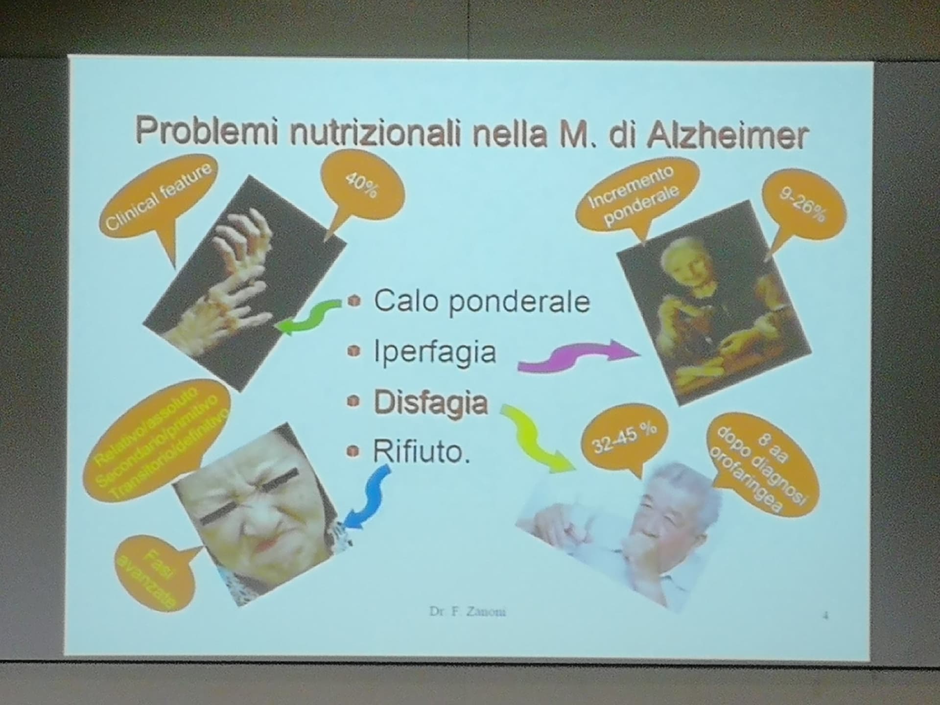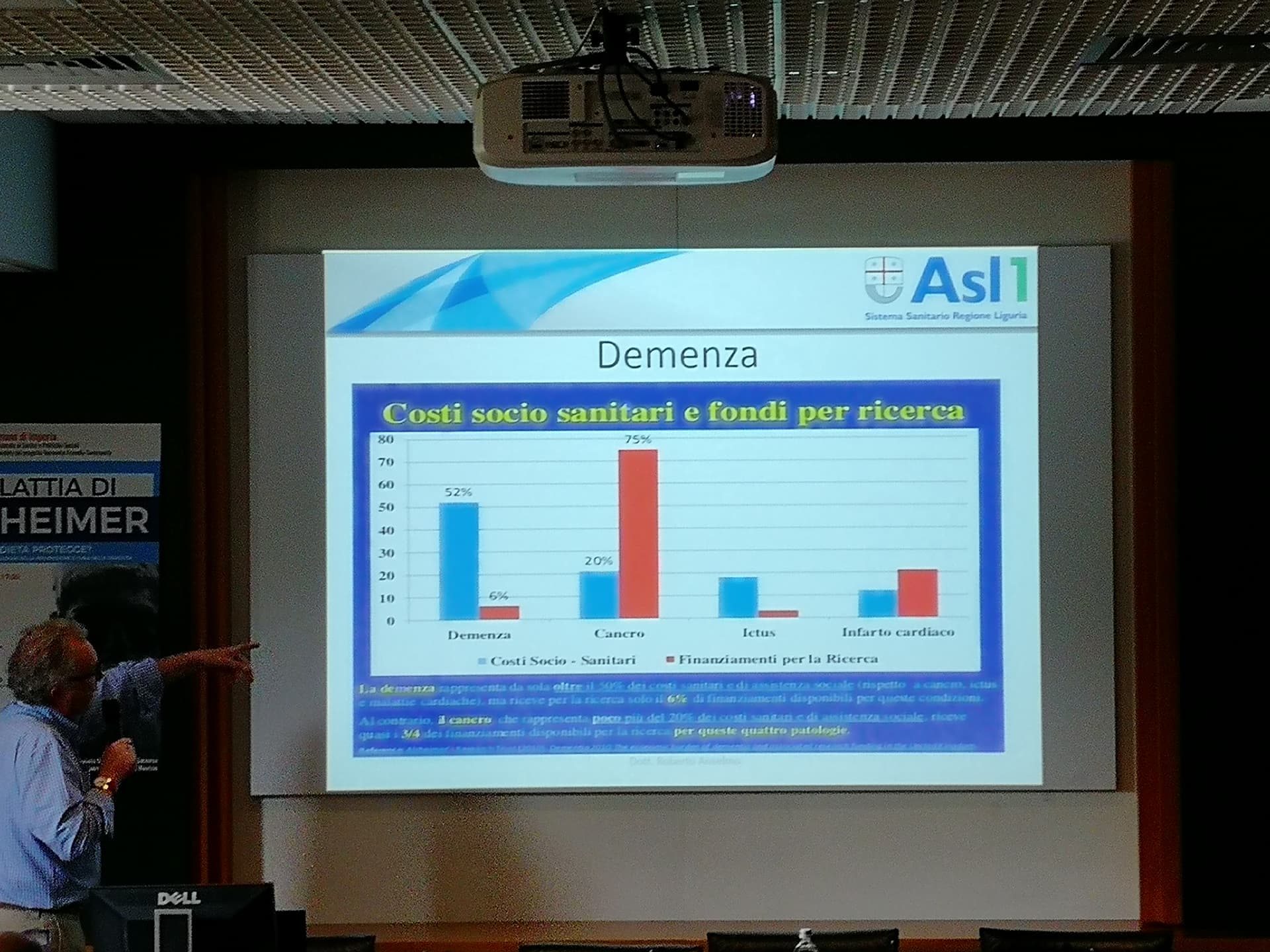 Relatori dell’evento il Dott. Anselmo (Geriatra, gerontologo, neurofisiopatologo – ASL 1 Imperiese), che ha illustrato il progetto di matrice comunale sopra citato Dementia Friendly Community, svolto in collaborazione con ASL 1 Imperiese, Federazione Alzheimer Italia/Liguria e A.LI.SA., il Dott. Zanoni (Specialista in geriatria e gerontologia) – ASL 1 Imperiese) che ha spiegato l’efficacia di una dieta adeguata da somministrare al paziente malato di Alzheimer in particolare se affetto anche da disfagia.