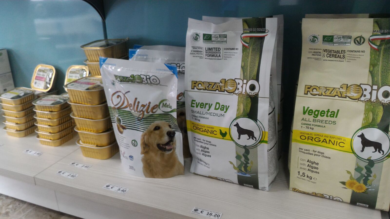 Un angolo importante della farmacia è dedicato ai quattro zampe, con cibo biologico per cani e gatti.