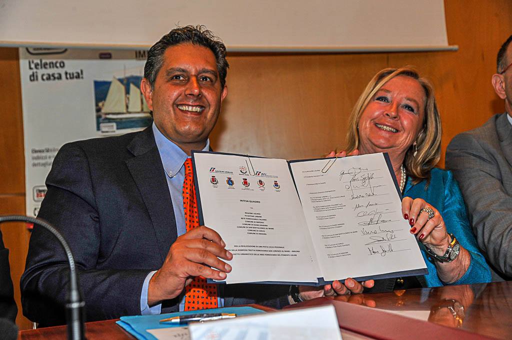 Presenti alla firma il Presidente di Regione Liguria Giovanni Toti, l’Assessore regionale all’Urbanistica Marco Scajola e quello alle Infrastrutture Giacomo Giampedrone, i primi cittadini di Imperia Carlo Capacci, di Diano Marina Giacomo Chiappori, di San Bartolomeo al Mare Valerio Urso, di Cervo Gian Paolo Giordano, di Andora Mauro Demichelis, il direttore della Direzione Produzione Genova di RFI, Marco Torassa e la responsabile Centro e Nord Ovest di FS Sistemi Urbani, Norberta Valentino.