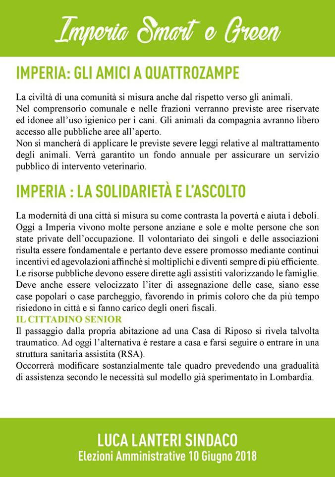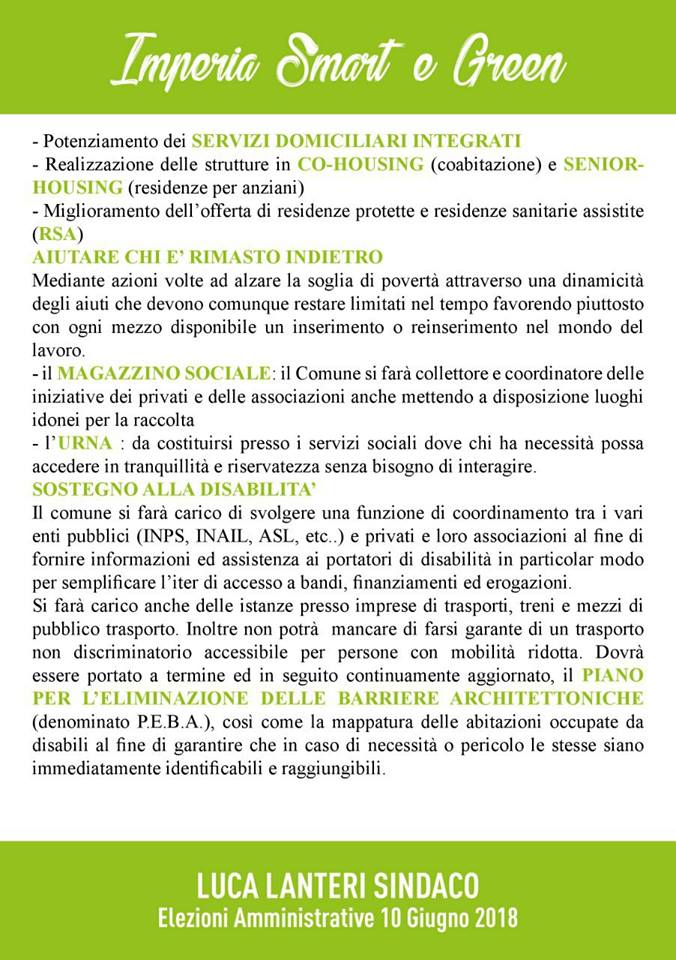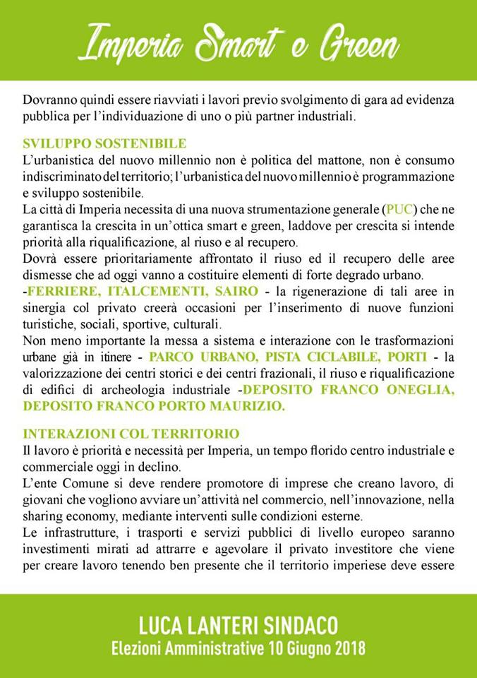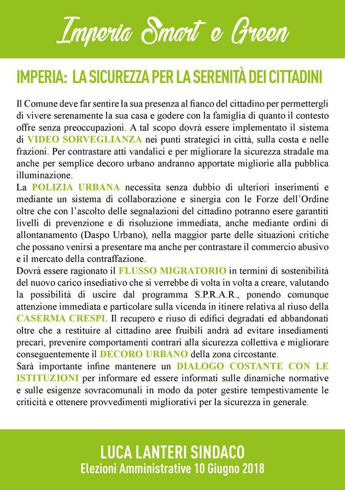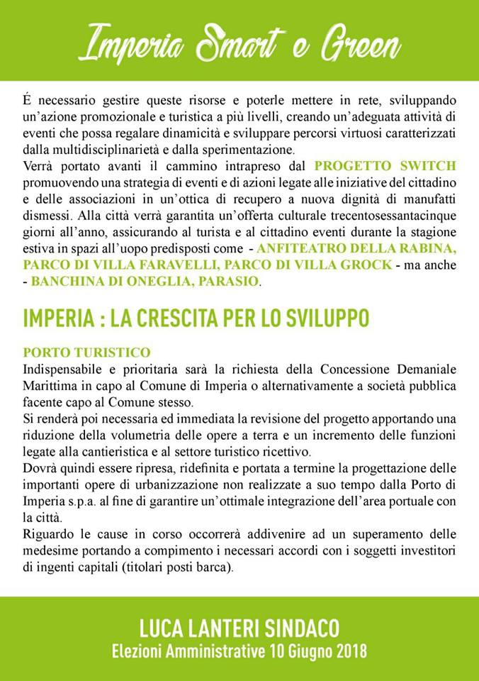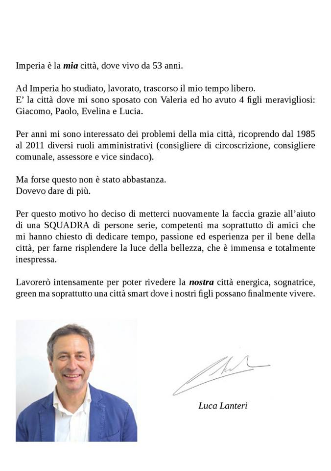 Il primo che ha reso noto il suo programma elettorale, lo ha fatto tramite la pubblicazione del testo sulla sua pagina Facebook, è stato il candidato del centrodestra Luca Lanteri, appoggiato dalle liste di Forza Italia, Lega, Fratelli d’Italia e dalle due liste civiche: “Progetto Imperia” e Vince Imperia”.