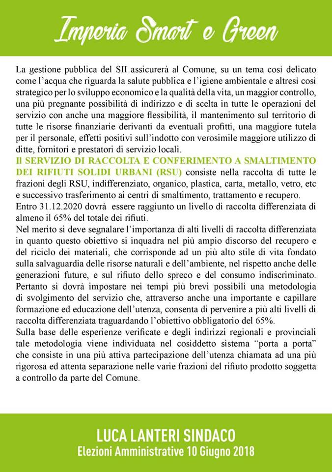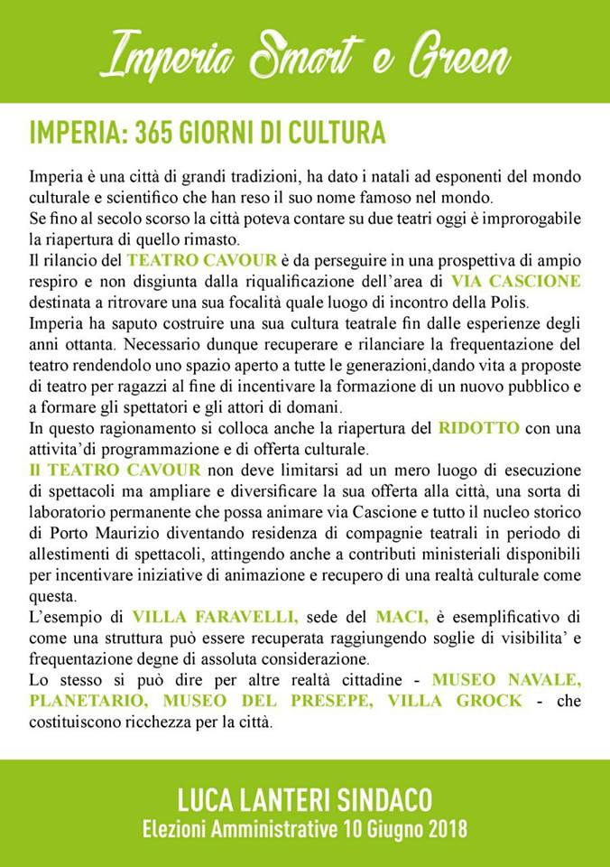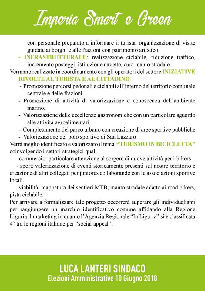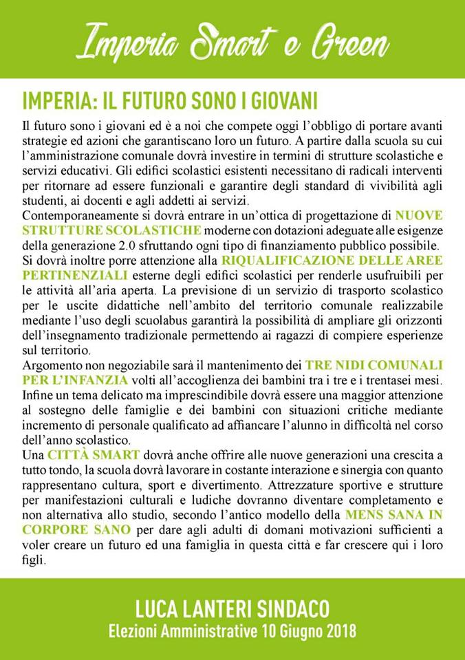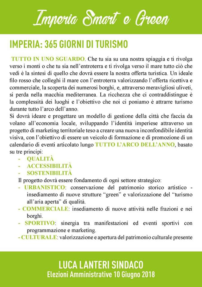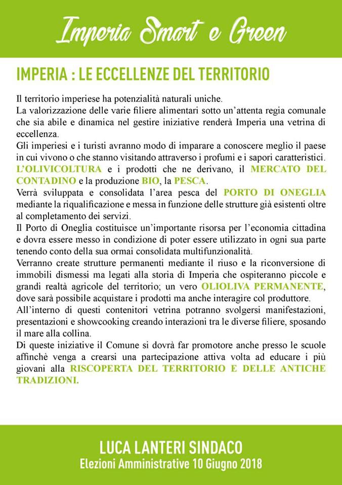 Il primo che ha reso noto il suo programma elettorale, lo ha fatto tramite la pubblicazione del testo sulla sua pagina Facebook, è stato il candidato del centrodestra Luca Lanteri, appoggiato dalle liste di Forza Italia, Lega, Fratelli d’Italia e dalle due liste civiche: “Progetto Imperia” e Vince Imperia”.