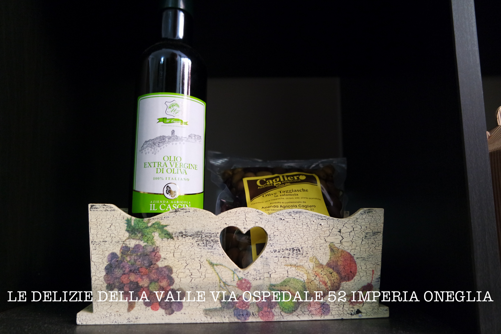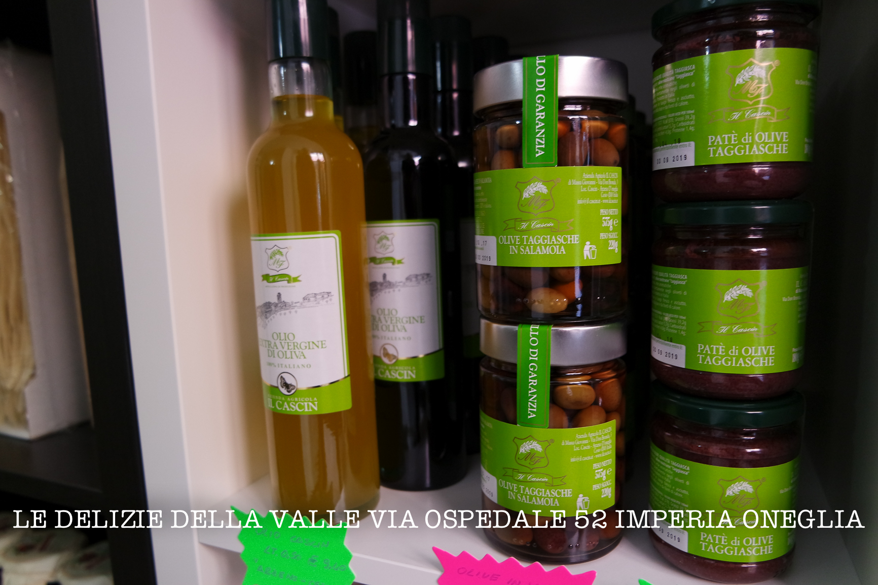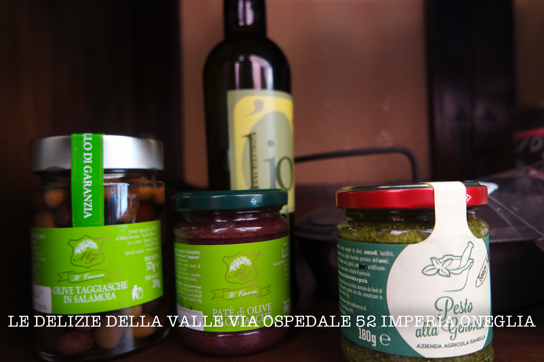 - Olio (Evo), olive, il paté e il vino (Vermentino, Pigato, Rosato, Rosso e la Granaccia) de “Il Cascin di Arzeno di Oneglia”.