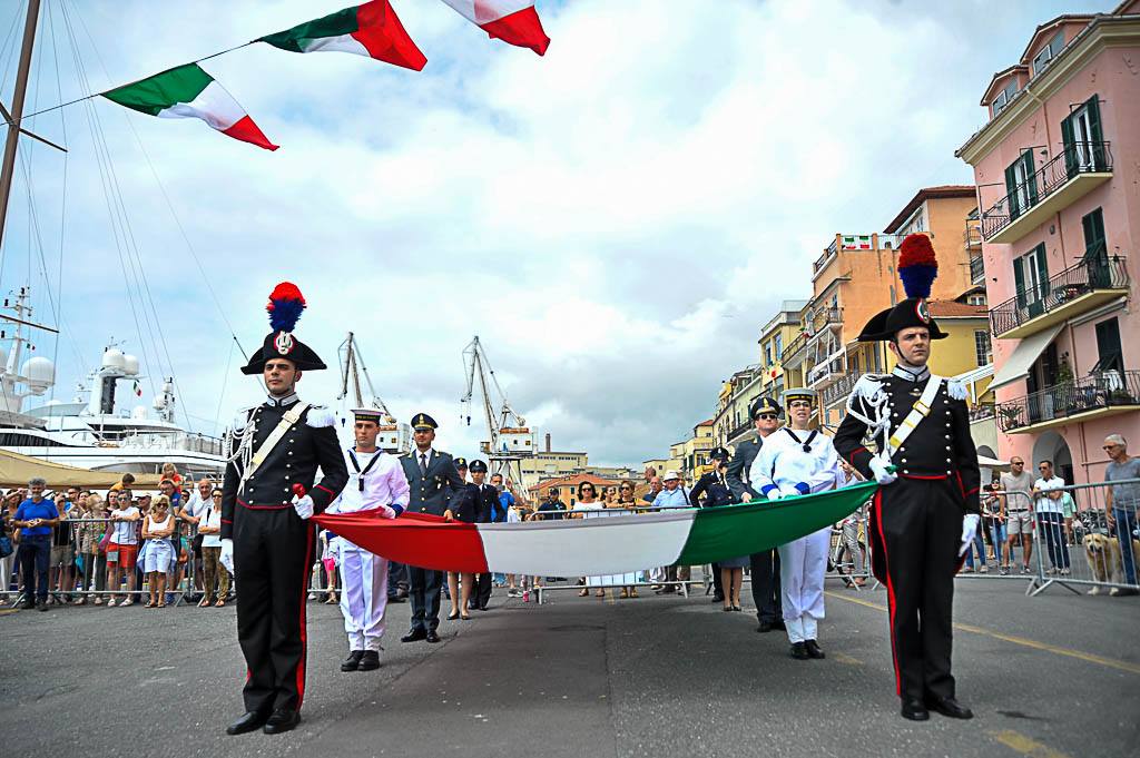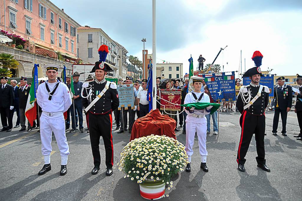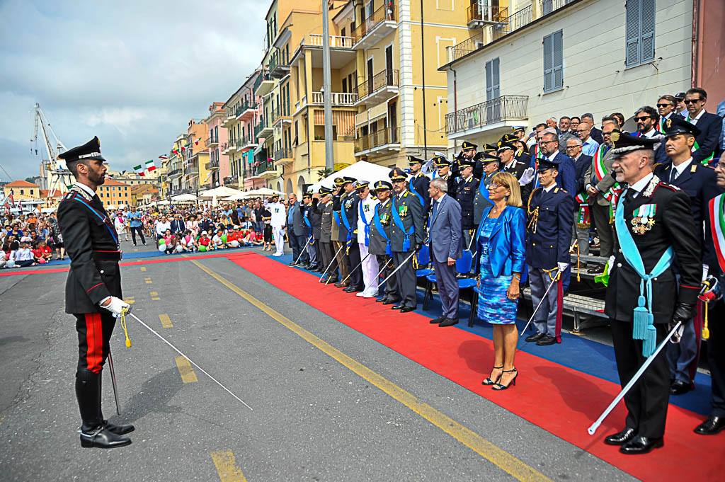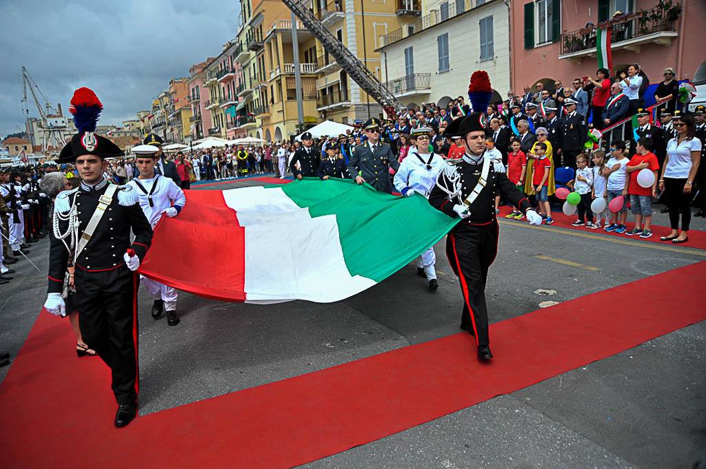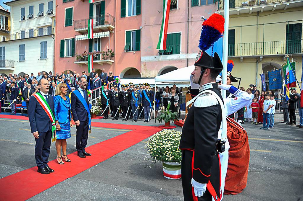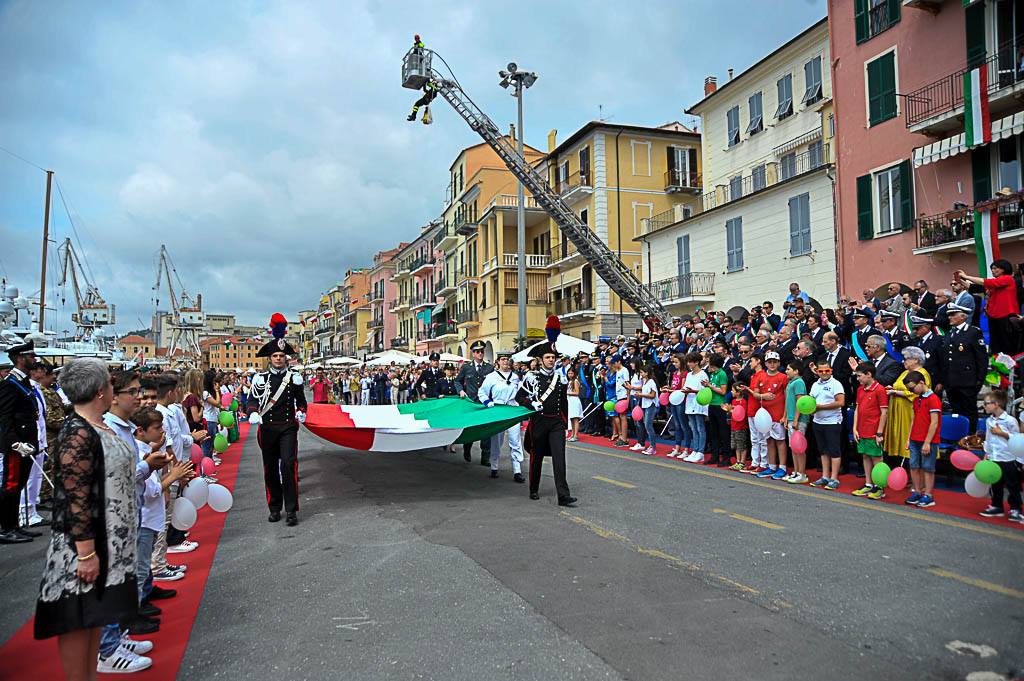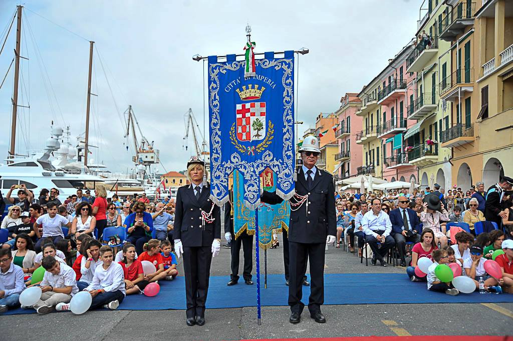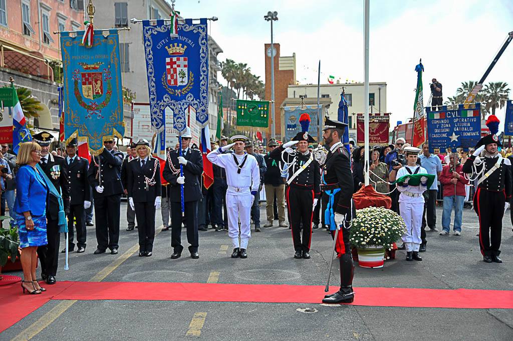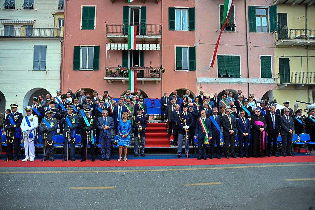 Presenti il sindaco di Imperia Carlo Capacci, il presidente della Provincia Fabio Natta, il prefetto Silvana Tizzano e le massime autorità civili e militari della provincia. Presenti anche le forze dell’ordine e i soccorritori attivi sul territorio che hanno assistito ai festeggiamenti anche a bordo dei mezzi nautici direttamente dalle acque del porto di Oneglia. Novità di quest`anno, sulle note del “Va pensiero”, ad accompagnare l’unità navale della guardia di finanza che dal mare ha portato il tricolore, l’elicottero dei carabinieri di Imperia.