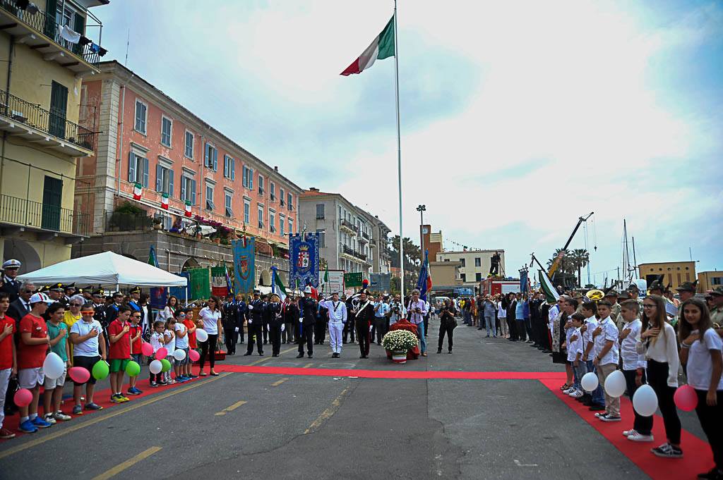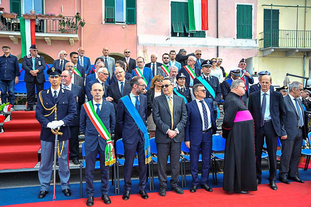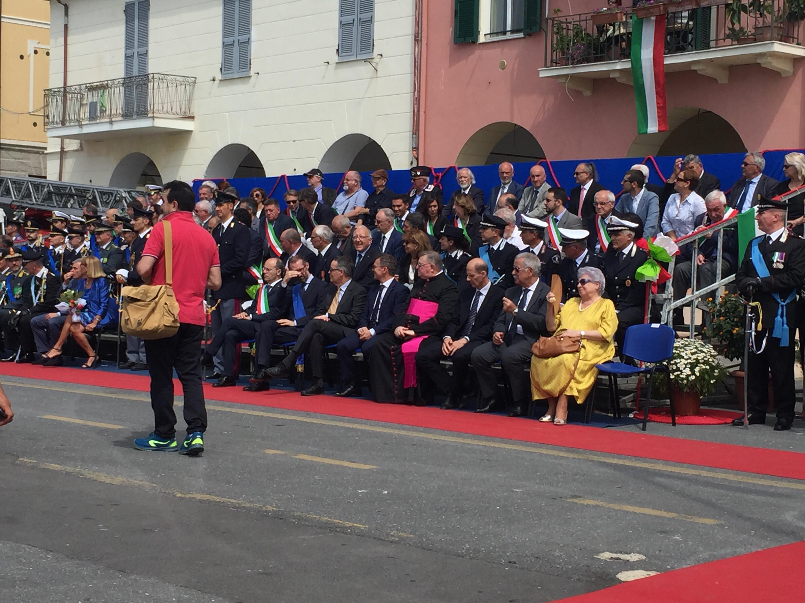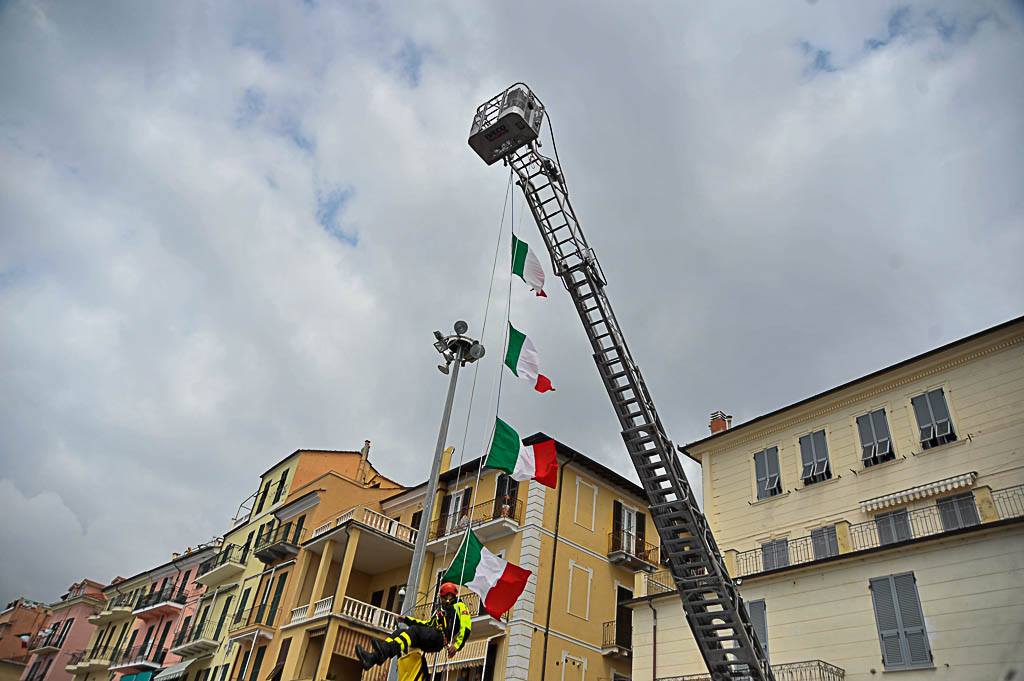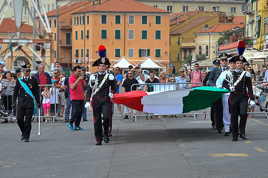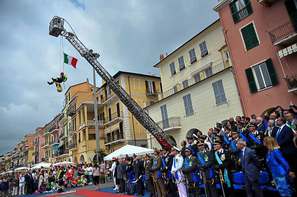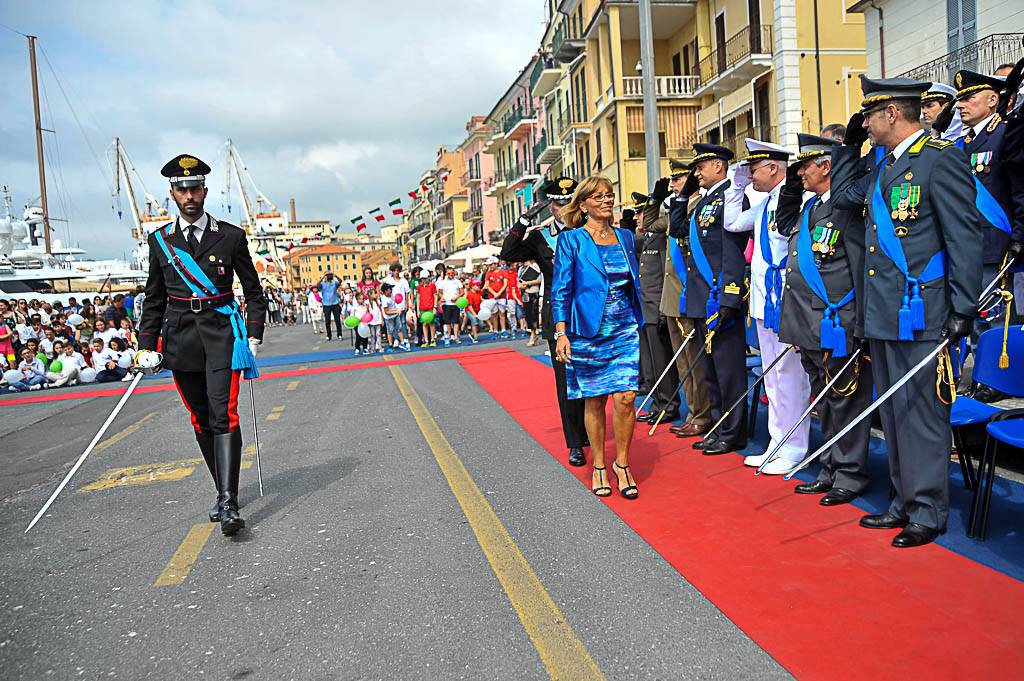Presenti il sindaco di Imperia Carlo Capacci, il presidente della Provincia Fabio Natta, il prefetto Silvana Tizzano e le massime autorità civili e militari della provincia. Presenti anche le forze dell’ordine e i soccorritori attivi sul territorio che hanno assistito ai festeggiamenti anche a bordo dei mezzi nautici direttamente dalle acque del porto di Oneglia. Novità di quest`anno, sulle note del “Va pensiero”, ad accompagnare l’unità navale della guardia di finanza che dal mare ha portato il tricolore, l’elicottero dei carabinieri di Imperia.