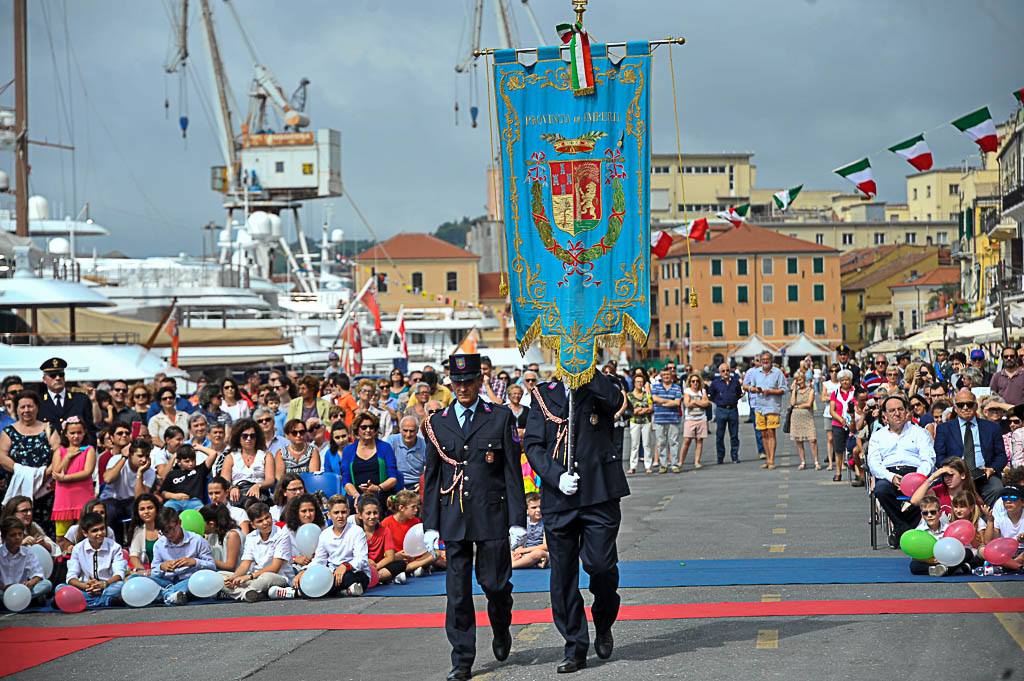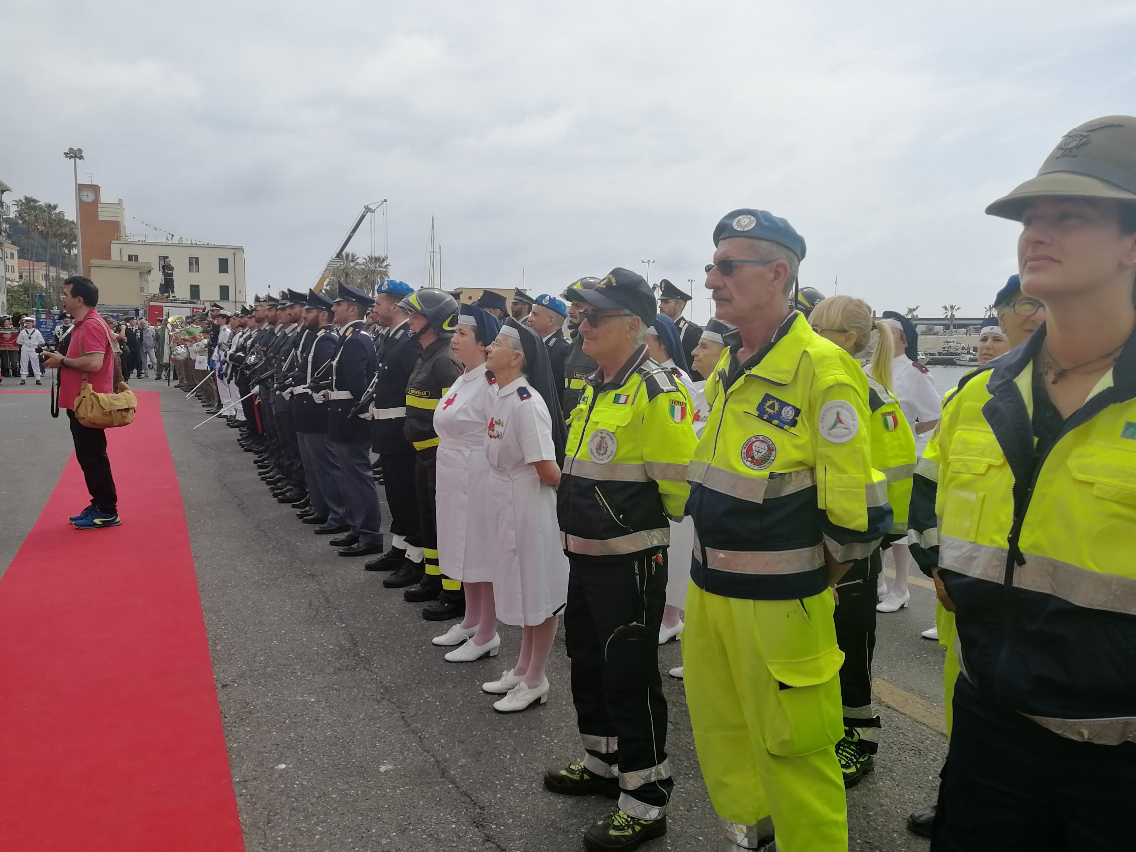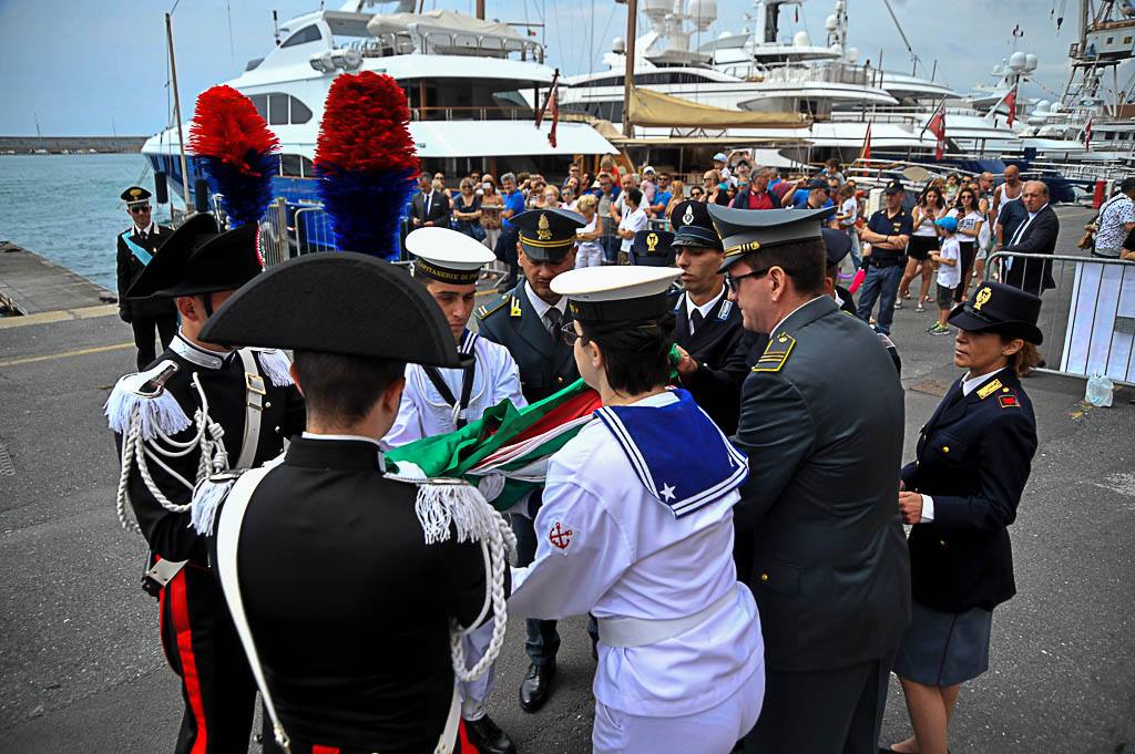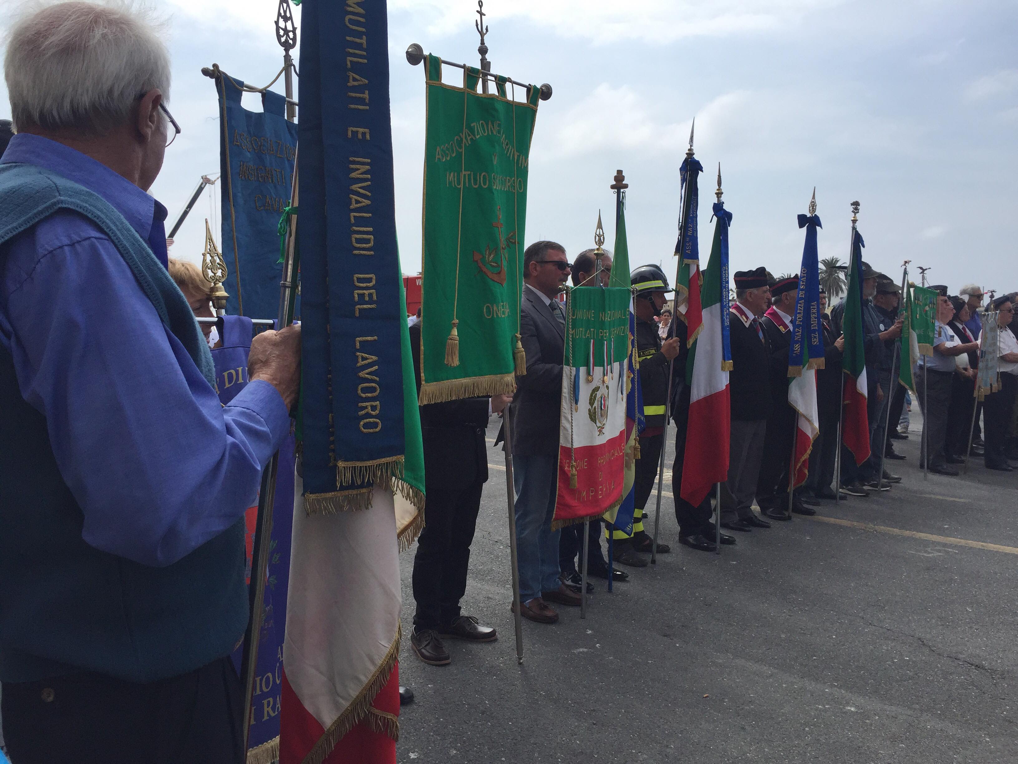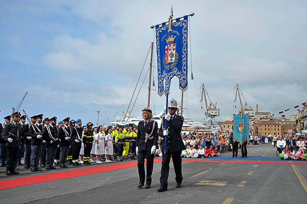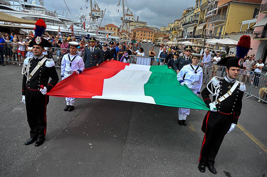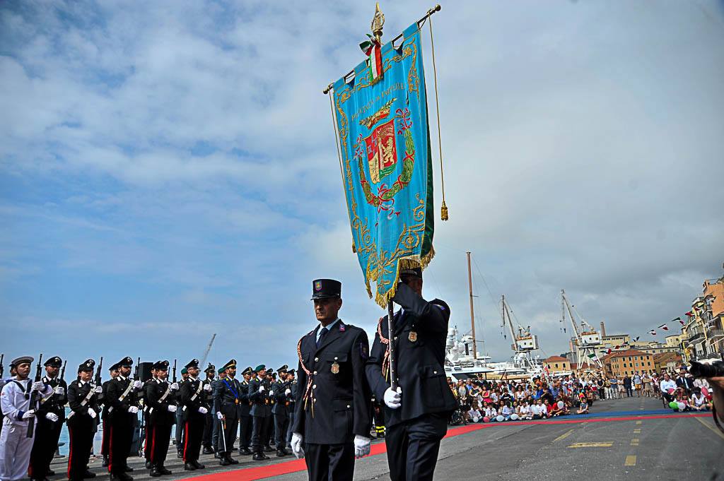 Presenti il sindaco di Imperia Carlo Capacci, il presidente della Provincia Fabio Natta, il prefetto Silvana Tizzano e le massime autorità civili e militari della provincia. Presenti anche le forze dell’ordine e i soccorritori attivi sul territorio che hanno assistito ai festeggiamenti anche a bordo dei mezzi nautici direttamente dalle acque del porto di Oneglia. Novità di quest`anno, sulle note del “Va pensiero”, ad accompagnare l’unità navale della guardia di finanza che dal mare ha portato il tricolore, l’elicottero dei carabinieri di Imperia.